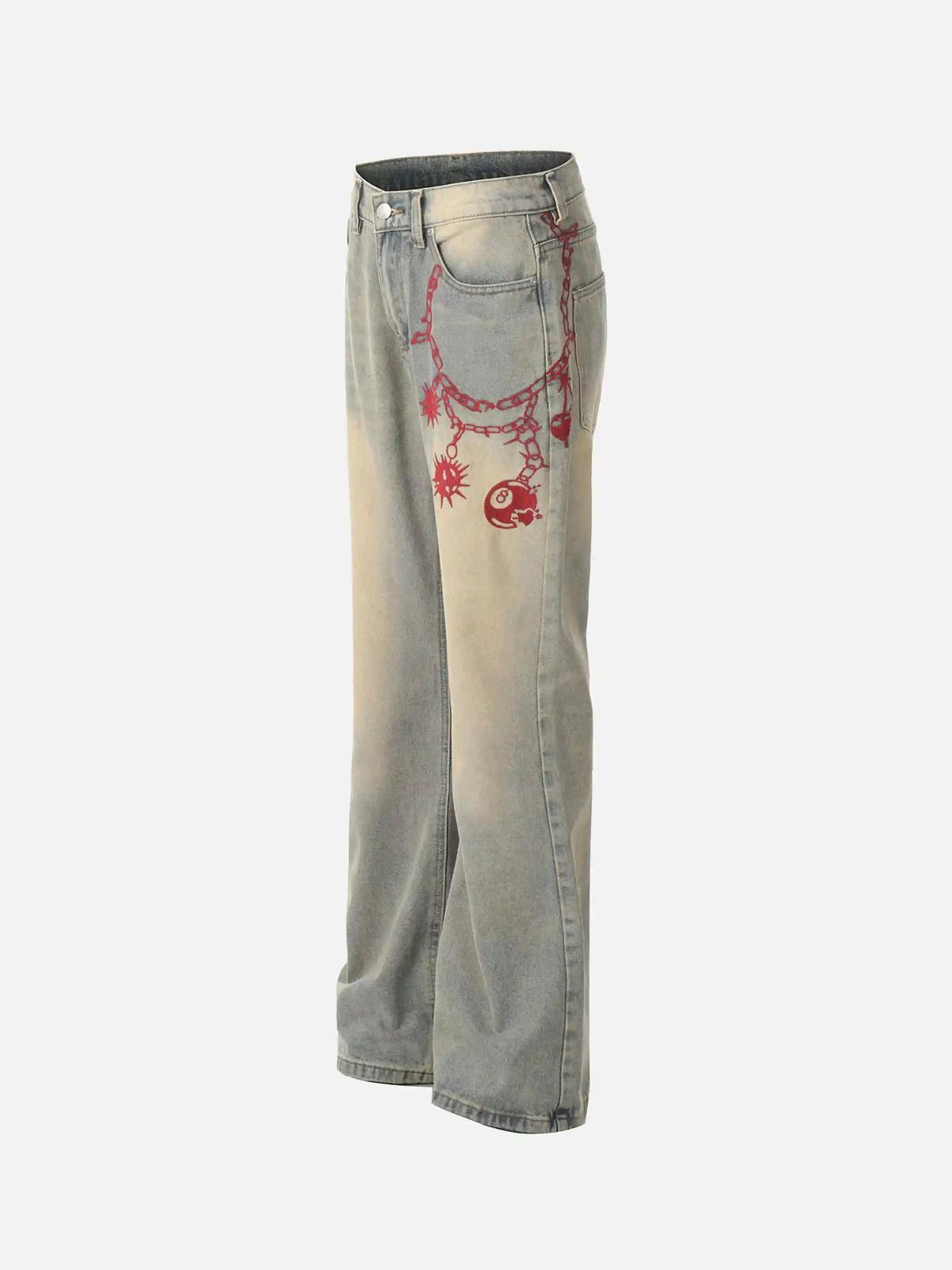 Revamp your wardrobe with these edgy jeans, where vintage vibes meet modern streetwear fashion. The washed-out blue denim serves as a bold canvas for the striking red chain graphic that wraps around like a statement piece, perfect for those who dare to stand out. Available in sizes ranging from S to XXL, these jeans offer a relaxed fit that pairs effortlessly with your go-to sneakers or boots, making them a versatile staple for any urban adventure. Dive into the world of y2k outfits and let these jeans inspire your next iconic look.