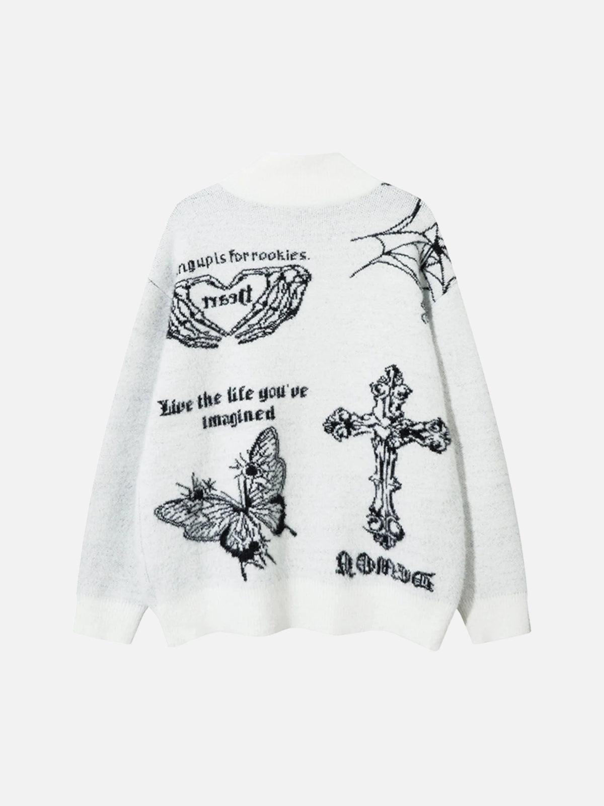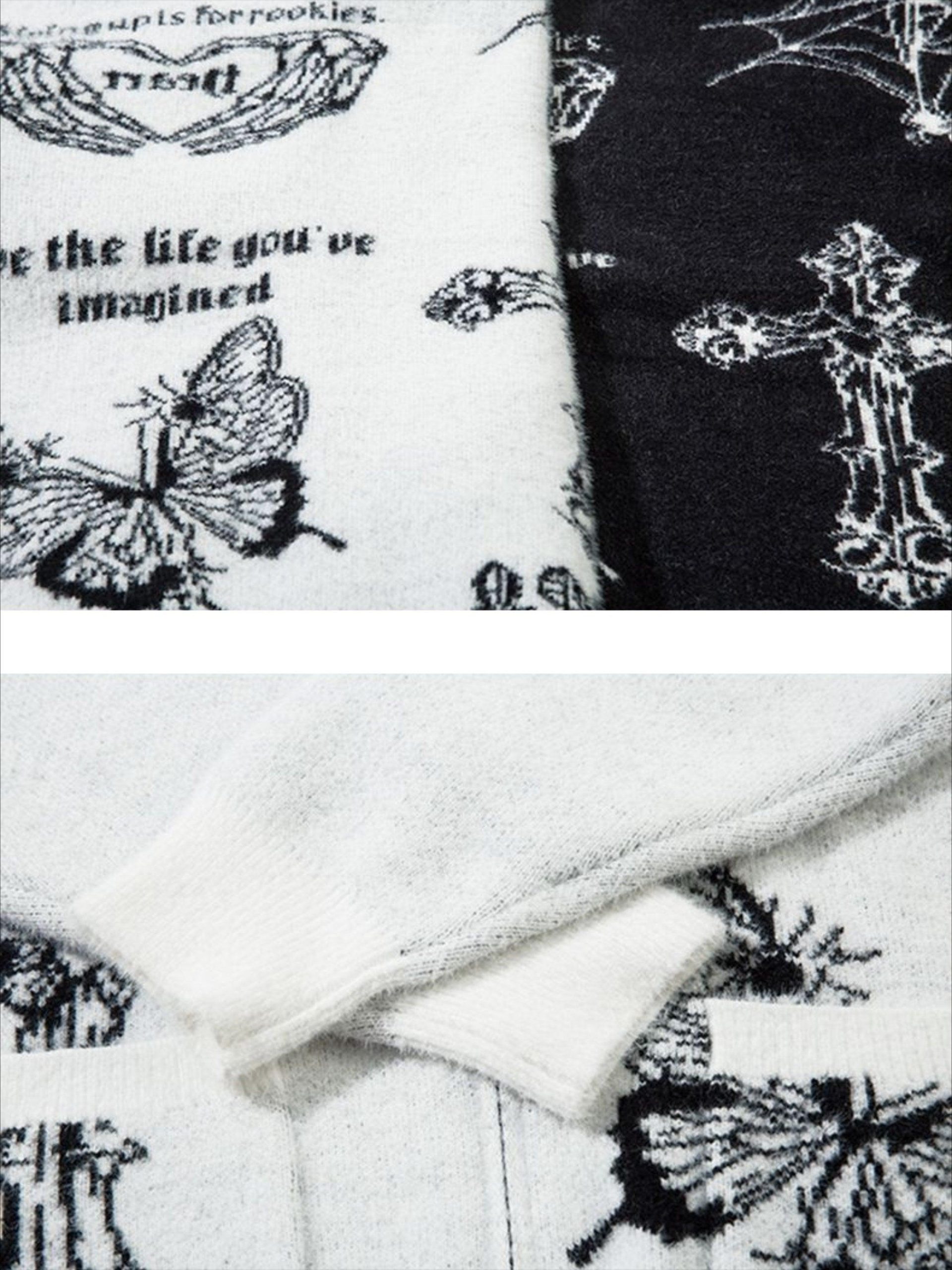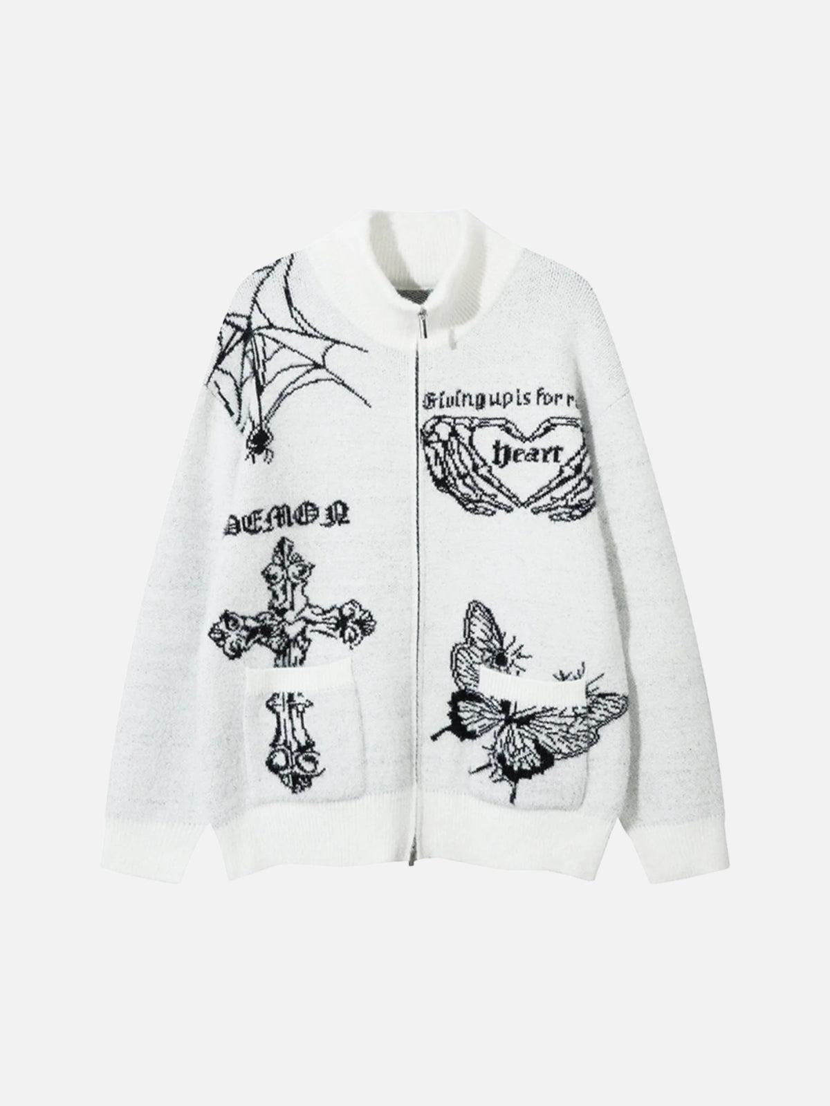 Unearth your boldest self with this striking black and white zip-up jacket, where gothic designs meet streetwear fashion. Intricately woven patterns featuring edgy cross motifs and winged creatures transform this piece into a canvas of rebellion and creativity. The texture is luxuriously soft, wrapping you in comfort while maintaining an effortlessly cool silhouette. Available in sizes ranging from S to XL, this jacket is designed to fit your individual style needs perfectly. Whether paired with your go-to denim or layered over a crisp tee, it’s an essential for those who dare to redefine their wardrobe. Slip into this urban masterpiece and let your outfit speak volumes.