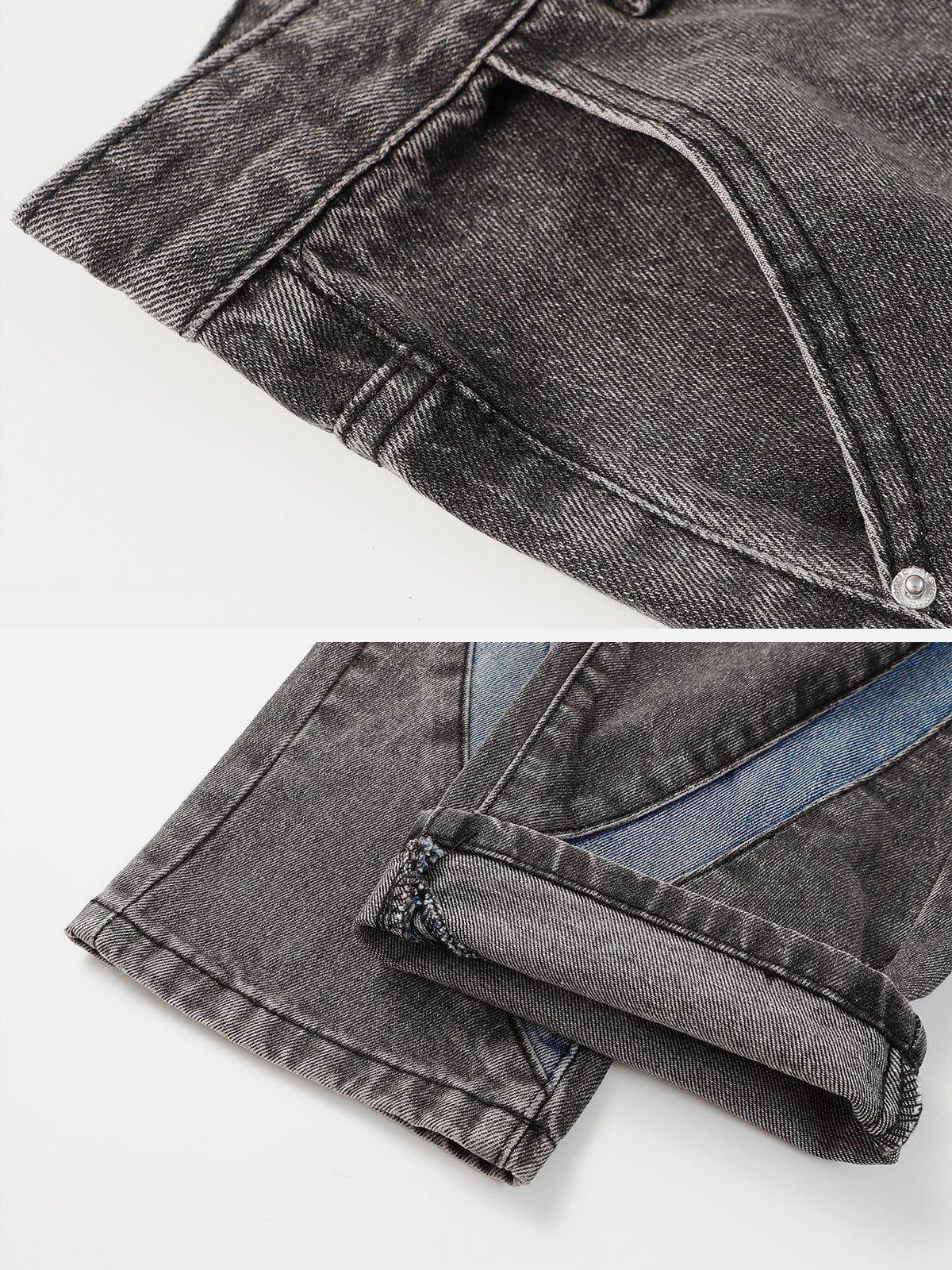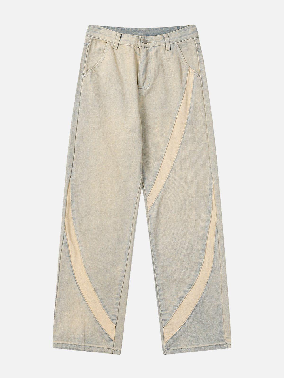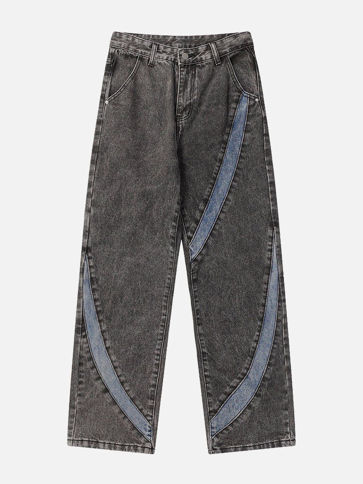 Revolutionize your streetwear fashion with these striking jeans, featuring bold denim panels that carve dynamic arcs against a classic dark wash. The edgy contrast between the deep base and the lighter denim inserts creates a visual flow that turns heads with every step. Designed as a one-size-fits-all staple, these jeans boast a relaxed fit that embraces comfort without sacrificing style, offering endless outfit ideas for any occasion. Pair them with your favorite oversized tee or a sleek cropped jacket for a look that effortlessly balances retro vibes with a modern edge. Slip into these jeans and redefine what it means to stand out on the streets.
