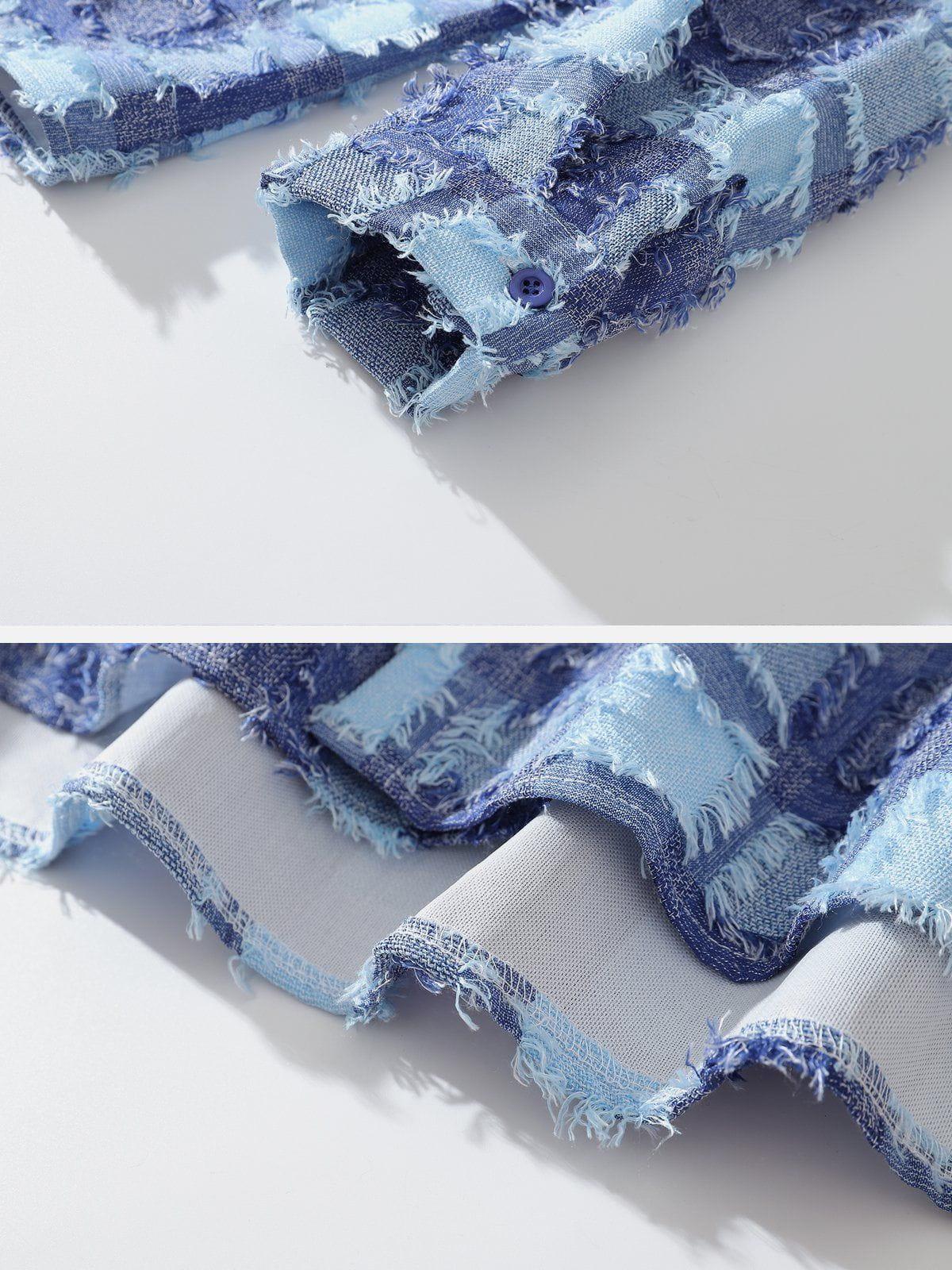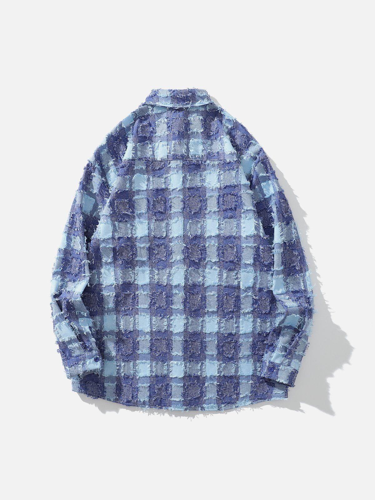 Break boundaries with this textured plaid masterpiece that screams urban edge and bold style. The frayed fabric in shades of deep and light blue creates a dynamic visual impact, perfect for those who embrace streetwear fashion with a twist. Available in sizes S through XL, this piece offers a relaxed fit that effortlessly combines comfort with a rugged aesthetic. Pair it with your favorite black jeans or layer it over a graphic tee for the ultimate Y2K outfit inspo. Dive into a new realm of fashion and redefine your wardrobe’s limits.