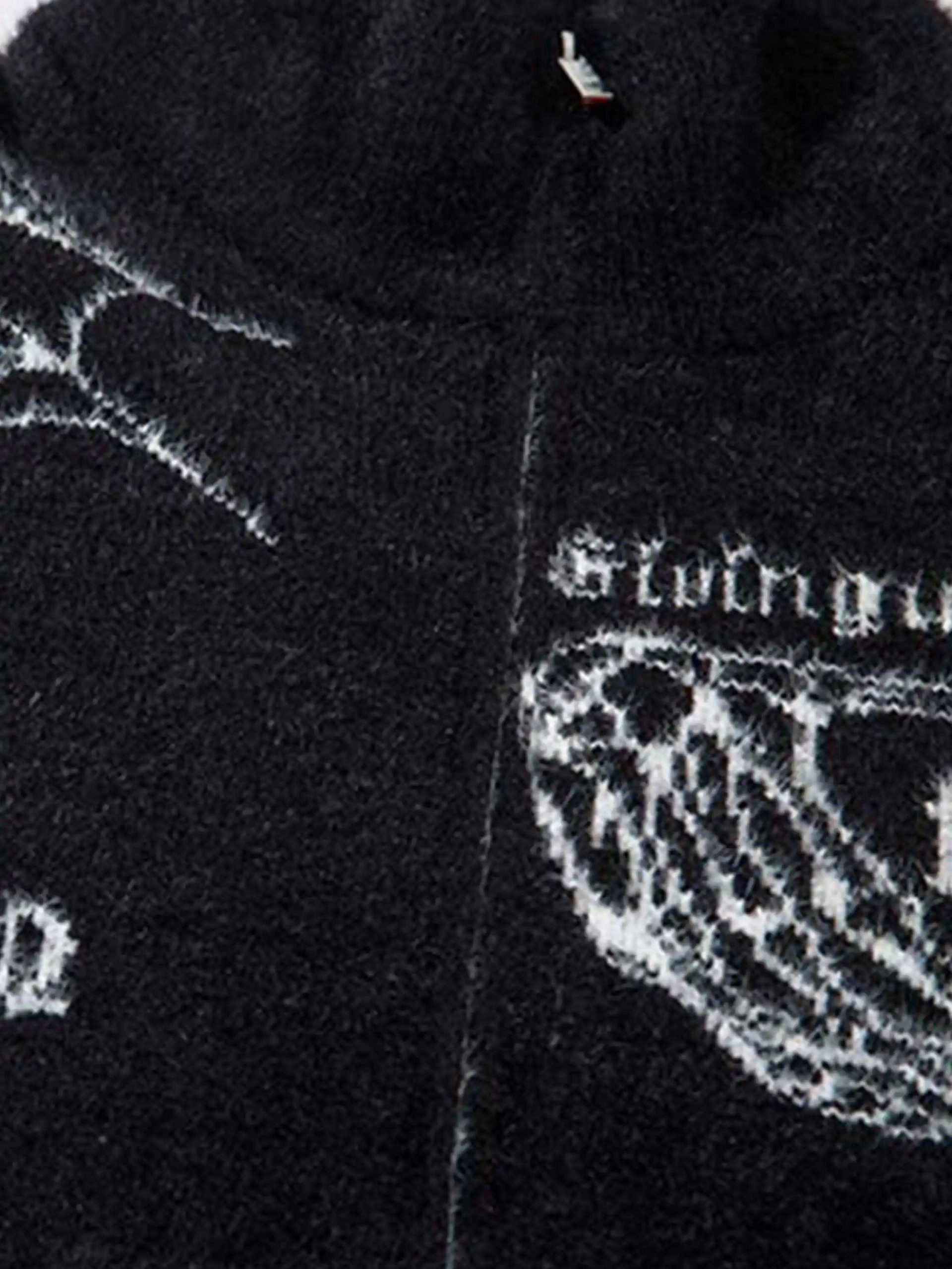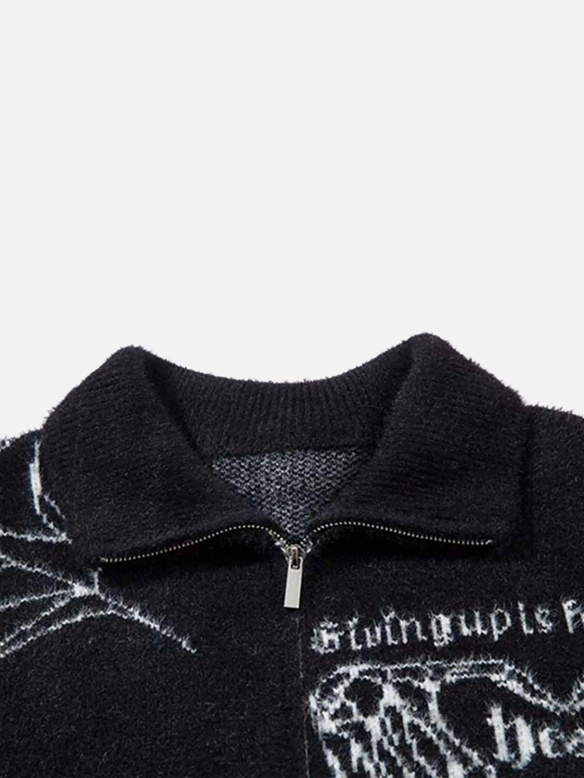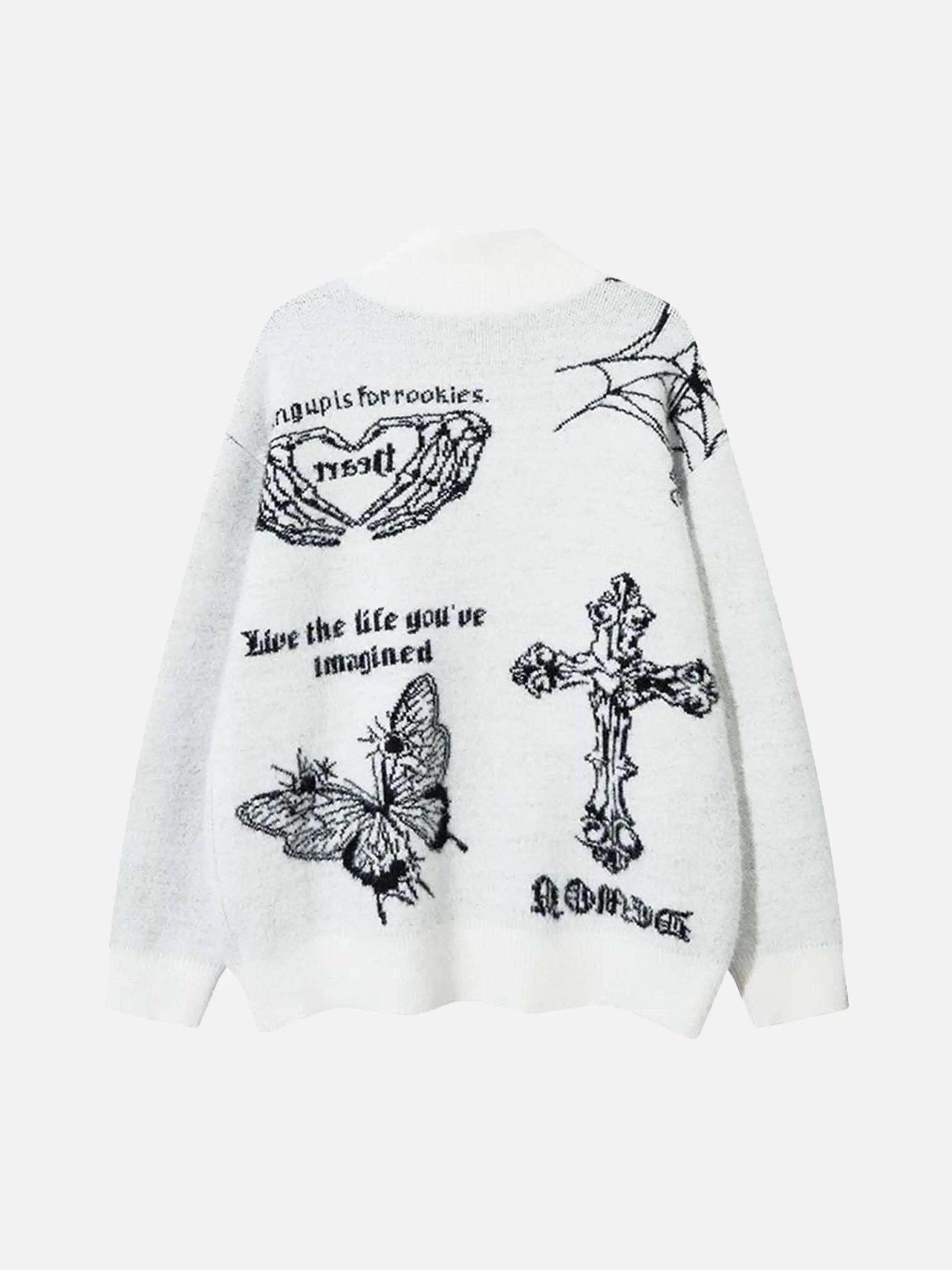 Break the mold with this edgy zip-up sweater, showcasing intricate white graphics that pop against a bold black backdrop. The detailed designs include gothic crosses and striking butterflies, weaving a narrative of fearless streetwear fashion. Crafted for those who defy the ordinary, this piece offers a relaxed fit in sizes ranging from S to XL, ensuring comfort and style. Whether you choose classic black or crisp white, this sweater becomes a canvas for your unique outfit ideas. Pair it with distressed jeans or layer it over a Y2K-inspired look for effortless urban vibes. Ready to redefine your wardrobe?