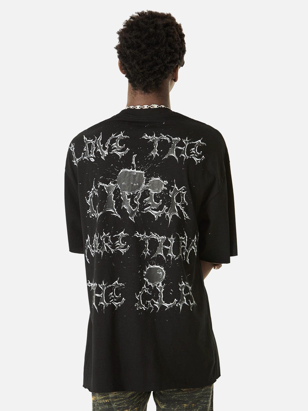 Break the mold with this standout tee, featuring a bold graphic design that commands attention. The distressed black fabric is your canvas for urban expression, while the prominent peace symbol and striking typography bring a message of unity and style. Available in versatile sizes from M to 2XL, this piece is perfect for pairing with your favorite summer outfit. Whether you’re hitting the streets or chilling with friends, let this shirt be your go-to for making a confident impression. Grab yours now and redefine your summer fashion story.