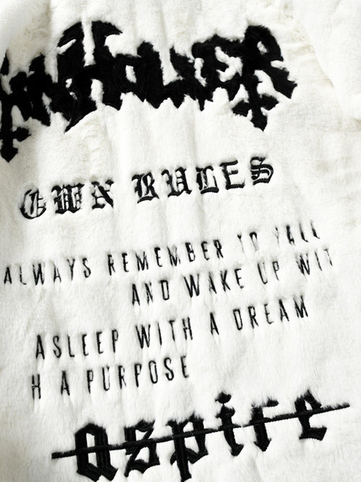 Embrace the unapologetic spirit of urban fashion with this plush jacket that redefines streetwear aesthetics. The soft faux fur texture in a striking white makes it a standout piece, while the bold black emblem on the chest adds a touch of rebellion. Designed for those who own their style, this jacket delivers a cozy fit that effortlessly complements both y2k outfits and modern streetwear fashion. Available in sizes from S to 2XL, it’s perfect for layering over your favorite tees or hoodies. Slip into this statement piece and let your outfit do the talking.