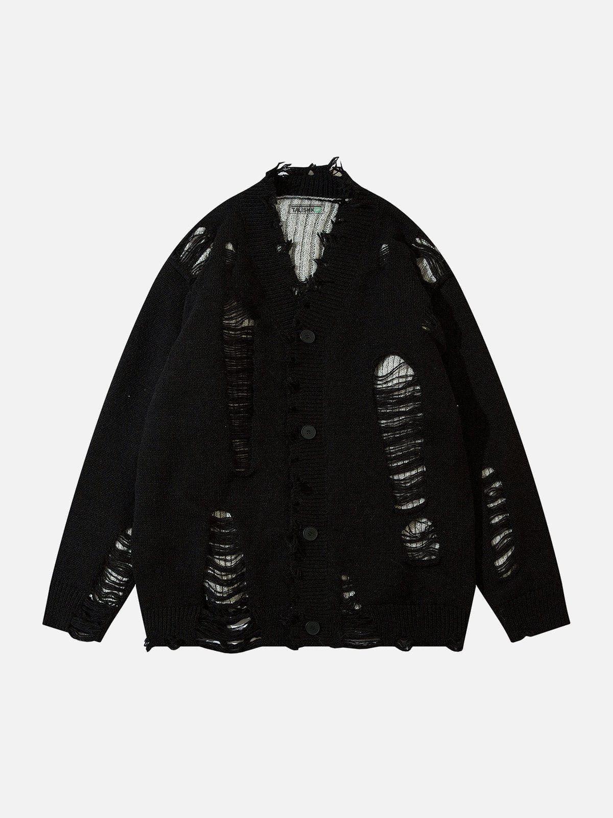 Embrace the raw edge of urban style with this distressed cardigan, where bold texture meets gritty elegance. Its rugged, torn detailing creates a standout look that vibes perfectly with streetwear fashion. Available in a versatile green or sleek black, you can choose the tone that suits your mood. Designed to fit comfortably from XS to XL, this piece layers effortlessly over your favorite Y2K outfits, adding an authentic touch to any ensemble. Pair it with ripped jeans for a complete urban outfit inspo, or throw it over a classic tee for an effortlessly cool vibe. Ready to redefine your wardrobe?