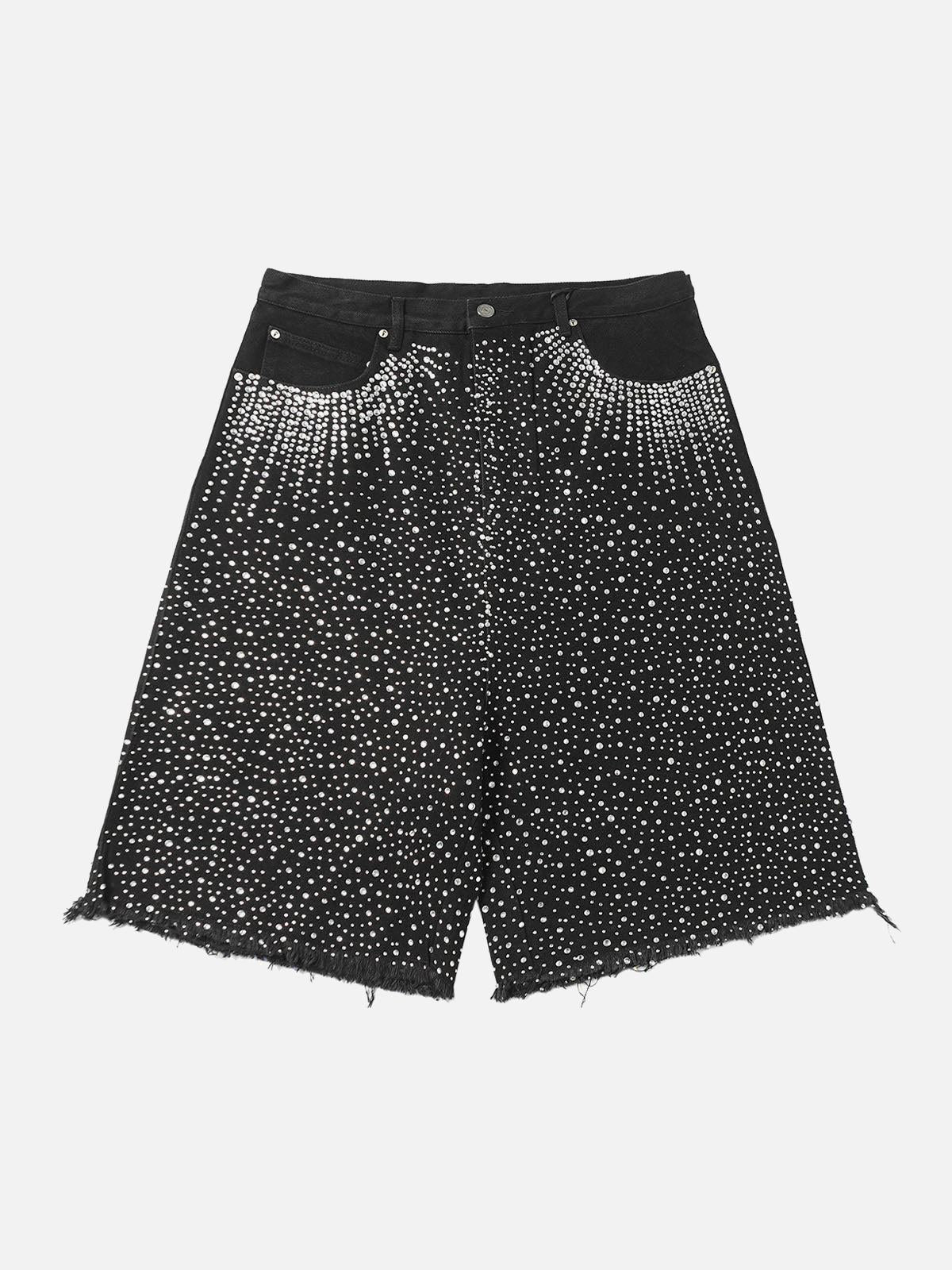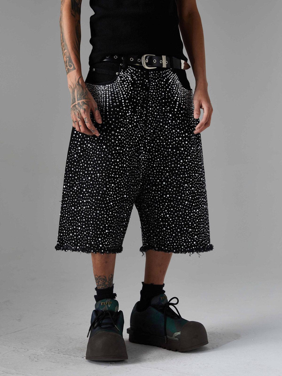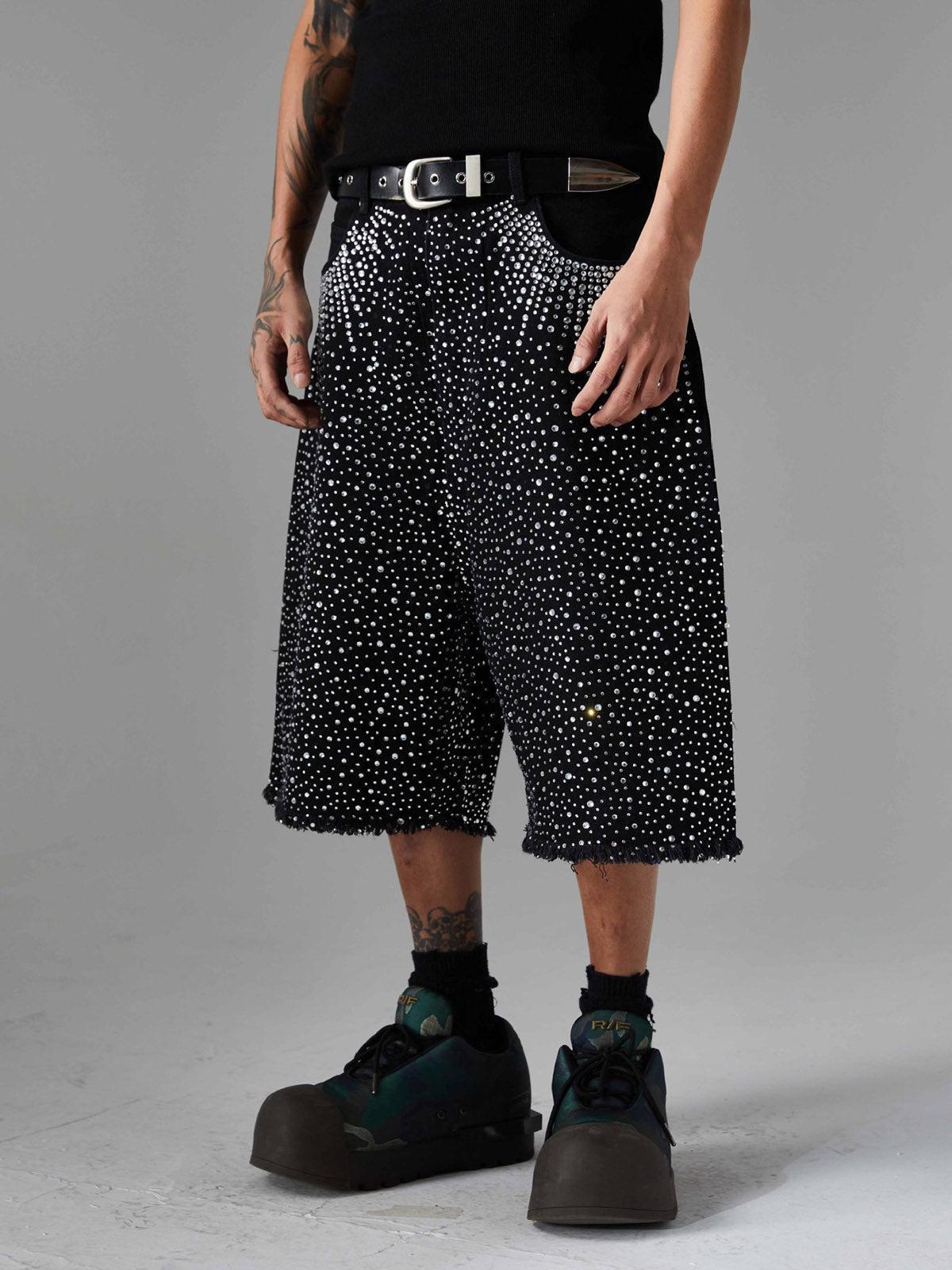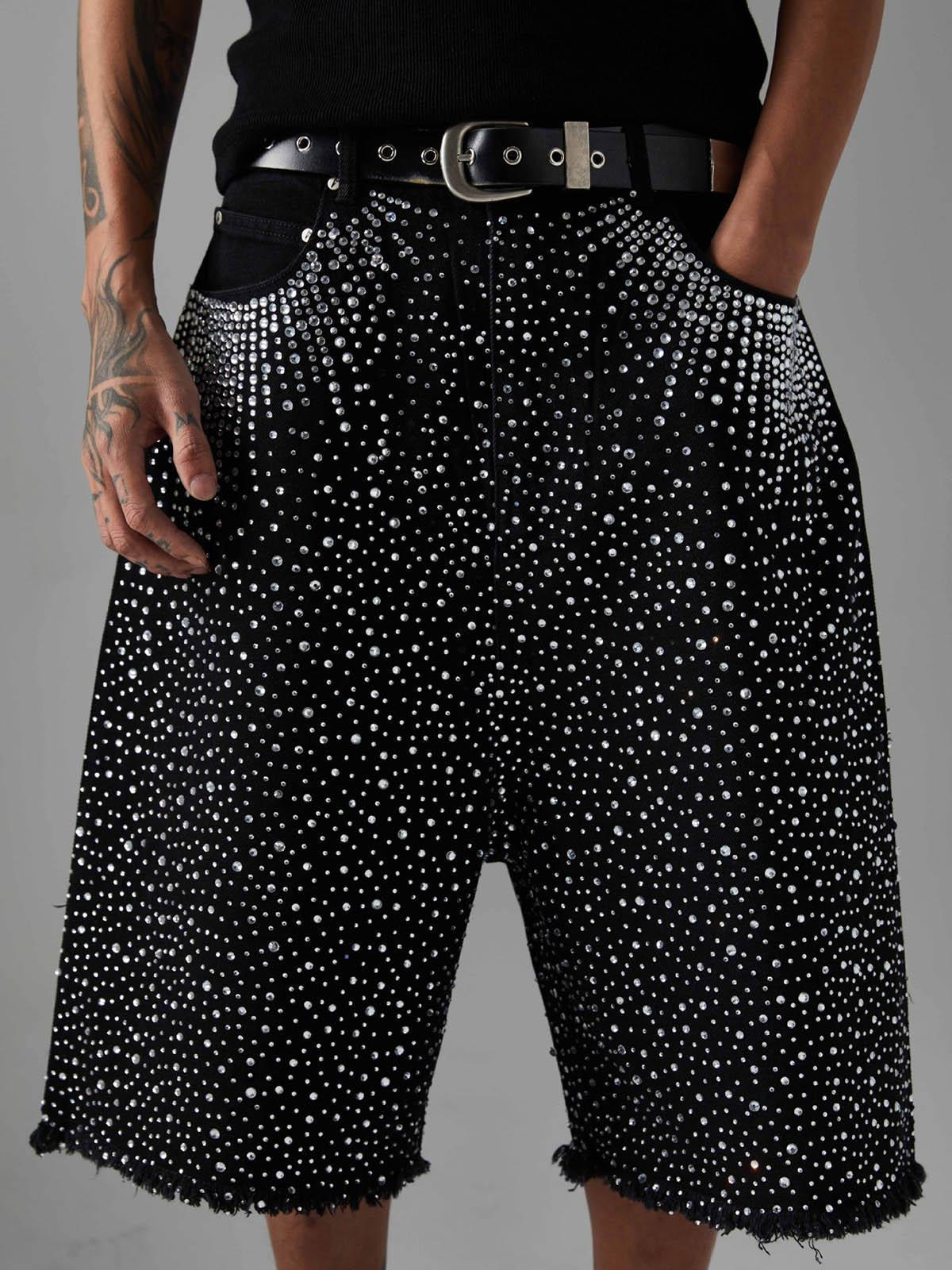 Shine like the city lights with these bold black shorts, where a cascade of shimmering studs creates a mesmerizing pattern that’s impossible to ignore. The edgy, frayed hem adds a touch of rebellion, perfect for those who thrive on standing out. With sizes ranging from S to L, these shorts offer a relaxed fit that complements your summer style effortlessly. Pair them with your favorite sneakers or chunky boots for a look that screams confidence. Get ready to own your summer outfit with unparalleled flair.