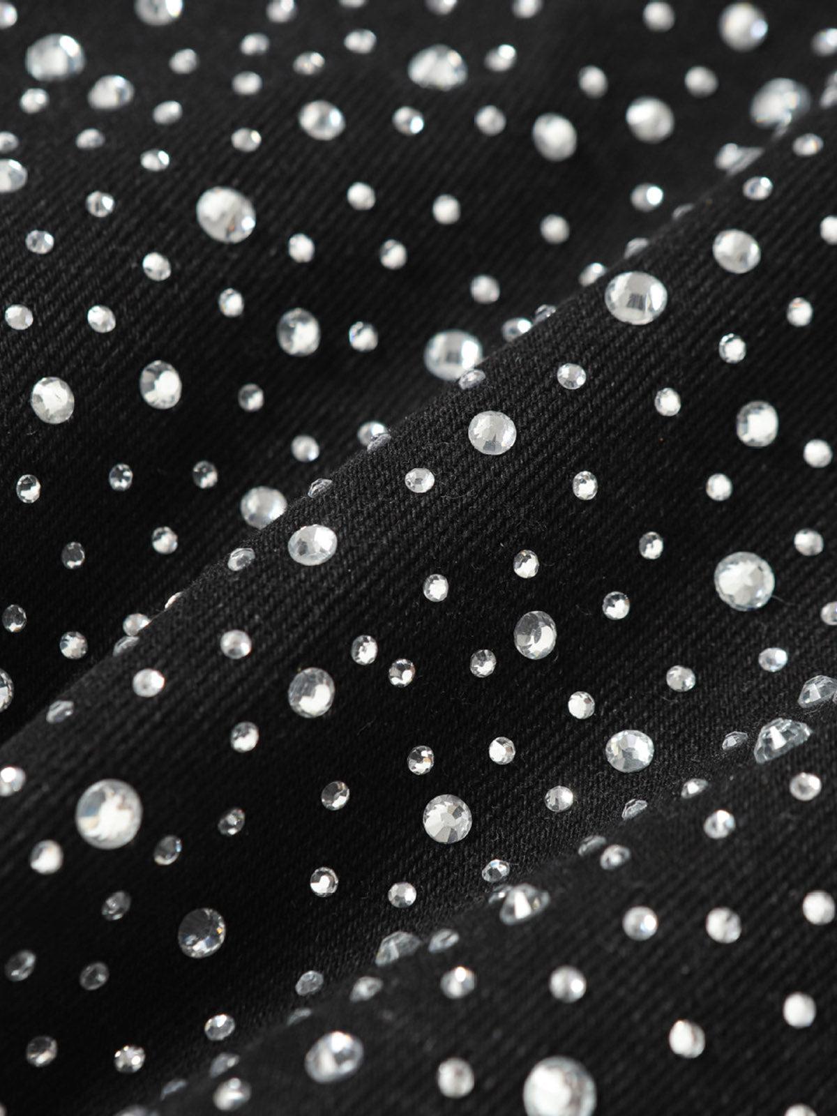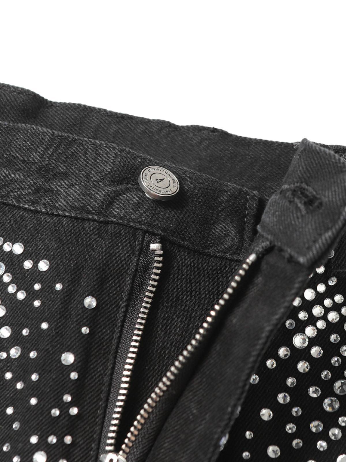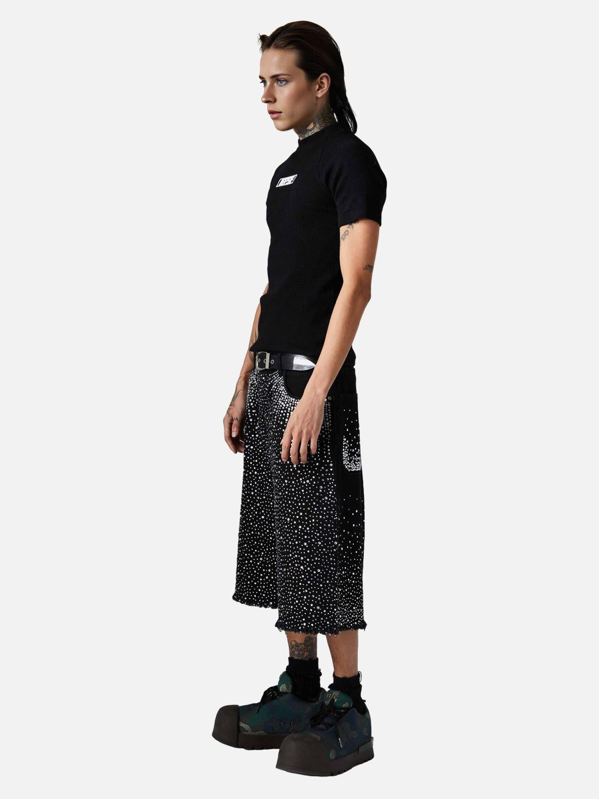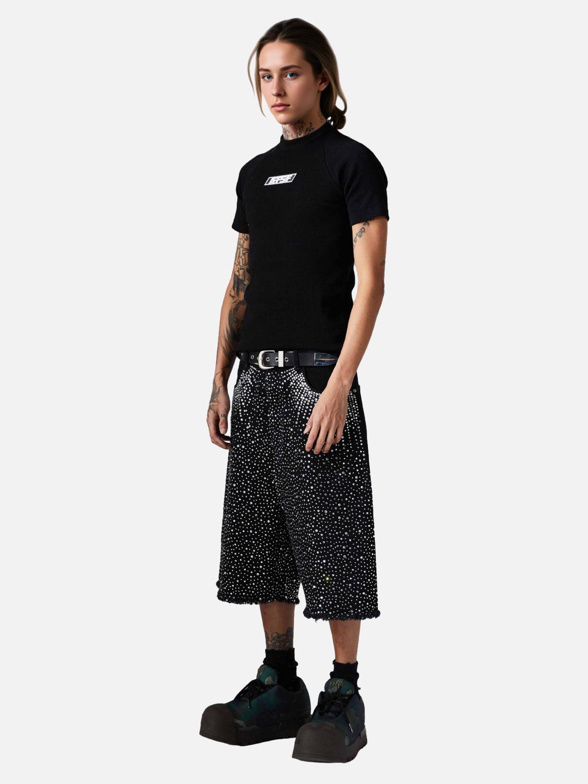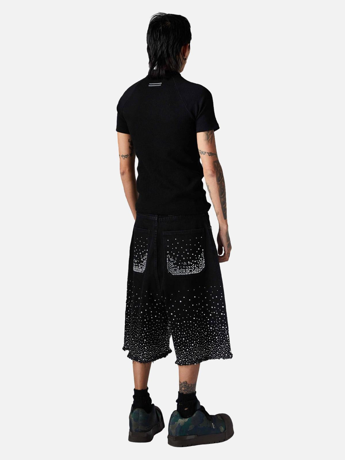 Shine like the city lights with these bold black shorts, where a cascade of shimmering studs creates a mesmerizing pattern that’s impossible to ignore. The edgy, frayed hem adds a touch of rebellion, perfect for those who thrive on standing out. With sizes ranging from S to L, these shorts offer a relaxed fit that complements your summer style effortlessly. Pair them with your favorite sneakers or chunky boots for a look that screams confidence. Get ready to own your summer outfit with unparalleled flair.