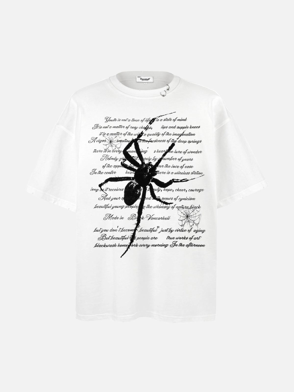 Defy the ordinary with this edgy graphic tee that merges urban grit and artistic flair. The bold black spider motif crawls confidently across a backdrop of rich beige, layered with striking script that whispers tales of rebellion and youth. Available in sizes M to 2XL, the oversized fit drapes effortlessly, ensuring comfort and style on any summer adventure. Whether you pair it with distressed denim or sleek joggers, this piece is your go-to for transforming summer fashion into an art form. Dare to wear it, and redefine your summer style.