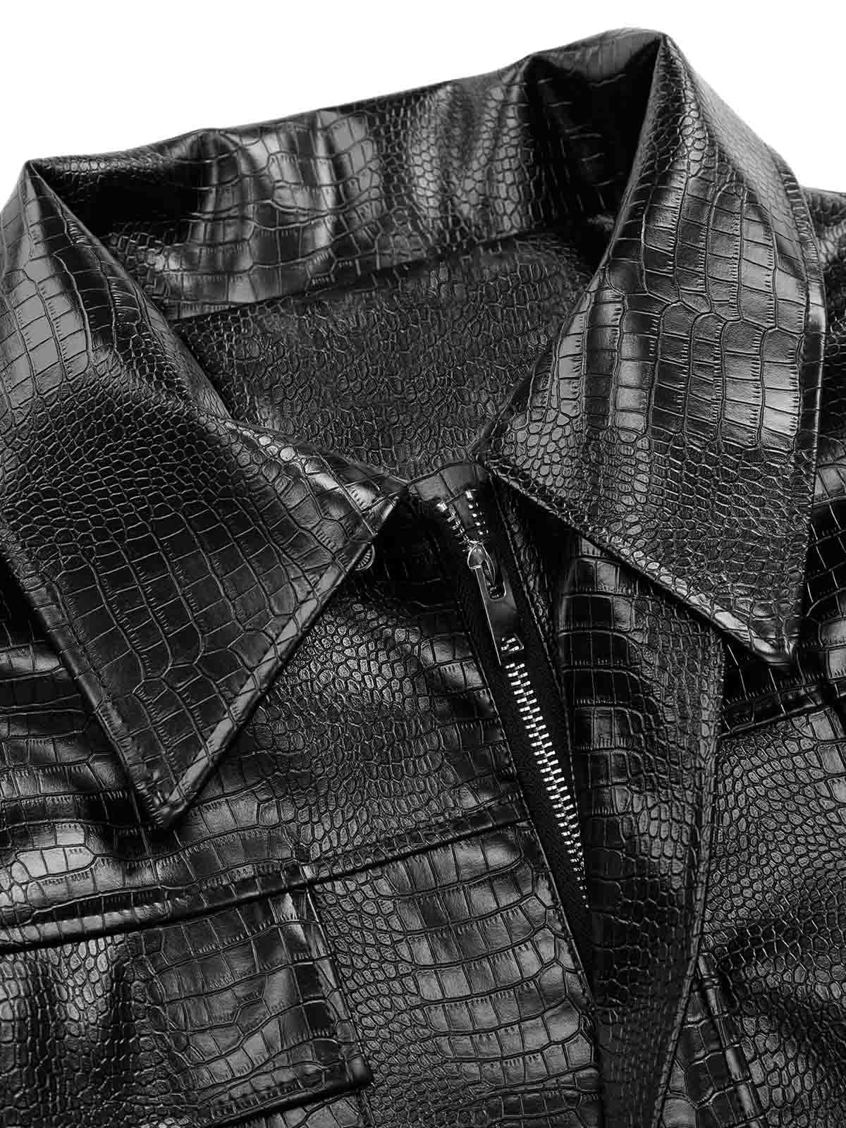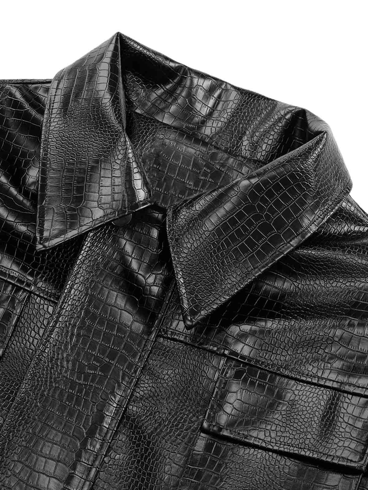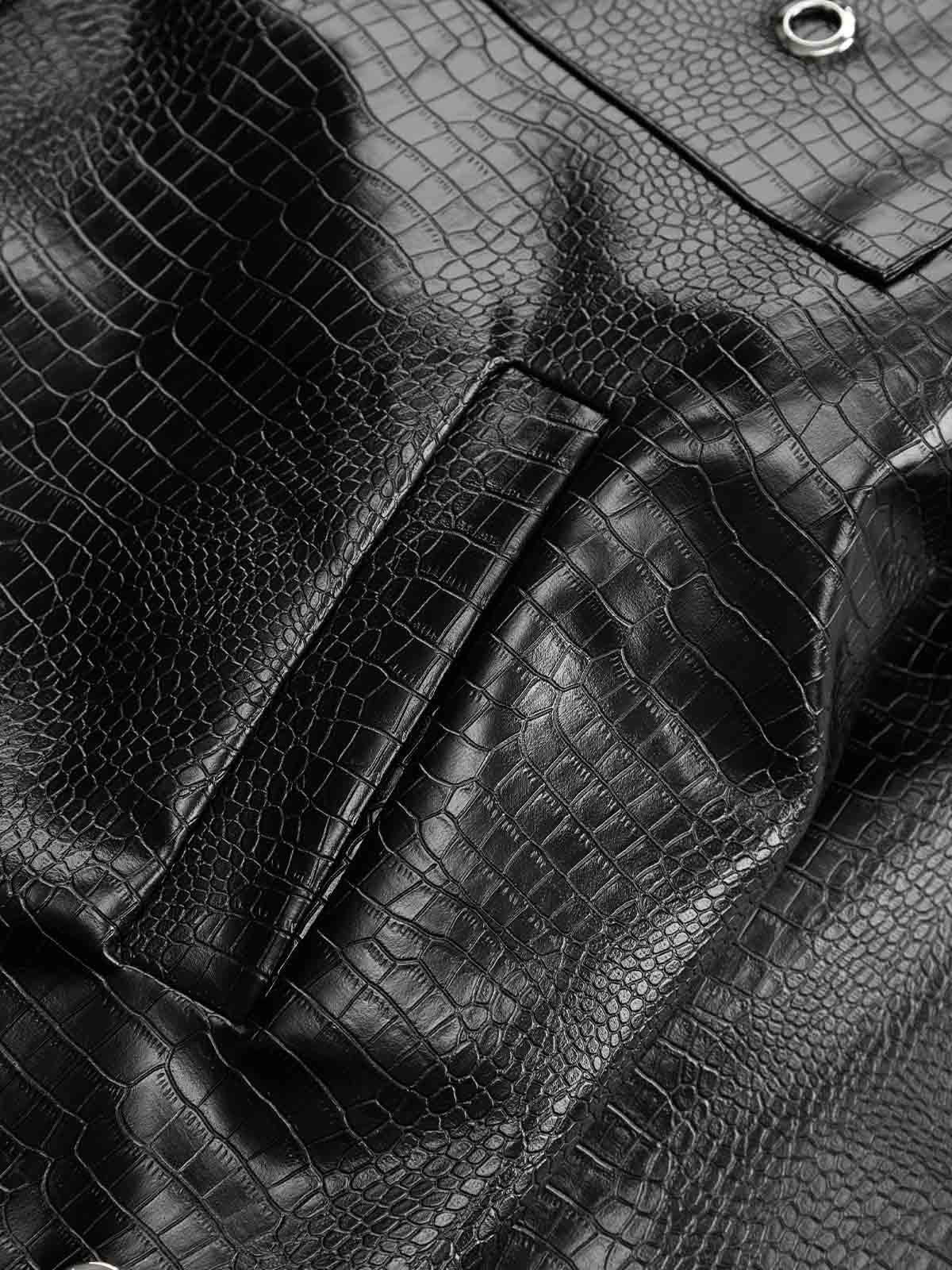 Ignite your style with a jacket that fuses sleek urban energy with a touch of rebellious flair. The rich black faux leather, embossed with a textured crocodile pattern, speaks boldly to the streets while the structured fit keeps you looking sharp in sizes M through 2XL. Silver grommet detailing and snap buttons add an industrial edge, making it a perfect match for your y2k outfits or any streetwear fashion ensemble. Layer it over a graphic tee or pair with distressed jeans to own the night. Ready to redefine your wardrobe? This piece is your ticket.