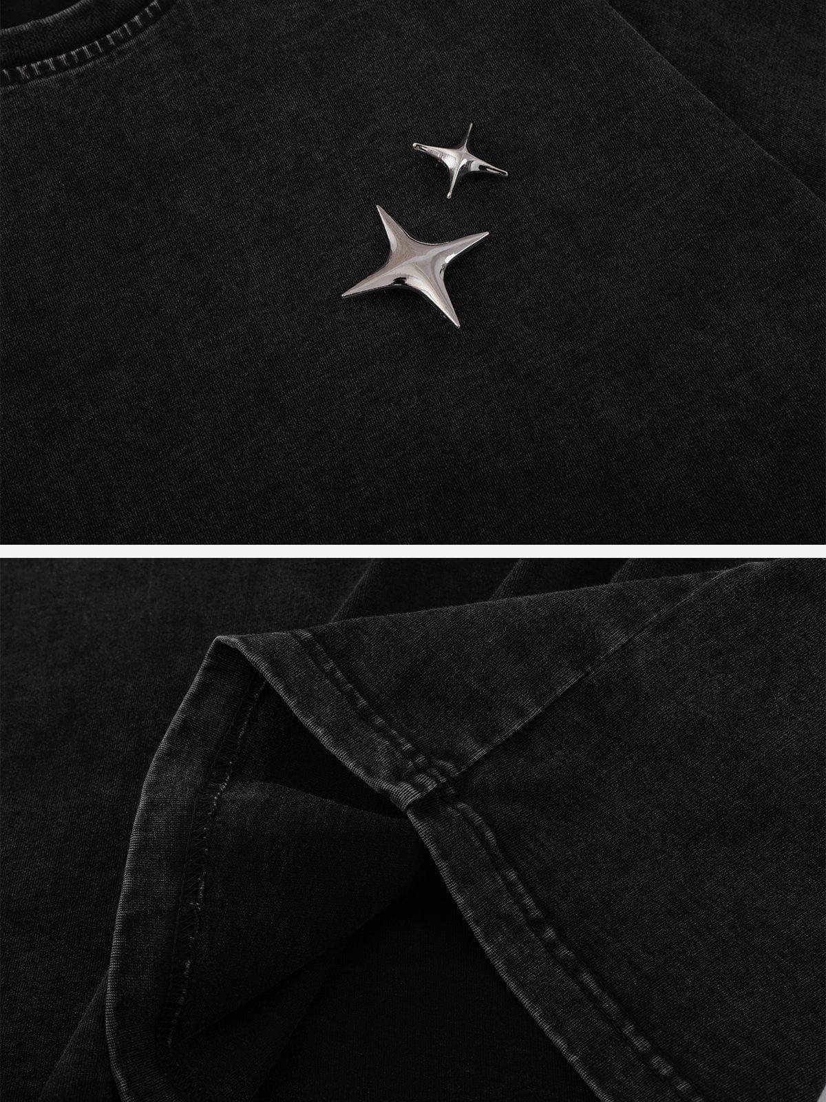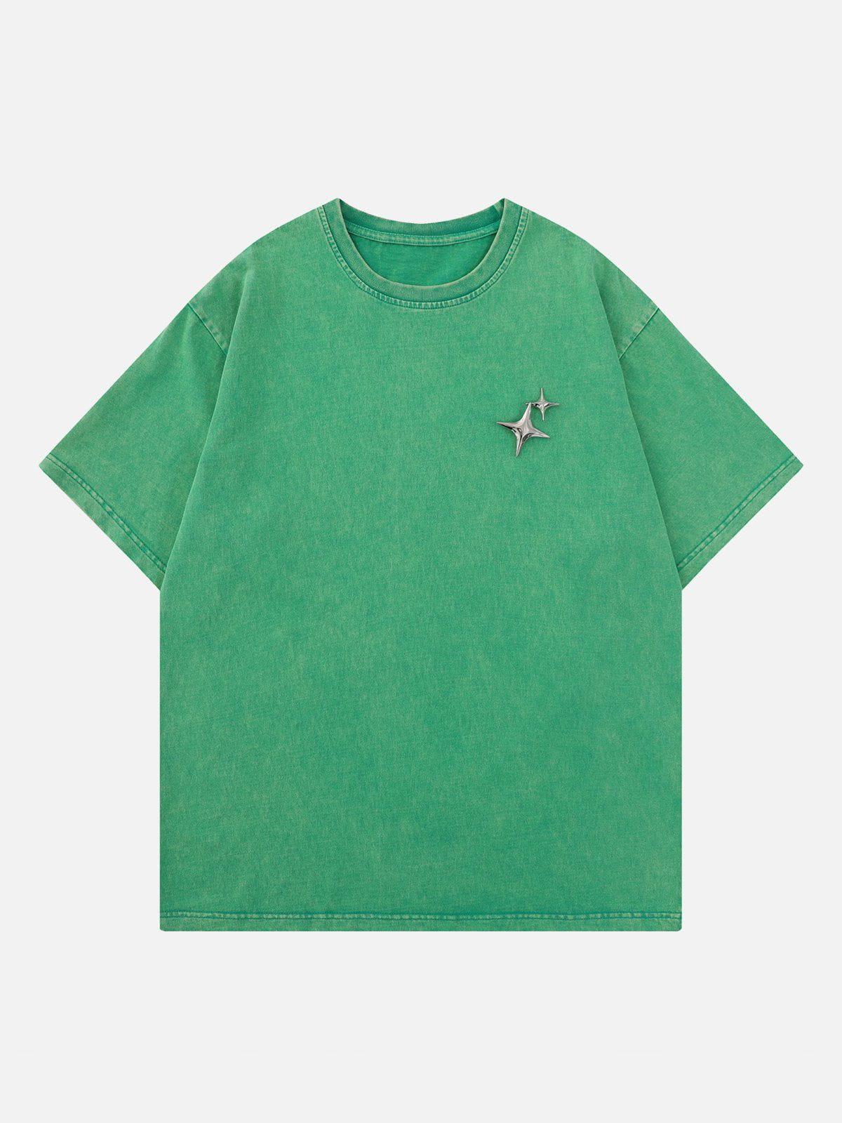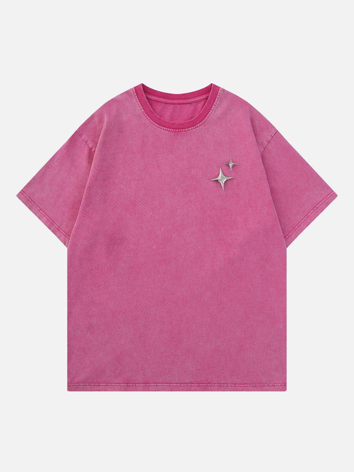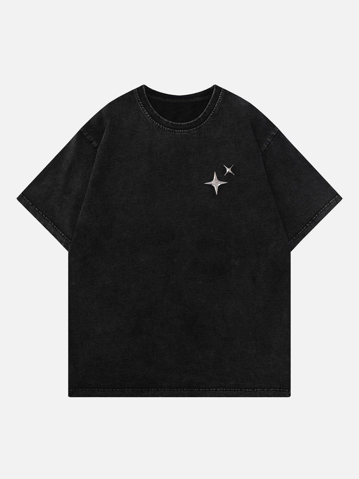 Embrace the night sky with this sleek tee, where a duo of metallic stars adds a touch of cosmic flair against a deep black backdrop. Crafted for those who dare to keep it bold, this piece brings an edge to your summer style, whether in green, blue, or vibrant red. The relaxed fit ensures comfort, while the textured fabric offers a unique feel, making it a standout choice in sizes S, M, and L. Pair it with distressed denim or layer under a statement jacket for an effortless urban vibe. Get ready to redefine your summer fashion game.