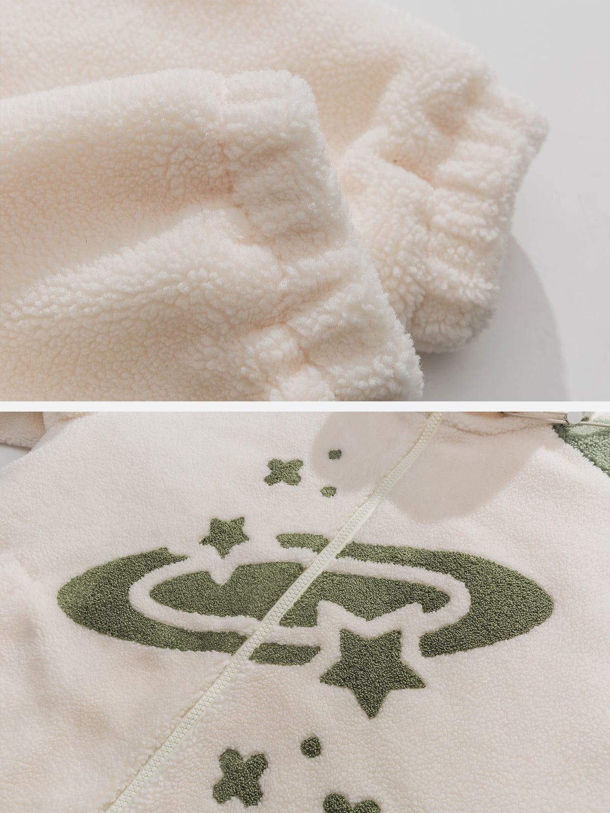 Unleash cosmic vibes with this plush jacket that blends comfort with bold design, featuring a striking green planet and stars motif against a soft cream backdrop. The high collar and relaxed fit keep you cozy and stylish, whether you’re rocking it in green, brown, or pink. Available in M, L, and XL, it’s perfect for layering over your favorite tees or pairing with streetwear essentials. This piece is a nod to retro y2k outfits, effortlessly mixing nostalgia with modern flair. Grab yours and redefine your streetwear fashion game.