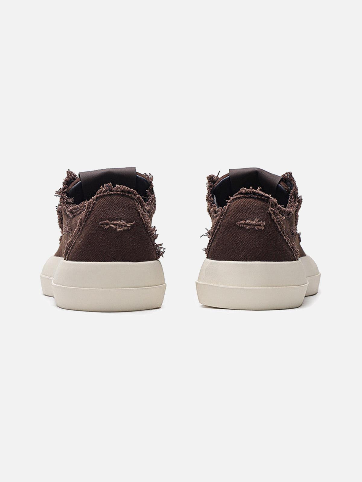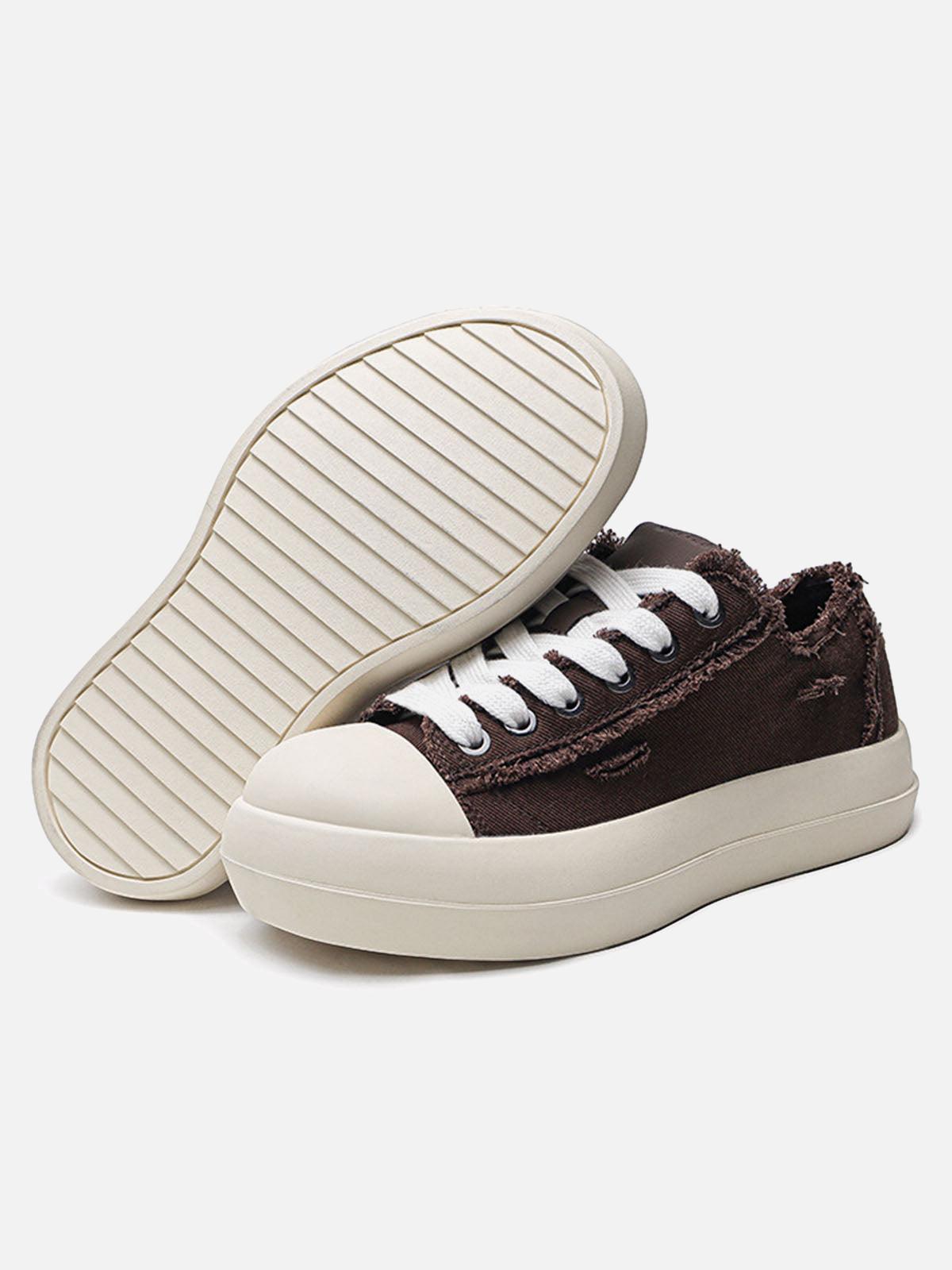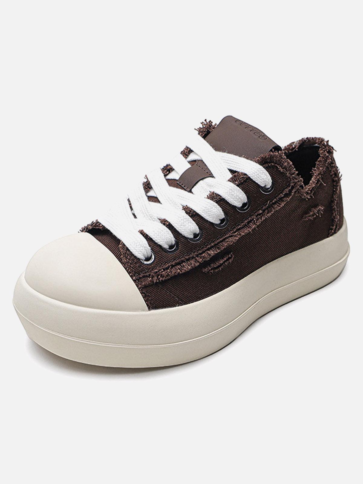 The TALISHKO Street Beard Split Hole Sneakers redefine urban style with their distressed edges and chunky sole, perfect for spring, summer, and fall. Ideal for everyday wear, casual outings, or travel, these sneakers blend edgy design with comfort. The white laces provide a striking contrast against the brown canvas, offering versatility for any wardrobe. Enjoy stability and comfort during long walks thanks to the robust sole construction.