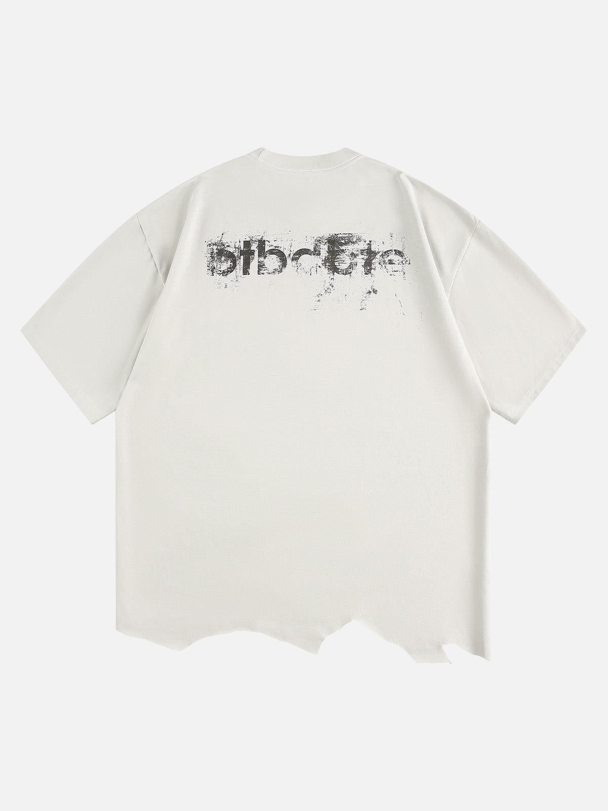 Embrace the raw edge of urban fashion with this uniquely distressed tee that speaks volumes without saying a word. The stark white backdrop serves as the perfect canvas for the bold, abstract graphics that command attention, while the jagged hemline and oversized fit add a rebellious twist. Available in sizes ranging from M to 2XL, this tee offers the perfect relaxed vibe for your summer style. Pair it with your favorite ripped jeans or layer it under a statement jacket for a look that’s effortlessly cool. Get ready to redefine your summer outfit game.