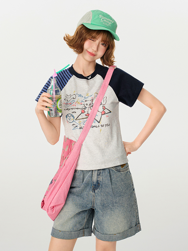 Stylish Concert Outfit: Retro Printed Raglan Short Sleeve T-shirt for Women
