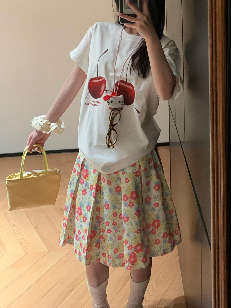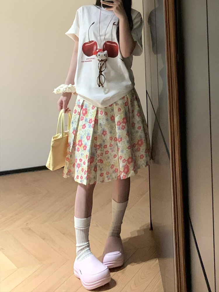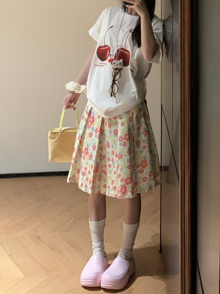 Concert Outfit Retro Pink Floral Midi Skirt Women High Waisted Pleated Summer Skirt, Casual