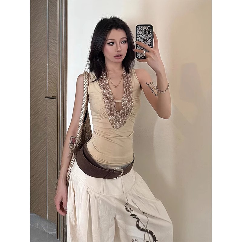 Elevate your summer wardrobe with the American Retro Sleeveless Spicy Girl Tank Top, designed for a chic, slim fit that hugs your curves in all the right places. This trendy Y2K style features eye-catching sequins that add a touch of sparkle, making it perfect for both casual outings and night adventures. Stay stylish and comfortable as you embrace the season—add this must-have tank top to your cart today!