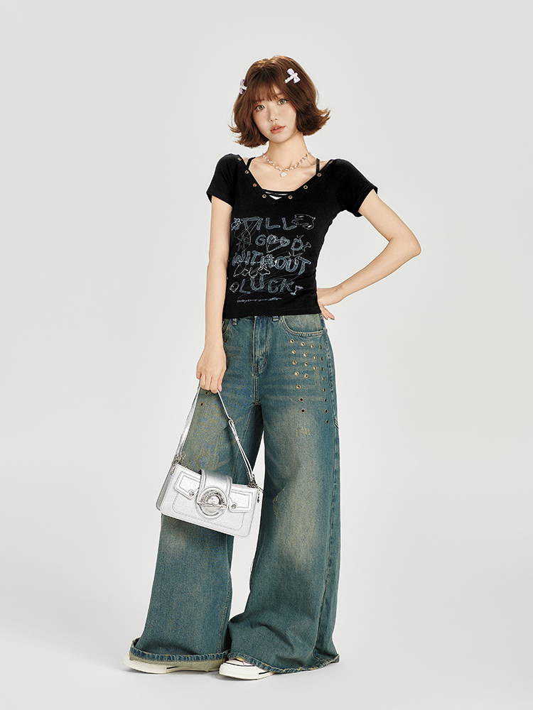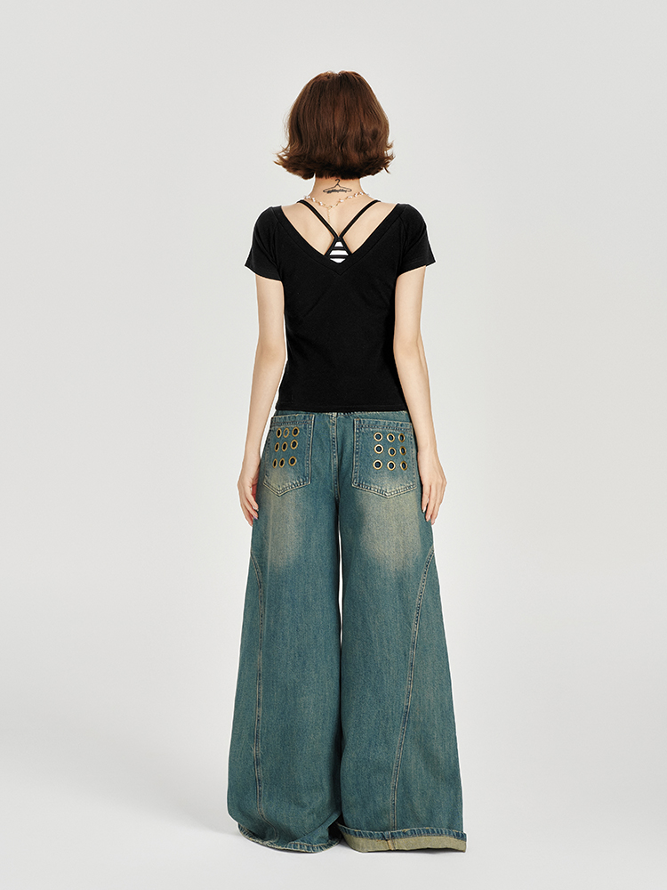 Stylish Concert Outfit: Retro V-neck Short Sleeve T-shirt for Women