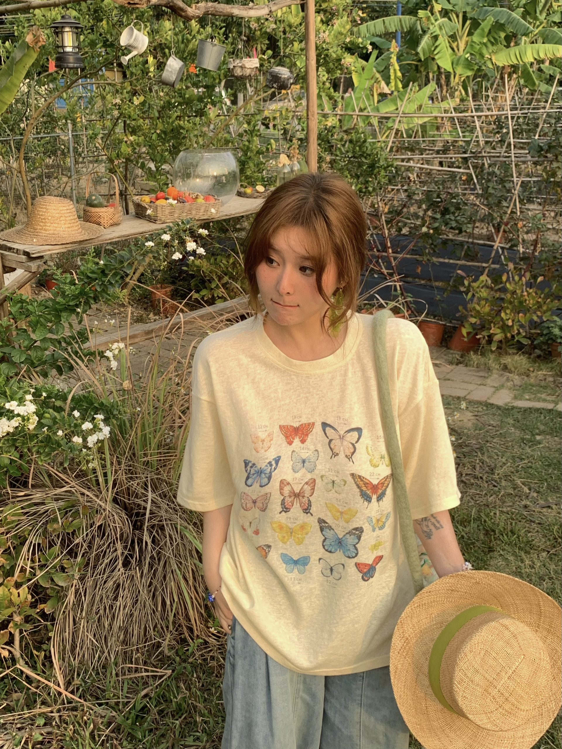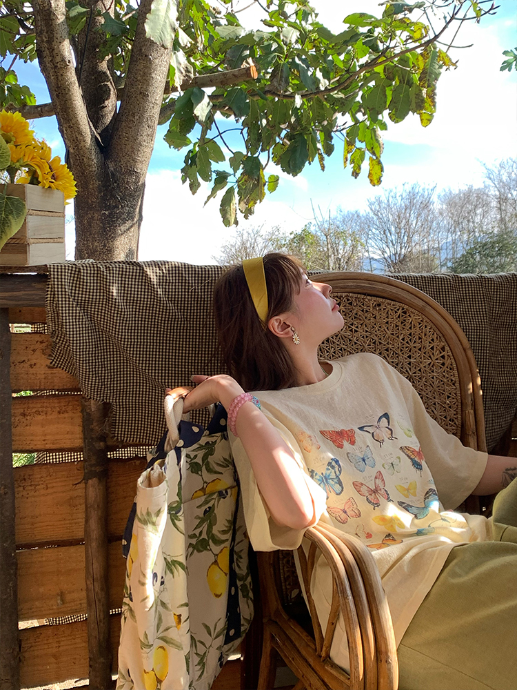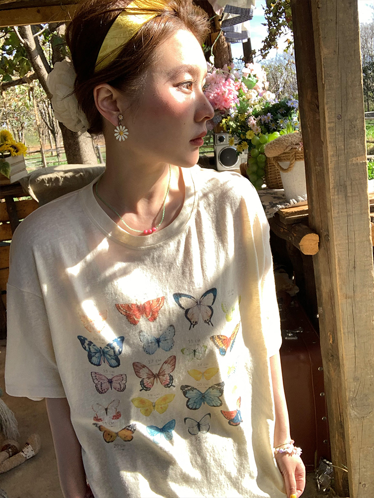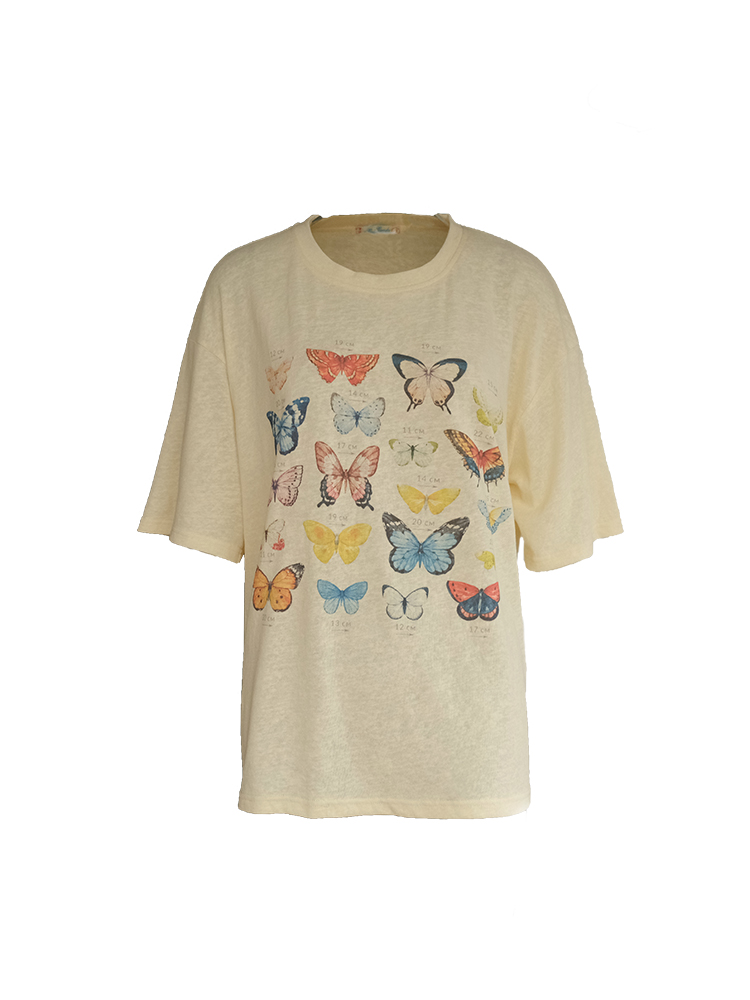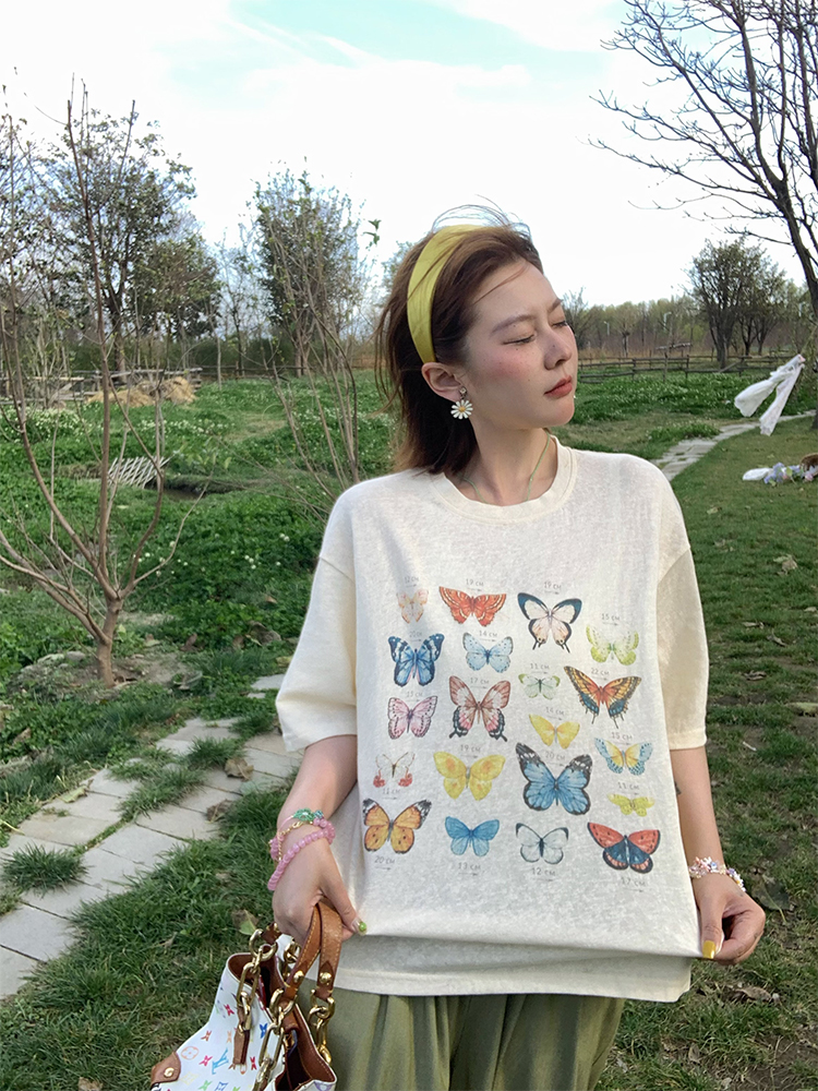 Elevate your summer wardrobe with our Apricot Yellow Butterfly Print Short Sleeve T-Shirt for Women. This vintage-style top features a loose fit and a flattering round neck, perfect for warm days and casual outings. The whimsical butterfly print adds a touch of charm, making it easy to pair with your favorite shorts or jeans. Embrace effortless style and comfort—add this must-have tee to your cart today!