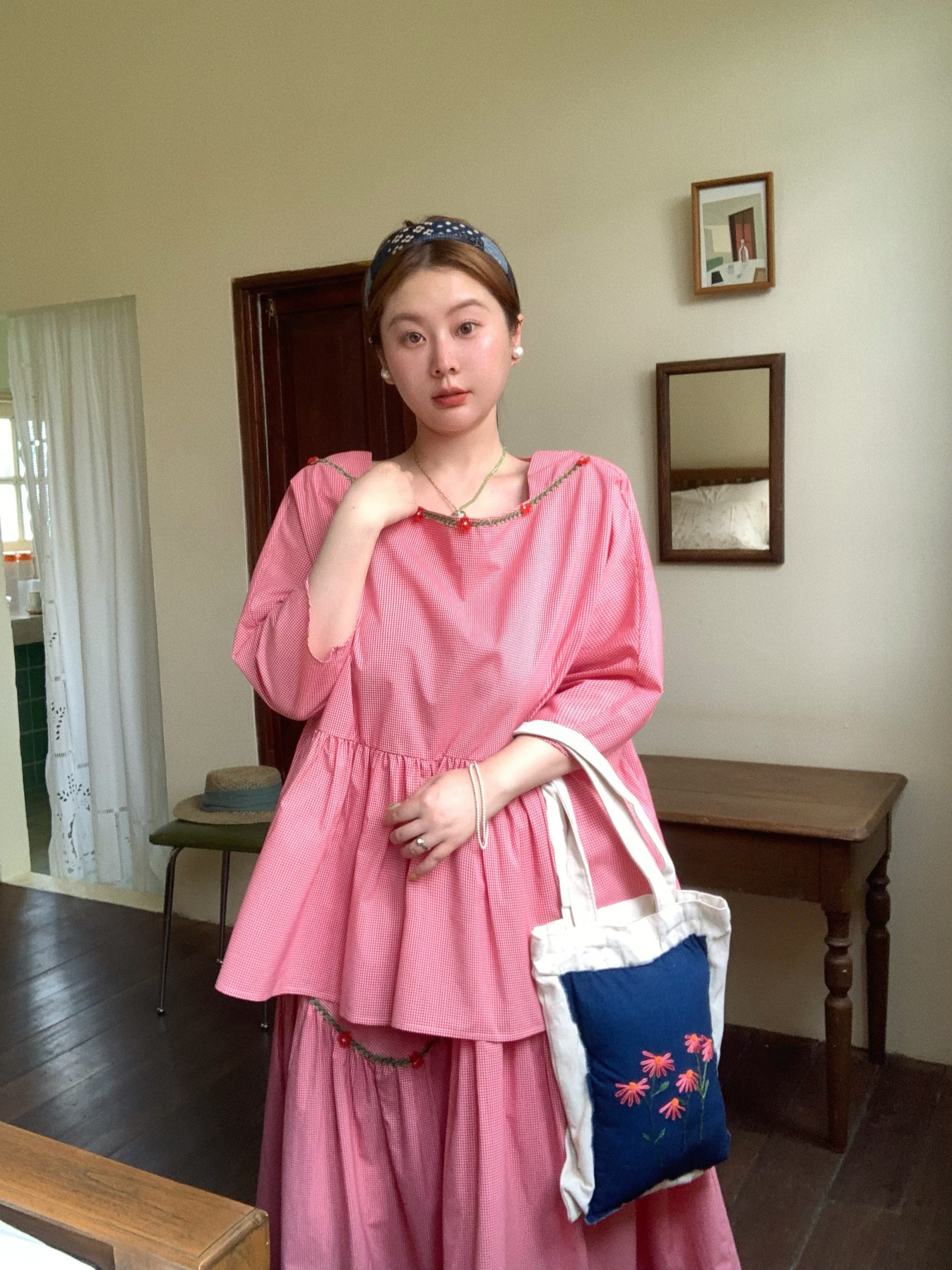 Concert Outfit Berry Red Flower Vine Pavilion Shirt, Long A Line Skirt Set Women Vintage Spring Floral Outfit
