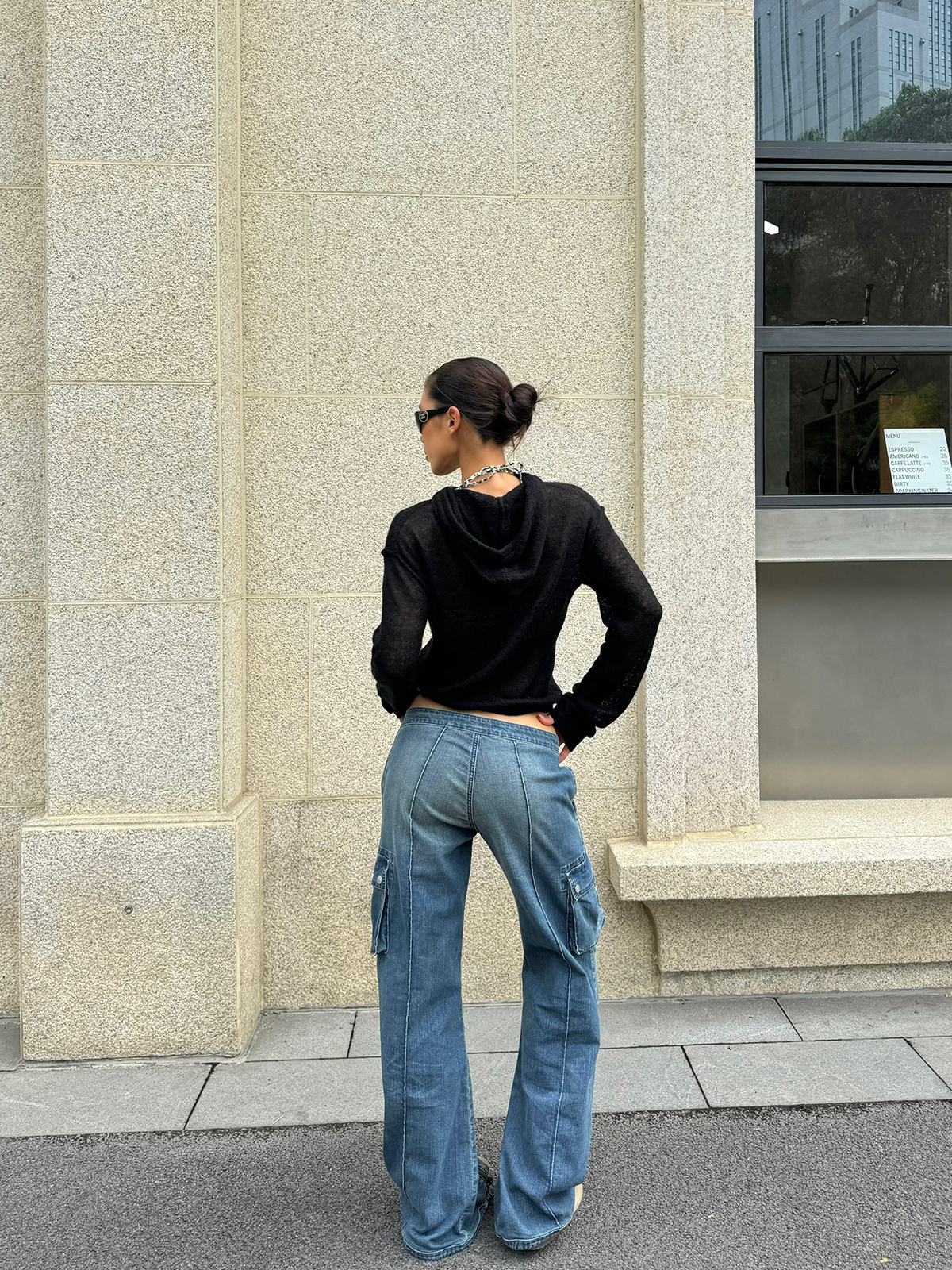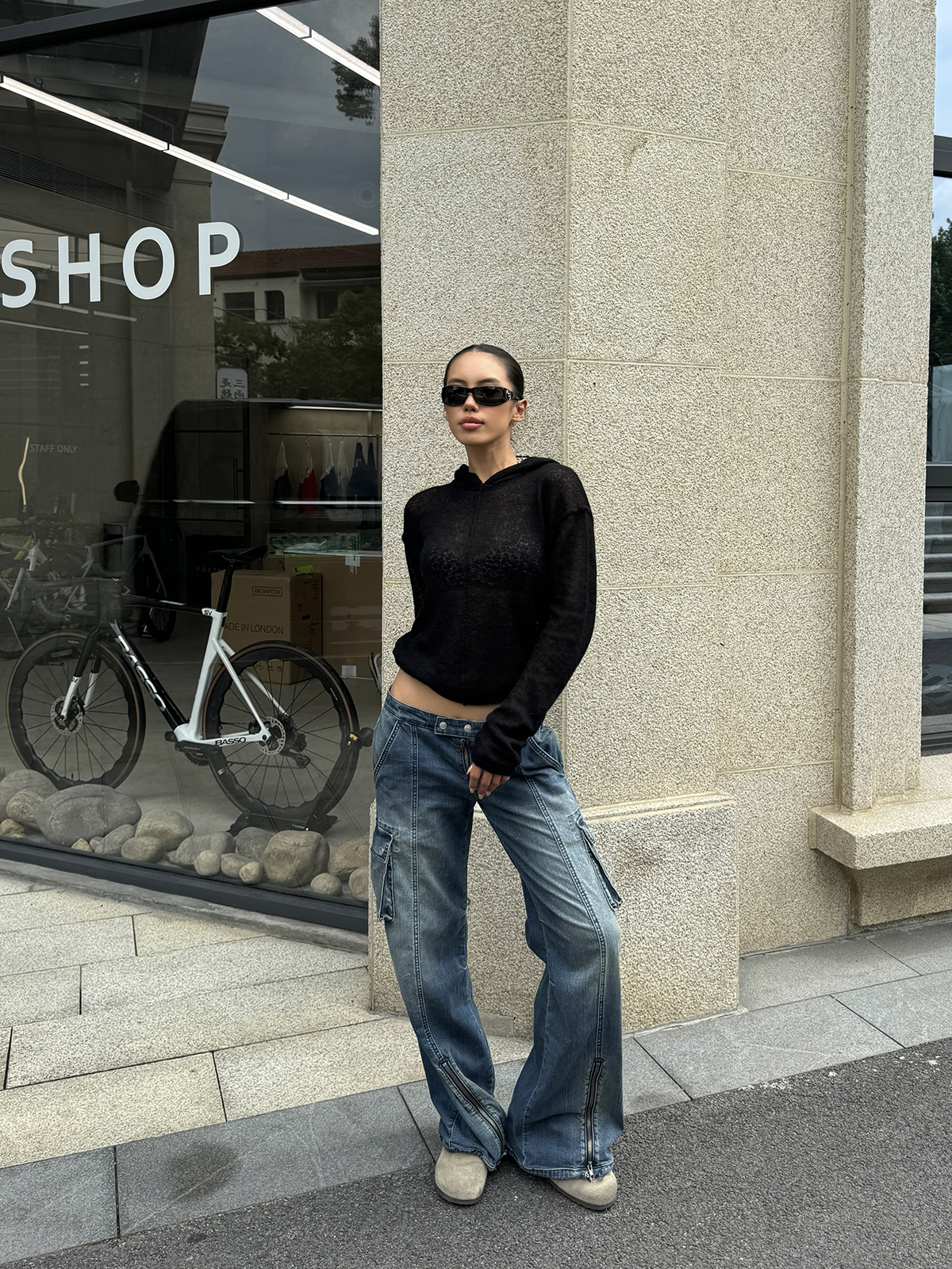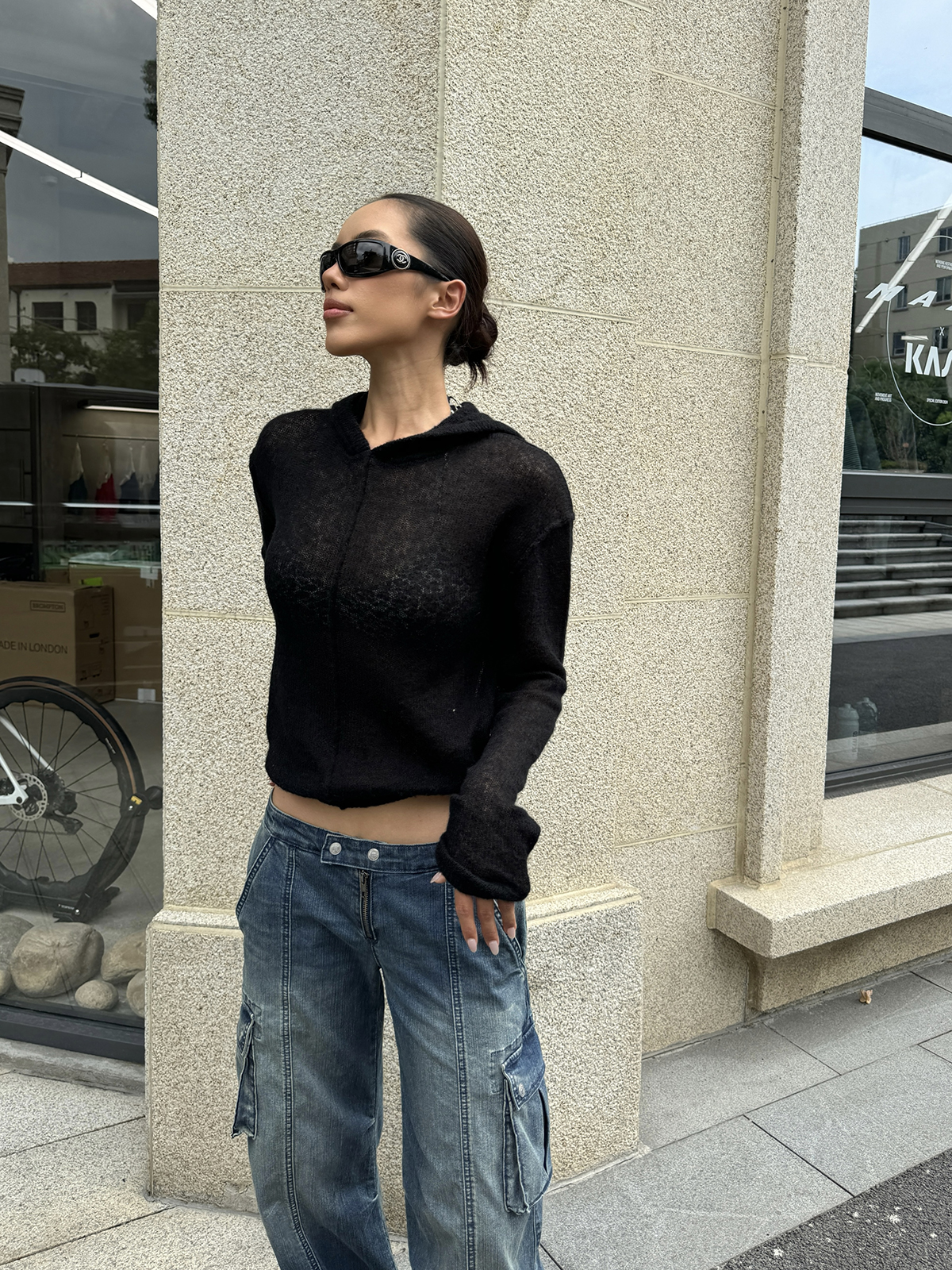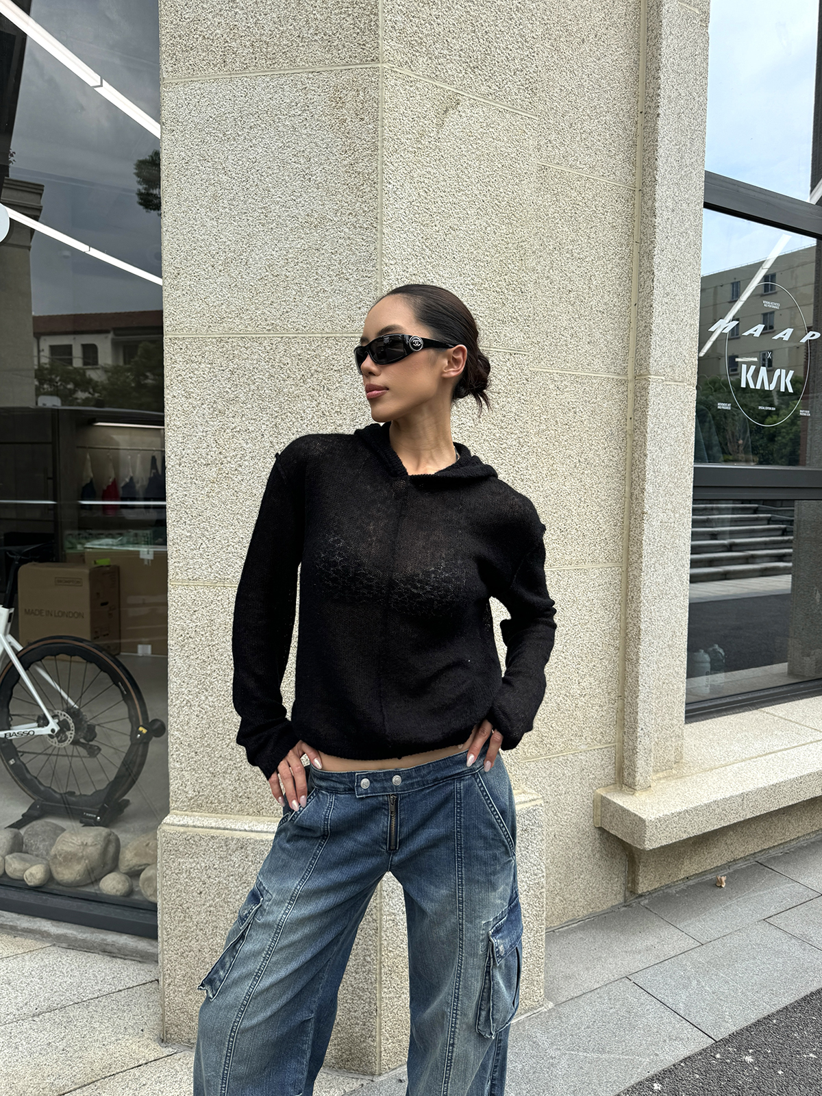 Concert Outfit Black Transparent Knitted Hoodie Practical Small, Y2K, Casual