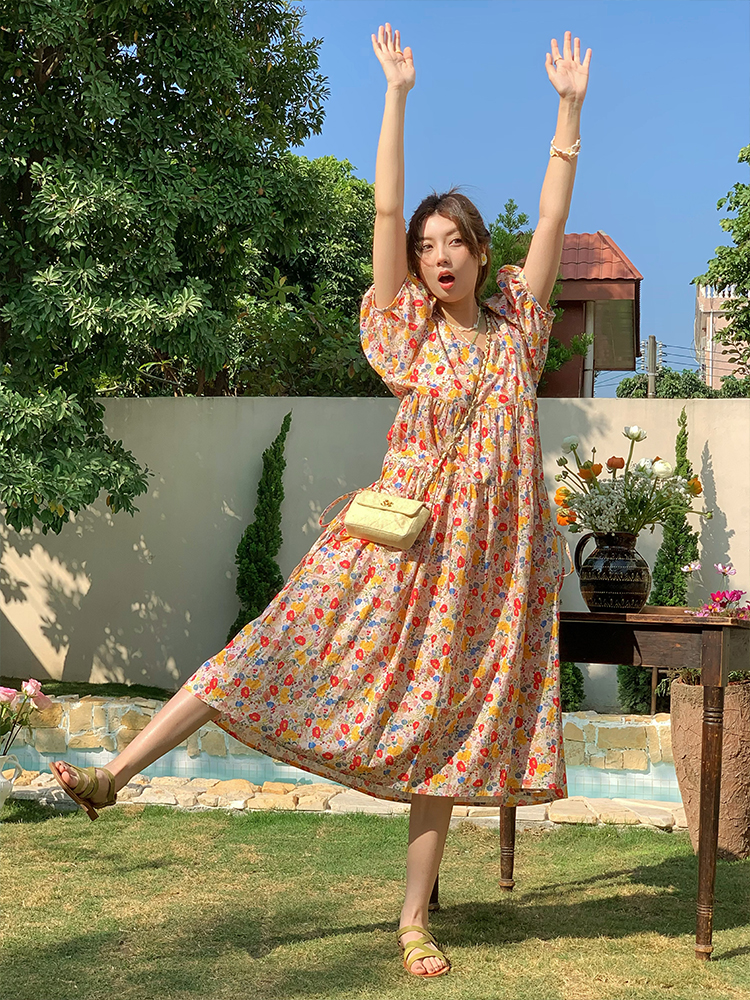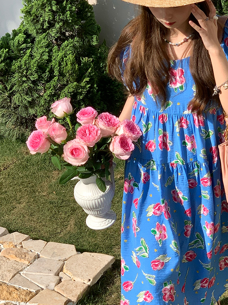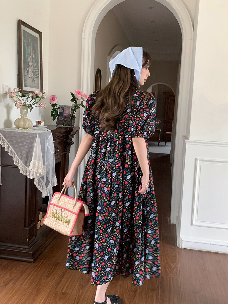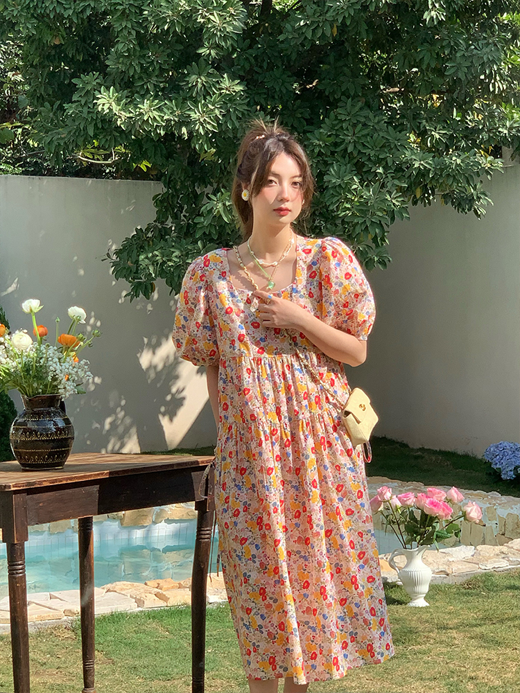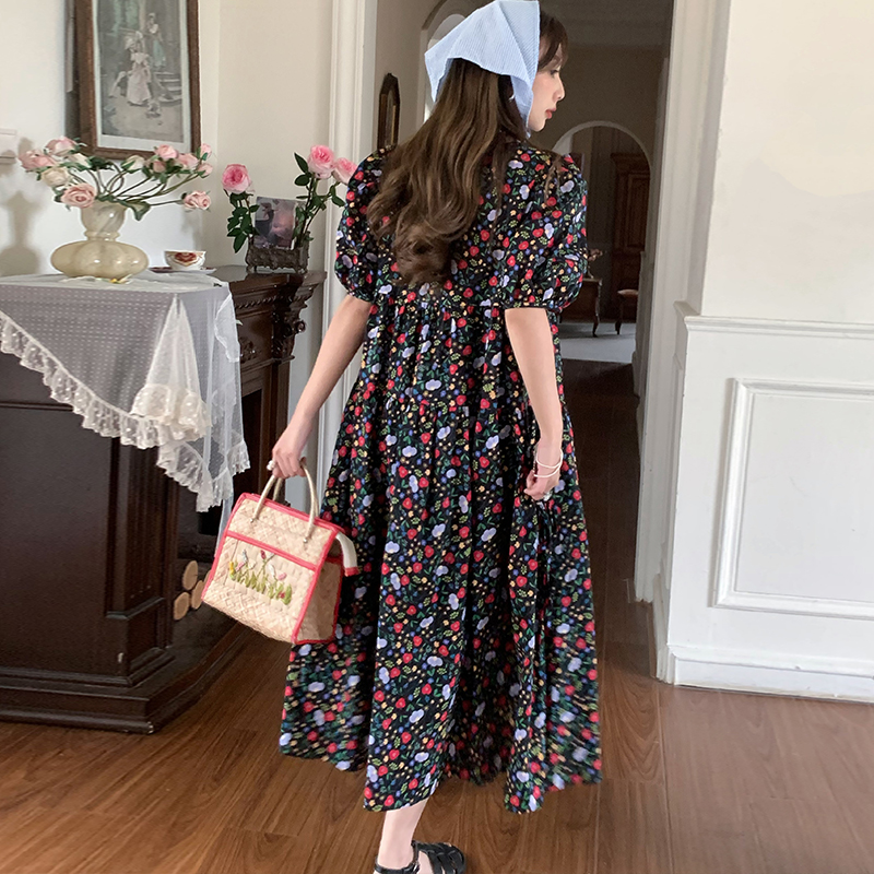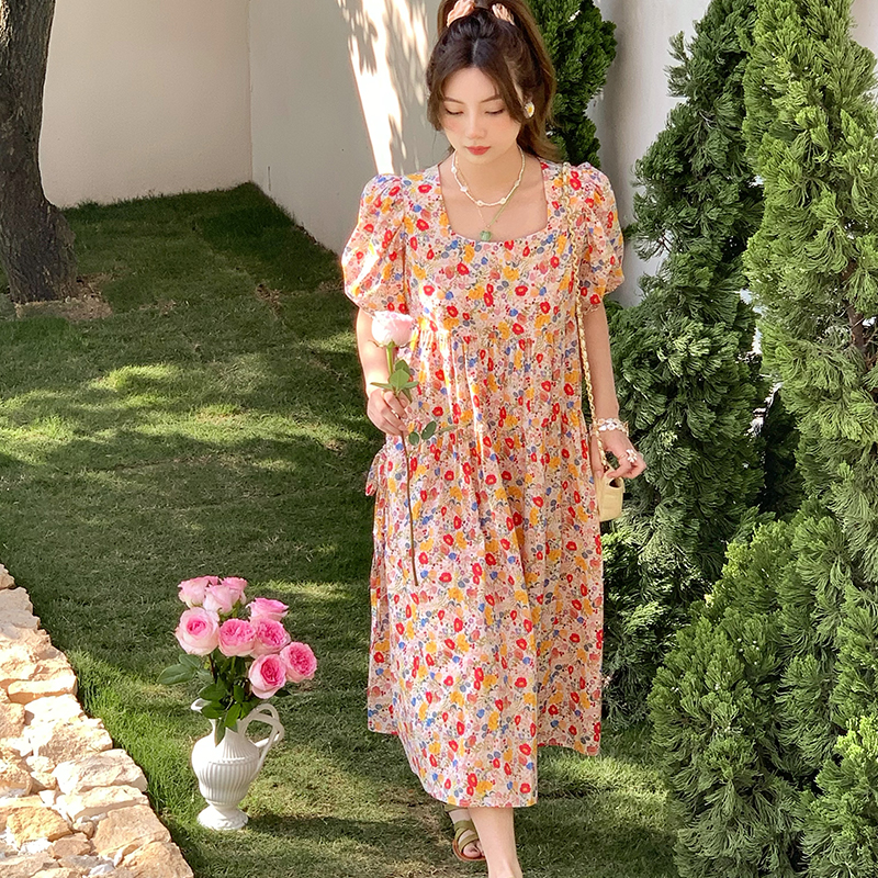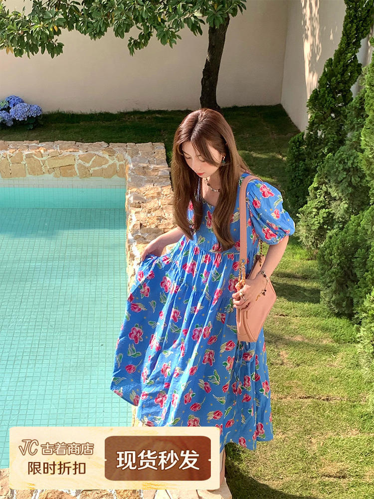 Concert Outfit Blue Floral Square Neck Short Sleeve Dress Women Vintage Loose Puff Sleeve Long Dress Late Spring pired Summer