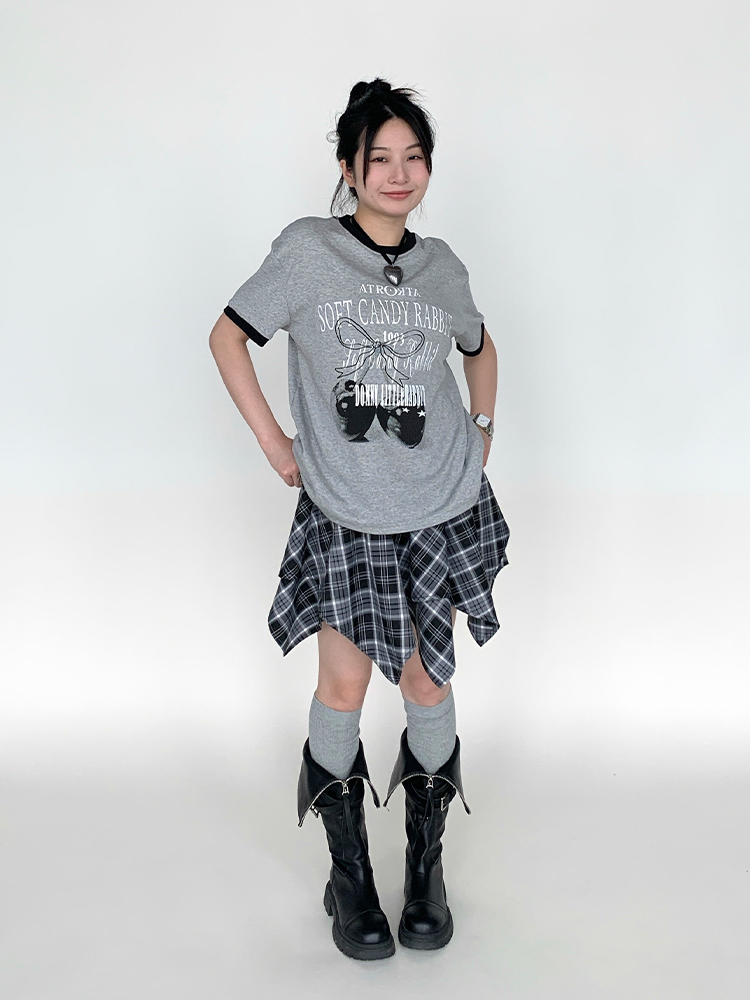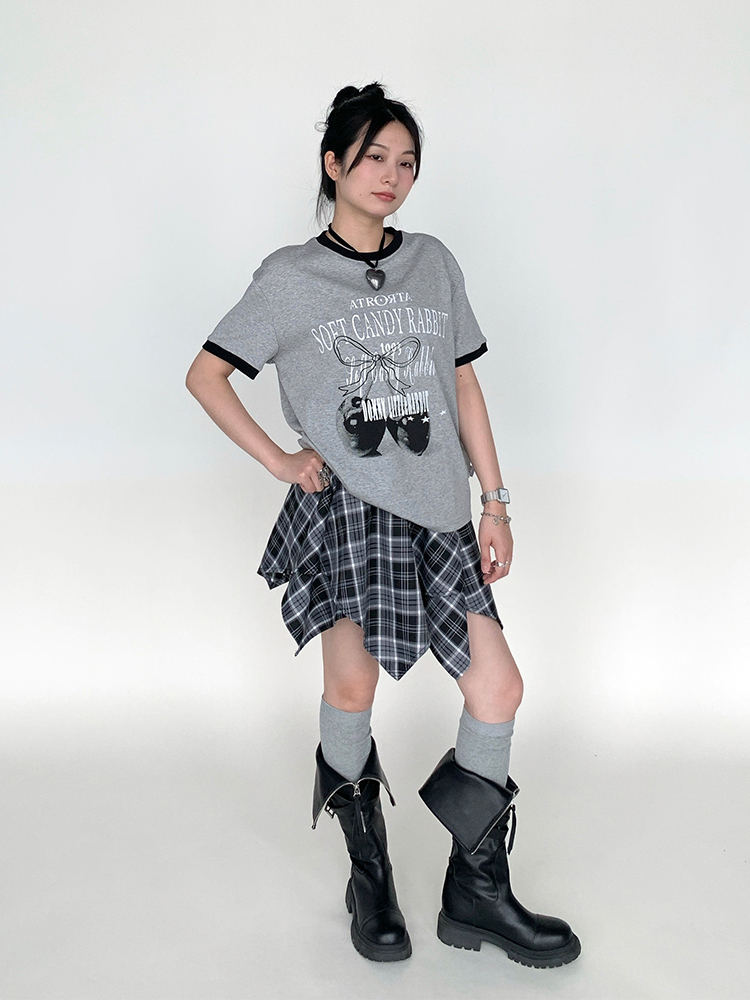 Concert Outfit Cherry Print Neck Loose Casual Summer Top Gray White Multi Tee, Y2K