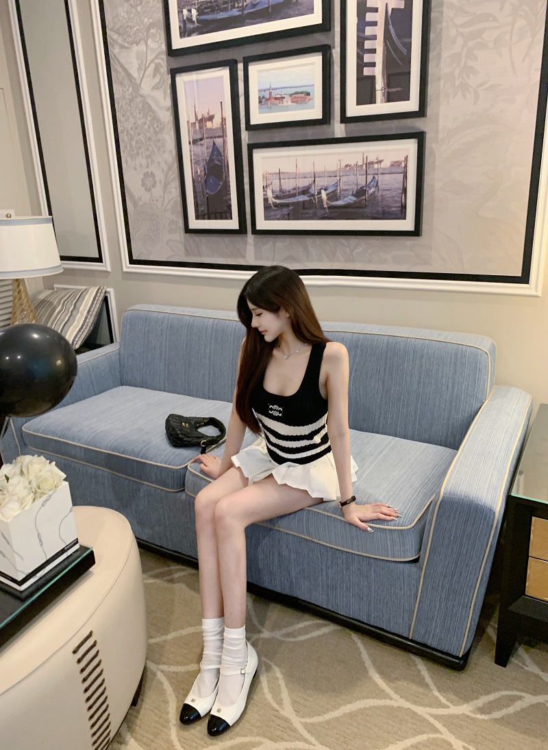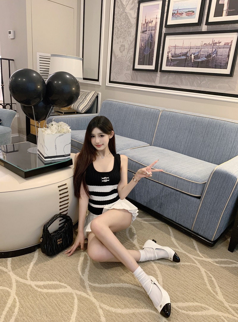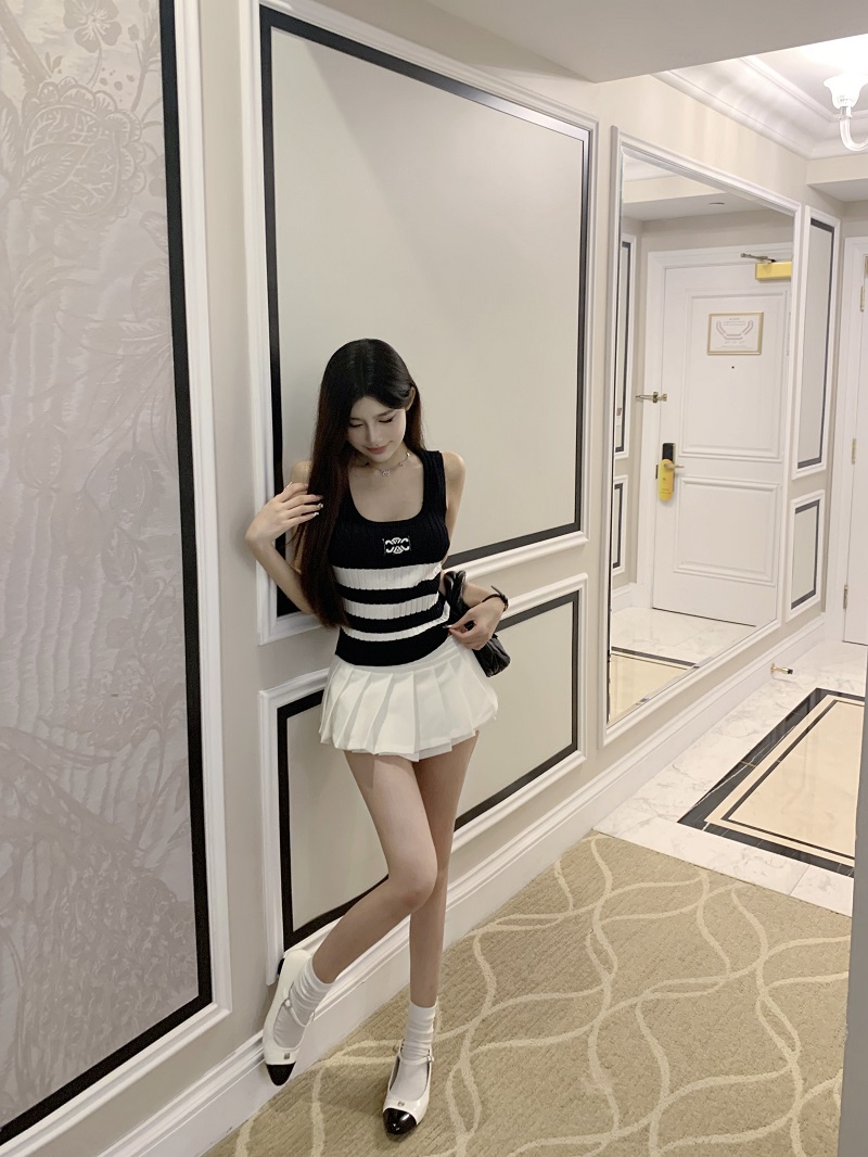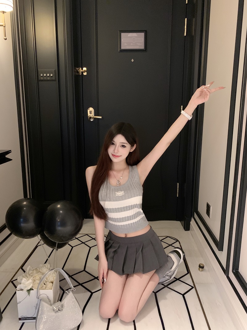 Concert Outfit Striped Sleeveless Knitted V Women Slim Fit Short TopChanel Ice Silk, Y2K