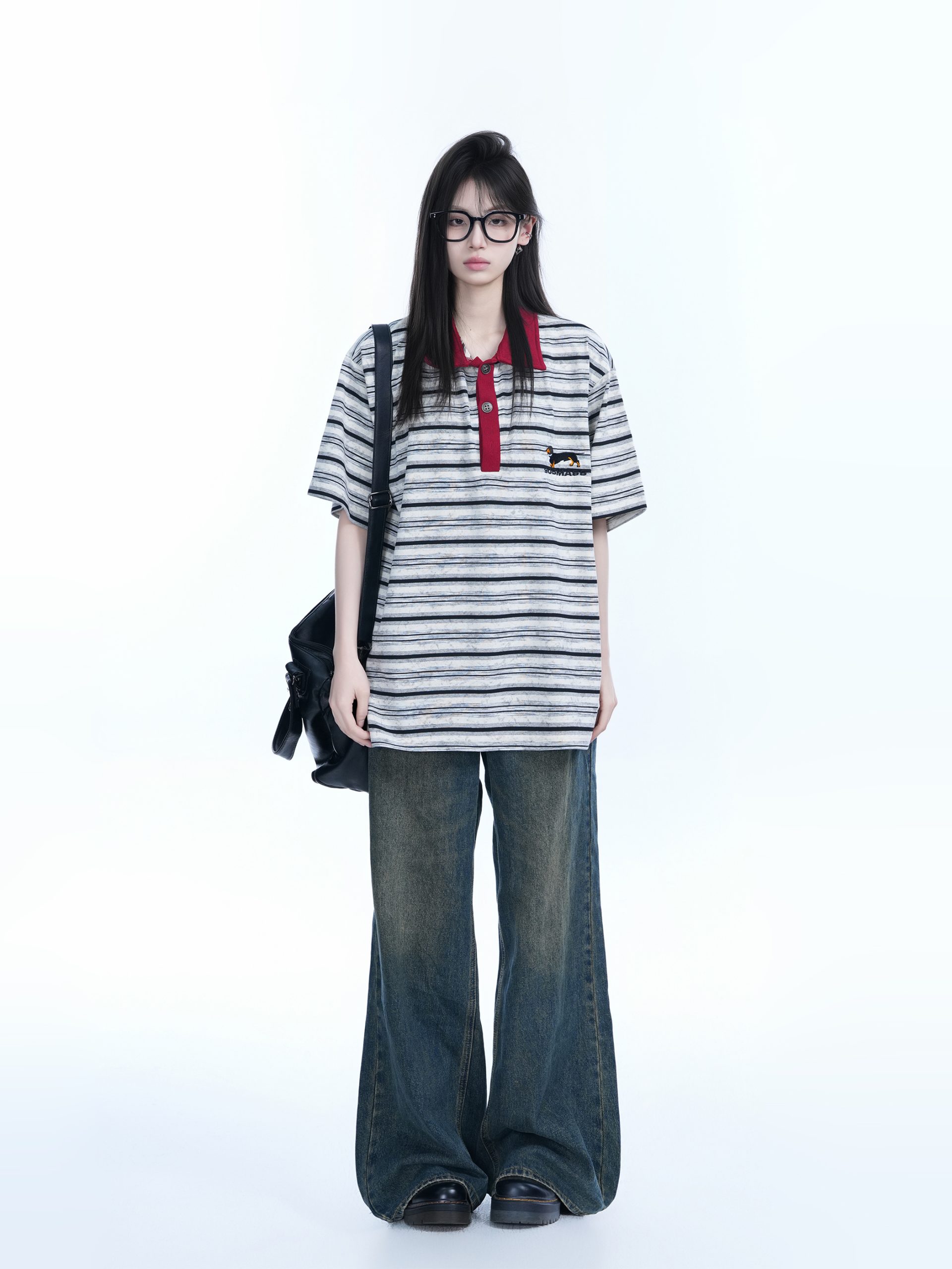 Concert Outfit Striped Polo Shirt Women Loose Fit Short Sleeve T- shirt