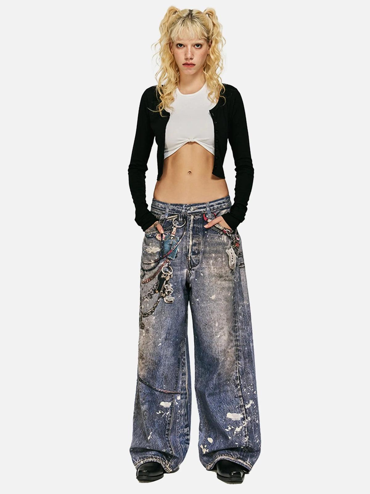 Embrace the unapologetic vibe of urban streets with these blue wide-leg jeans, featuring a distressed texture and bold chain embellishments that scream individuality. The relaxed fit not only provides comfort but also lends itself to endless styling possibilities, whether you’re aiming for a laid-back look or a daring y2k outfit. Available in sizes S through XXL, these jeans are your go-to for mixing and matching with edgy tops or oversized tees. Elevate your streetwear game with confidence and let your style speak for itself.