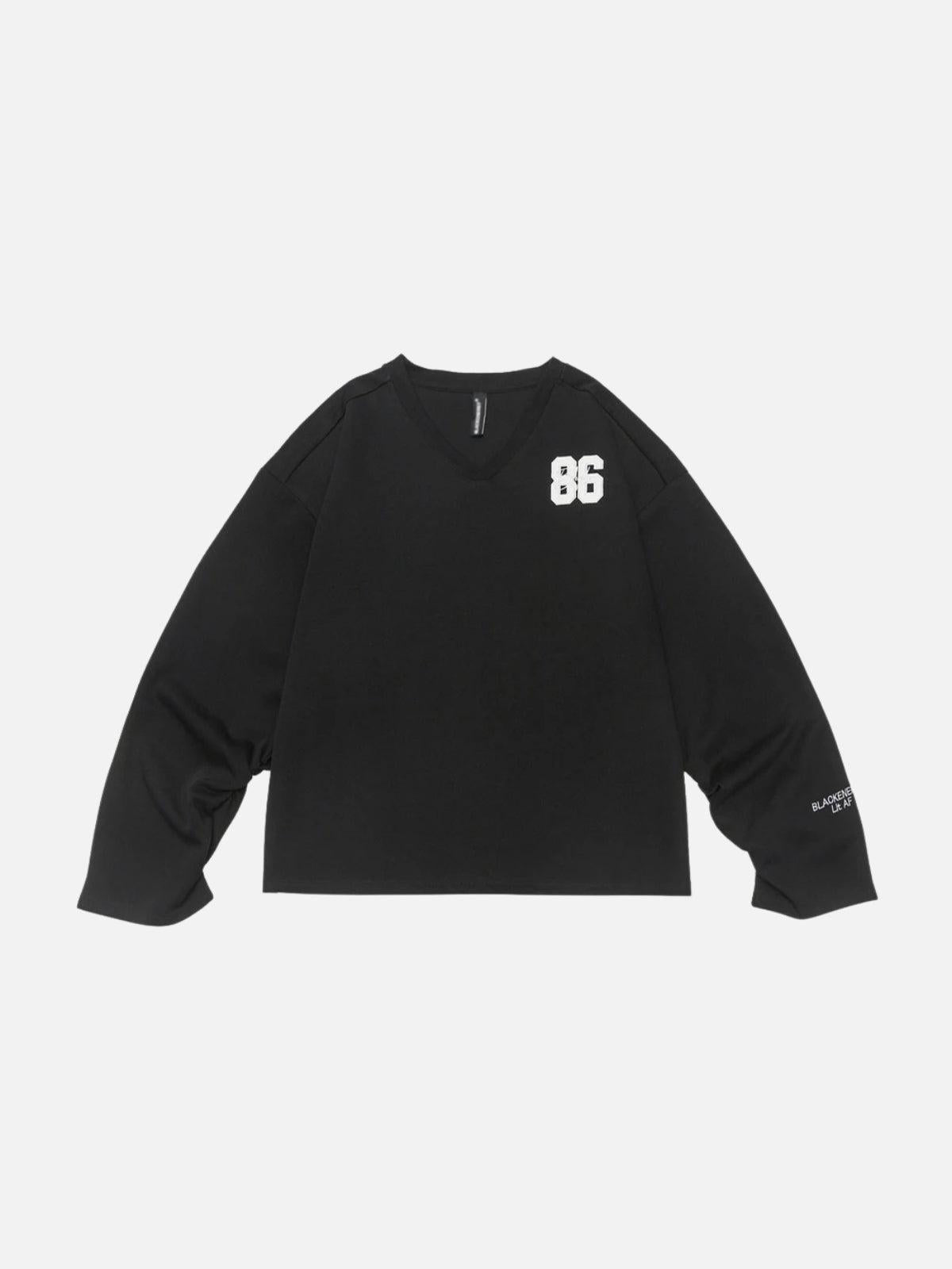 Step into the future of streetwear fashion with this sleek black V-neck, where minimalism meets edge in a way that demands attention. The bold ’86’ patch on the shoulder adds a touch of retro flair, perfect for those who live for a nostalgic twist in their outfit inspo. Its relaxed fit effortlessly drapes over your frame, available in sizes from S to XL, ensuring you find that ideal laid-back look. Pair it with your favorite jeans or layer it under a statement jacket to master the art of urban layering. Make this your go-to piece and redefine your streetwear game.