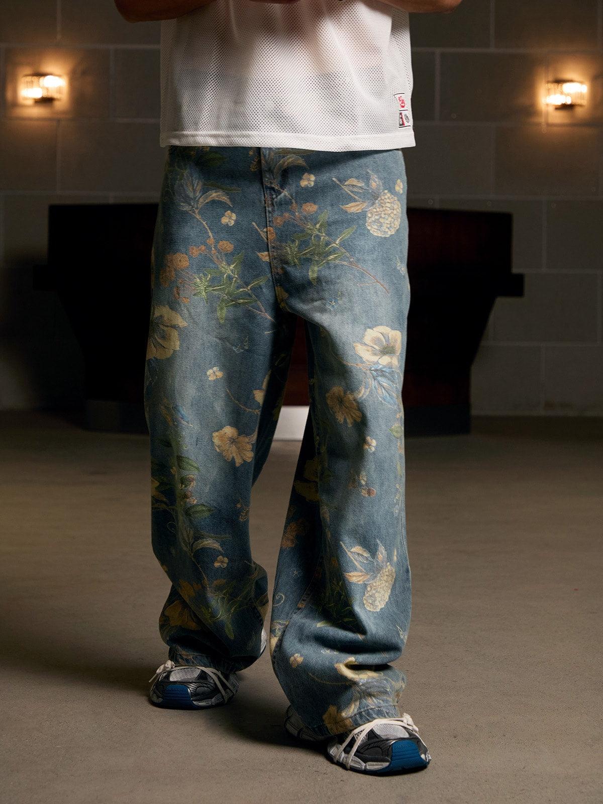 Break the mold and redefine streetwear fashion with these bold, floral-patterned jeans that blend vintage charm with a modern twist. The blue canvas offers a versatile backdrop for the vibrant blooms, giving your wardrobe a fresh burst of color and style. With a relaxed fit, these jeans are available in sizes S, M, L, and XL, ensuring comfort and individuality for every urban explorer. Pair them with a sleek top or an oversized hoodie for endless outfit inspo that radiates confidence and creativity. Elevate your look and let your style speak volumes.