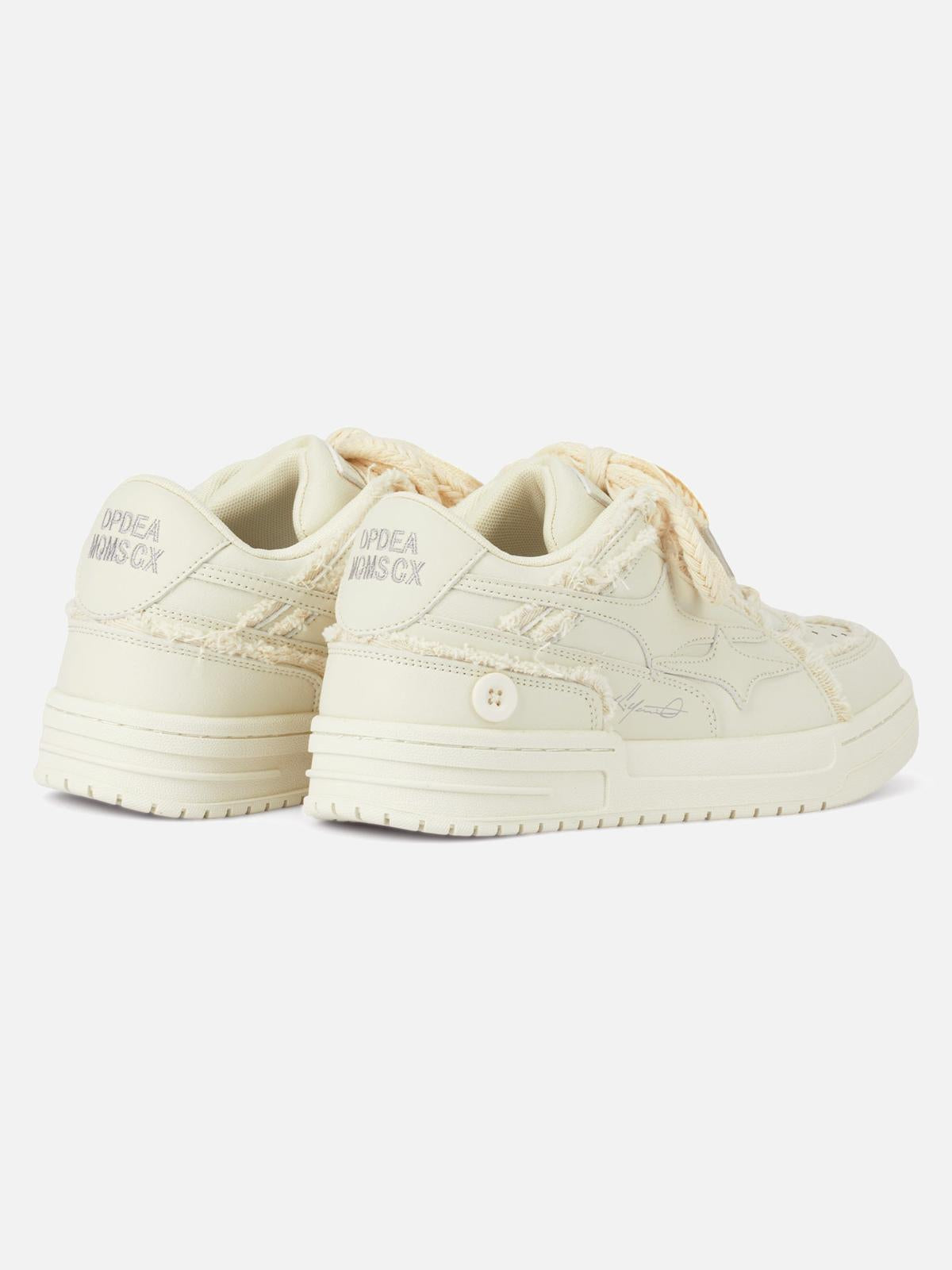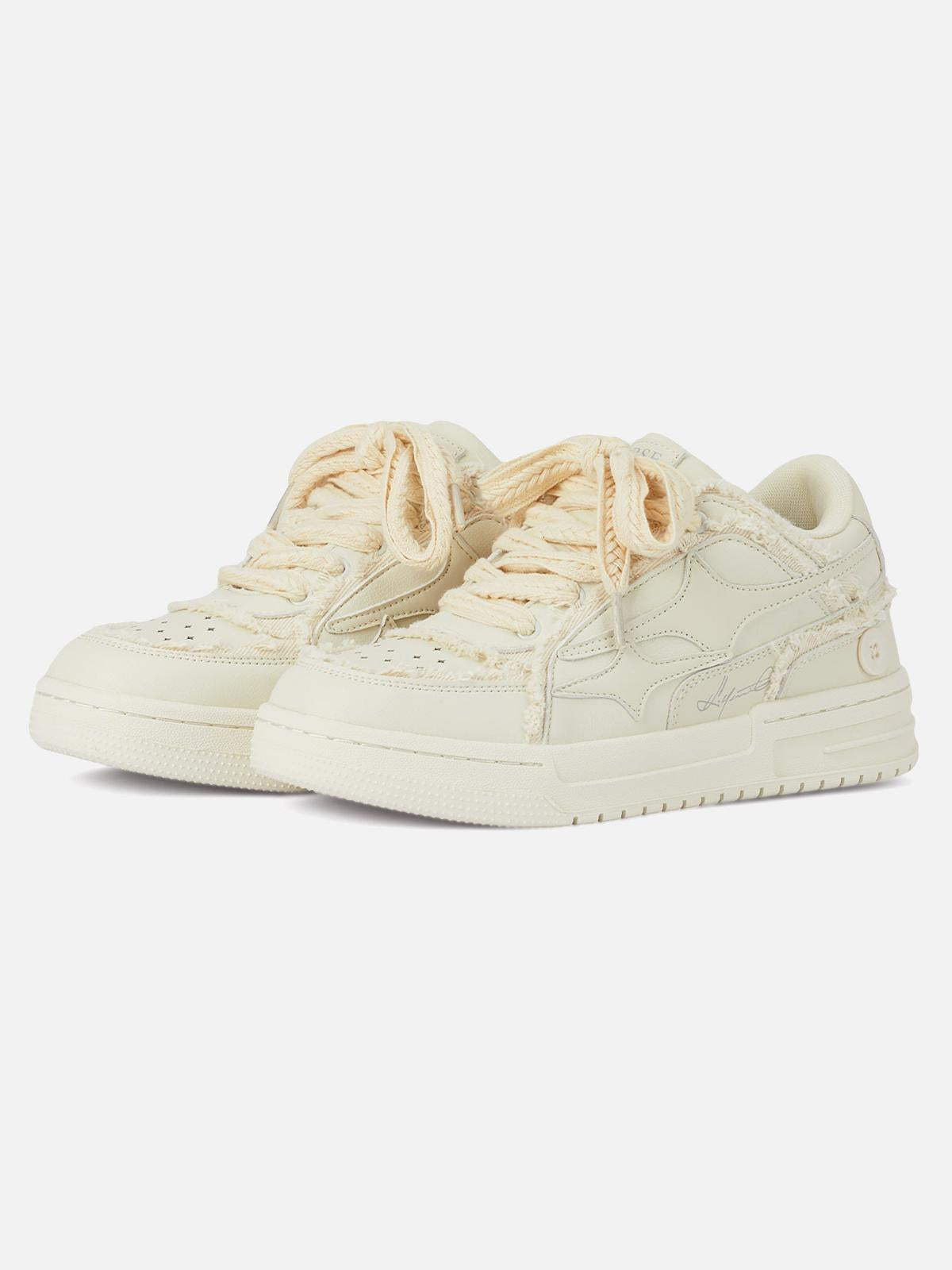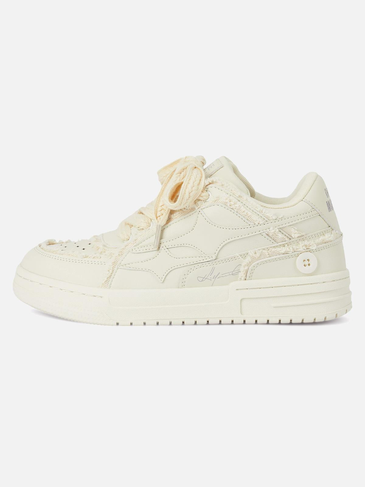 White board shoes crafted from premium leather, featuring a perforated design for breathability and style. With a low-top silhouette and chunky sole, they offer comfort and a subtle height boost, perfect for casual wear and urban street style. Lace up these essentials to dominate the streets this Spring/Summer.