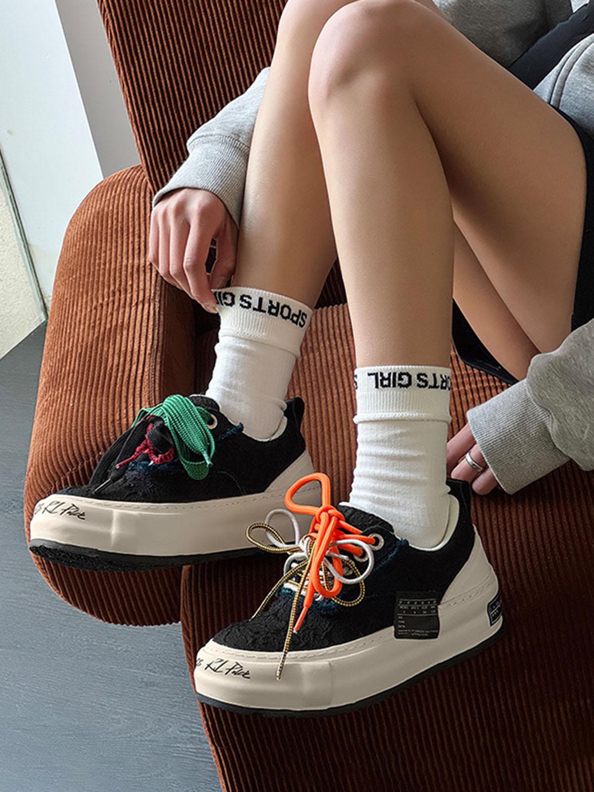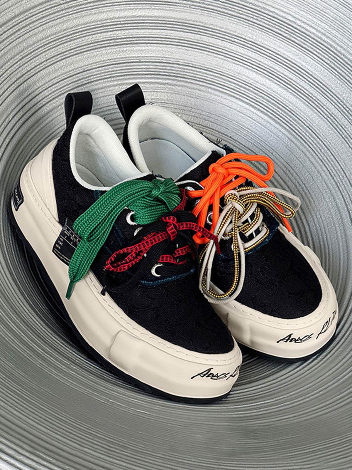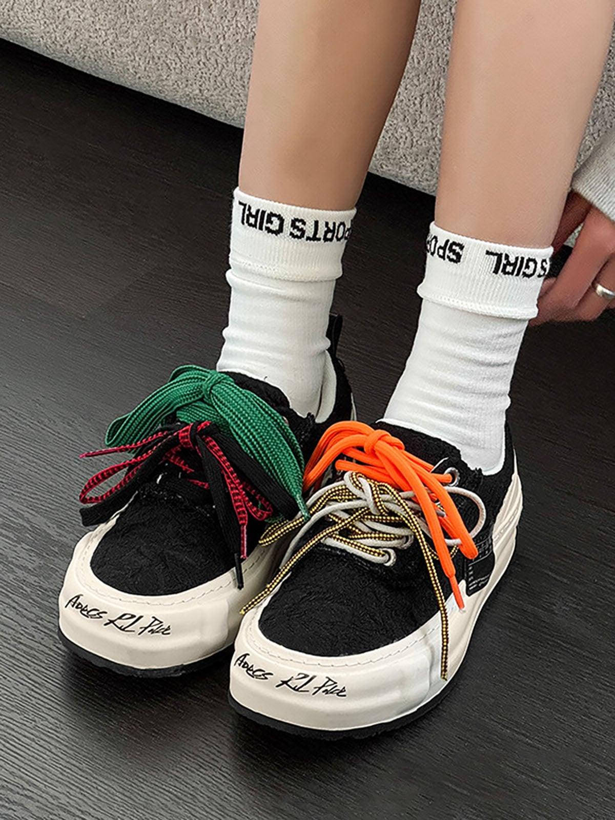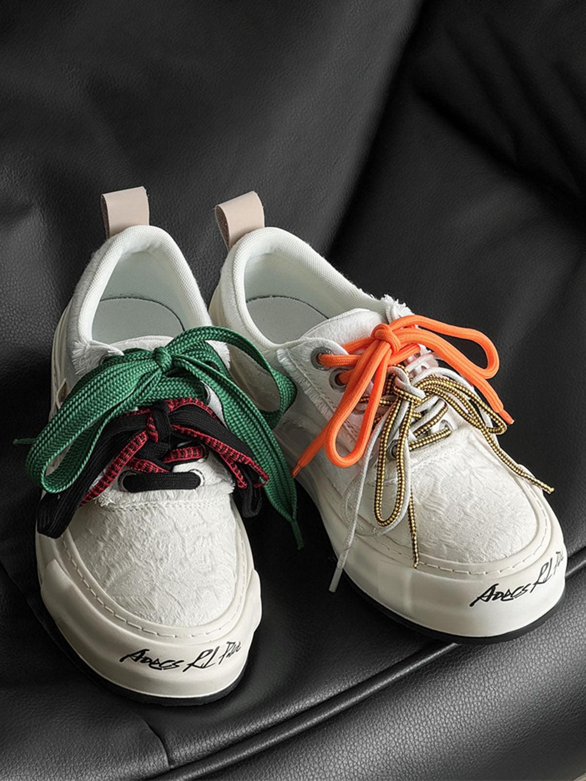 Colorful Lace-Up Sneakers from TALISHKO bring vibrant flair to spring, summer, and fall. Perfect for casual outings and street style events, these kicks feature eye-catching multi-colored laces, a layered tongue design, and a distinctive side label. Enjoy a comfortable fit with a supportive sole that keeps you going all day. Their versatile design effortlessly complements any streetwear vibe.