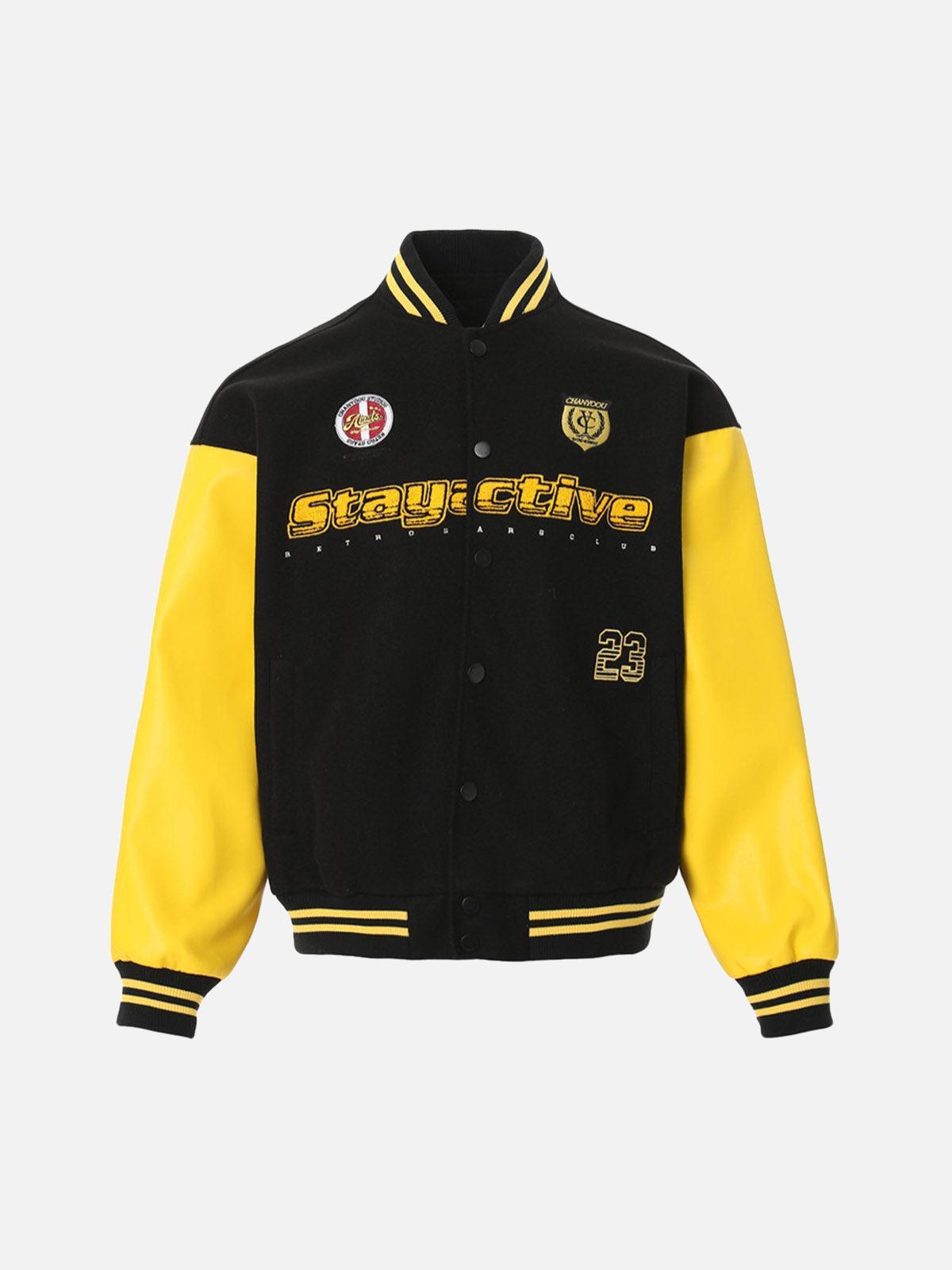 Turn heads with this bold varsity jacket, where retro vibes meet modern streetwear fashion. The striking black body juxtaposed with vibrant yellow sleeves brings a fresh twist to classic athletic style, making it perfect for y2k outfits. Its intricate embroidered patches and sleek button-up front add a touch of authenticity, while the ribbed cuffs and hem ensure a snug fit in sizes ranging from S to XL. Whether you’re rocking it in black, blue, or beige, pair it with your favorite jeans for effortless outfit ideas. Embrace the streets with confidence and make this piece your own.