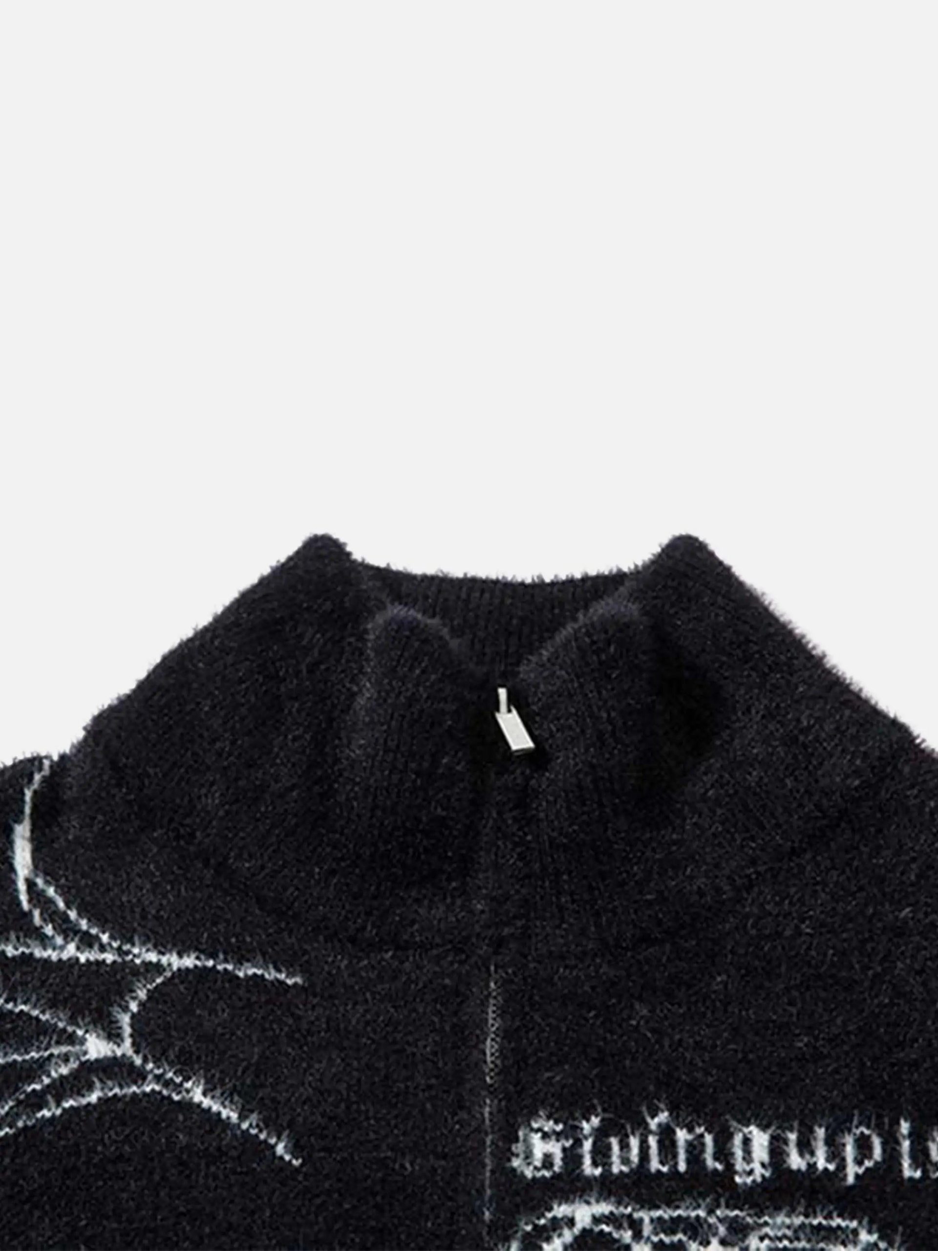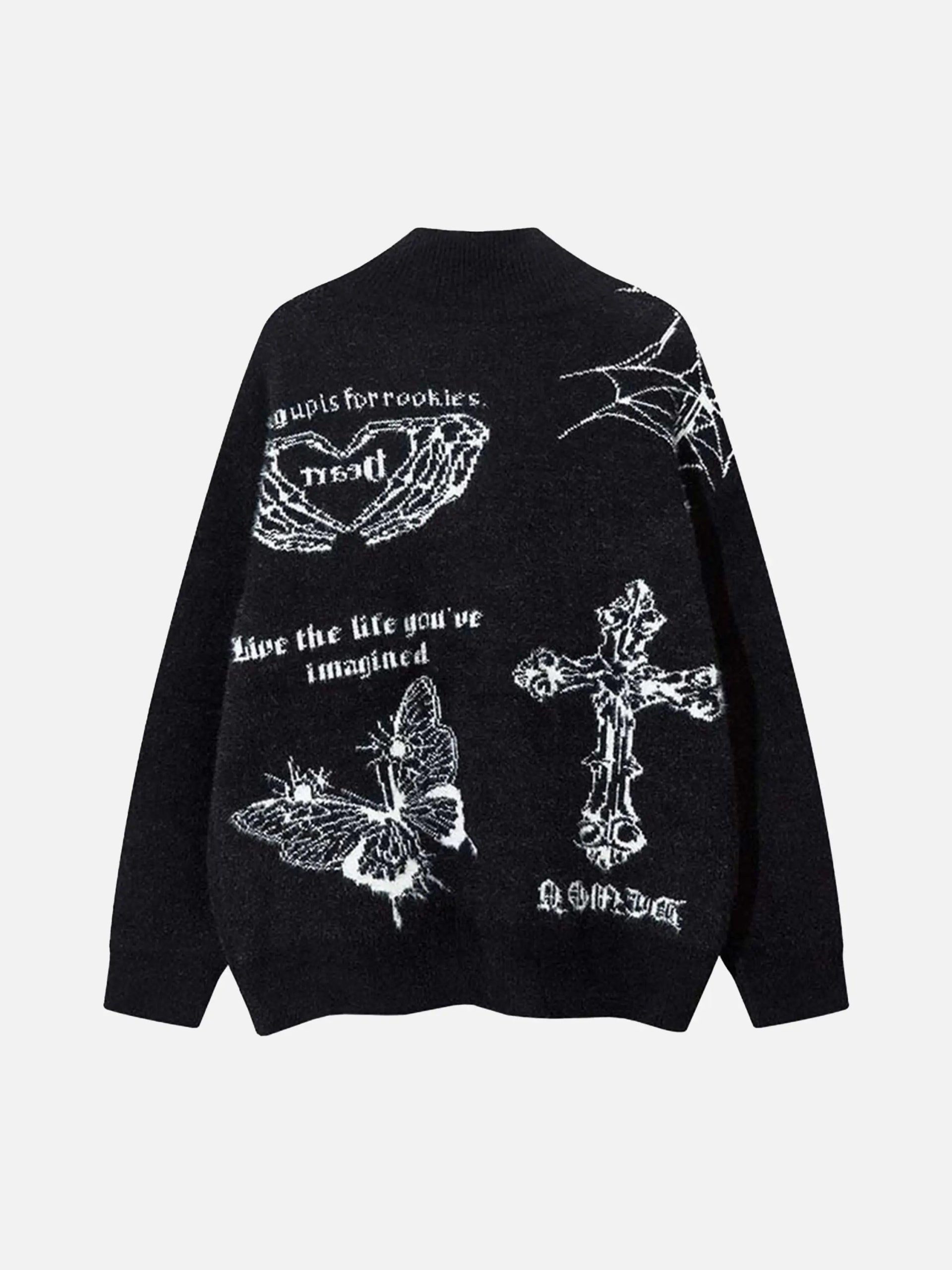 Break the mold with this edgy zip-up sweater, showcasing intricate white graphics that pop against a bold black backdrop. The detailed designs include gothic crosses and striking butterflies, weaving a narrative of fearless streetwear fashion. Crafted for those who defy the ordinary, this piece offers a relaxed fit in sizes ranging from S to XL, ensuring comfort and style. Whether you choose classic black or crisp white, this sweater becomes a canvas for your unique outfit ideas. Pair it with distressed jeans or layer it over a Y2K-inspired look for effortless urban vibes. Ready to redefine your wardrobe?