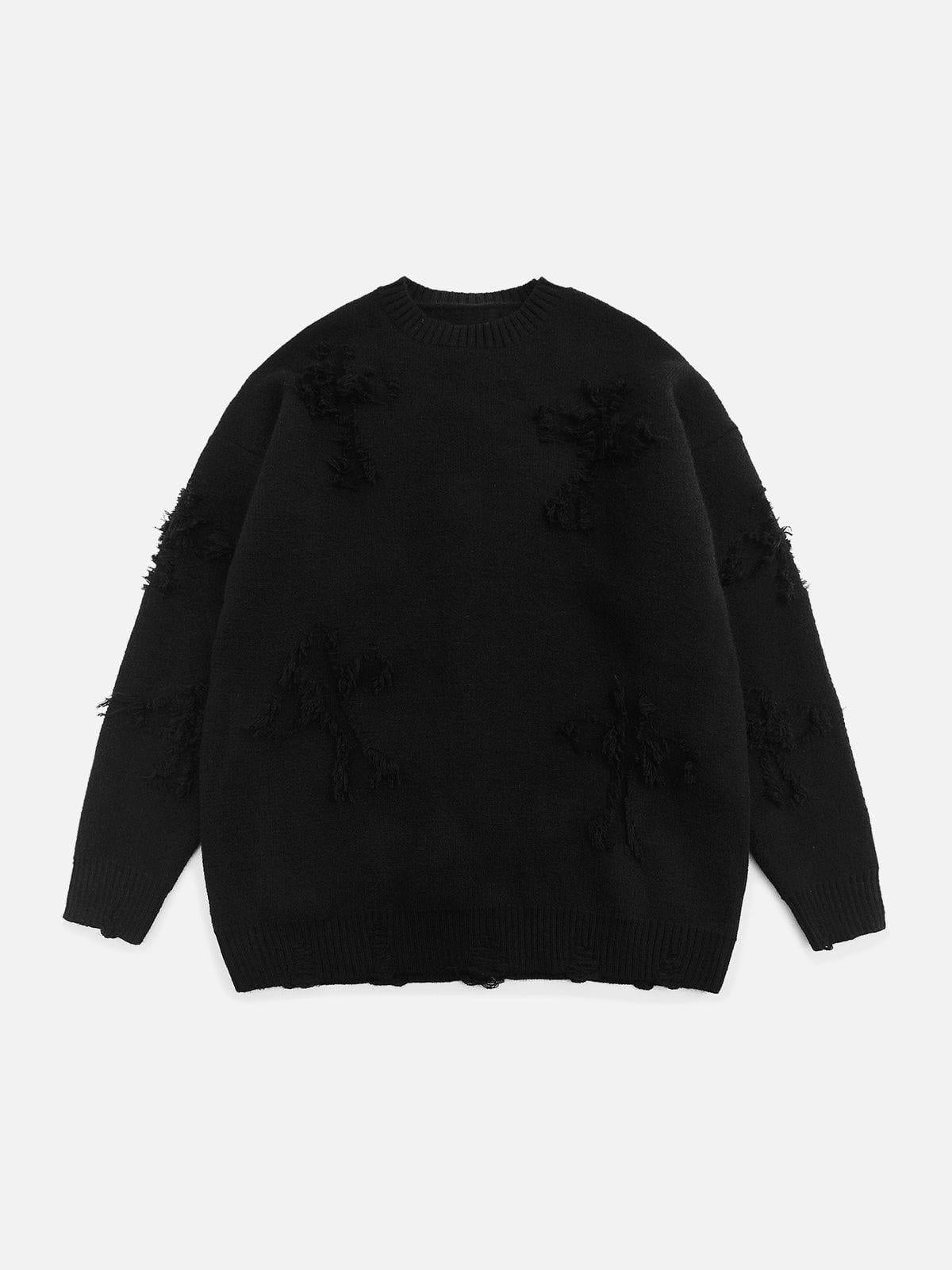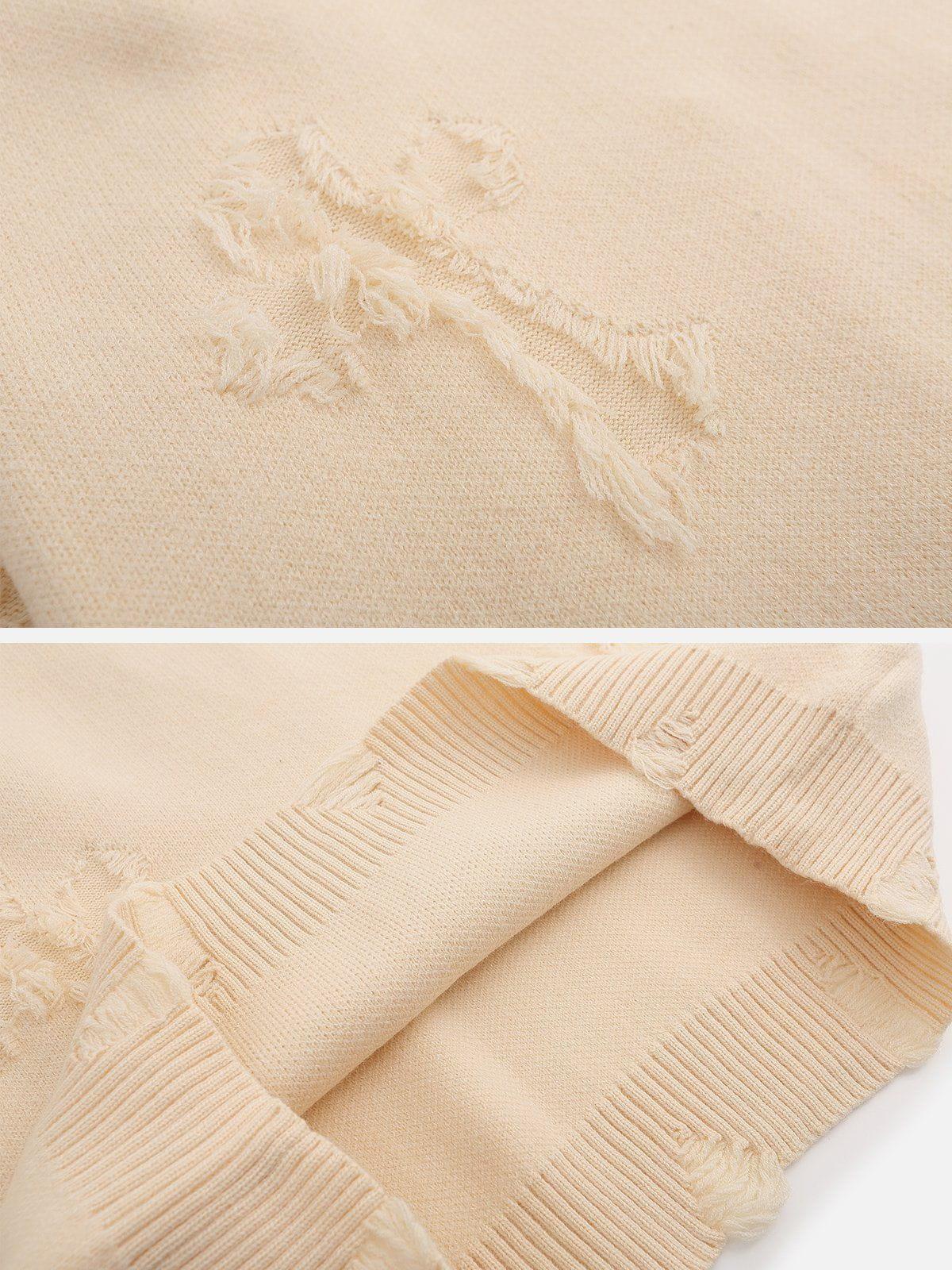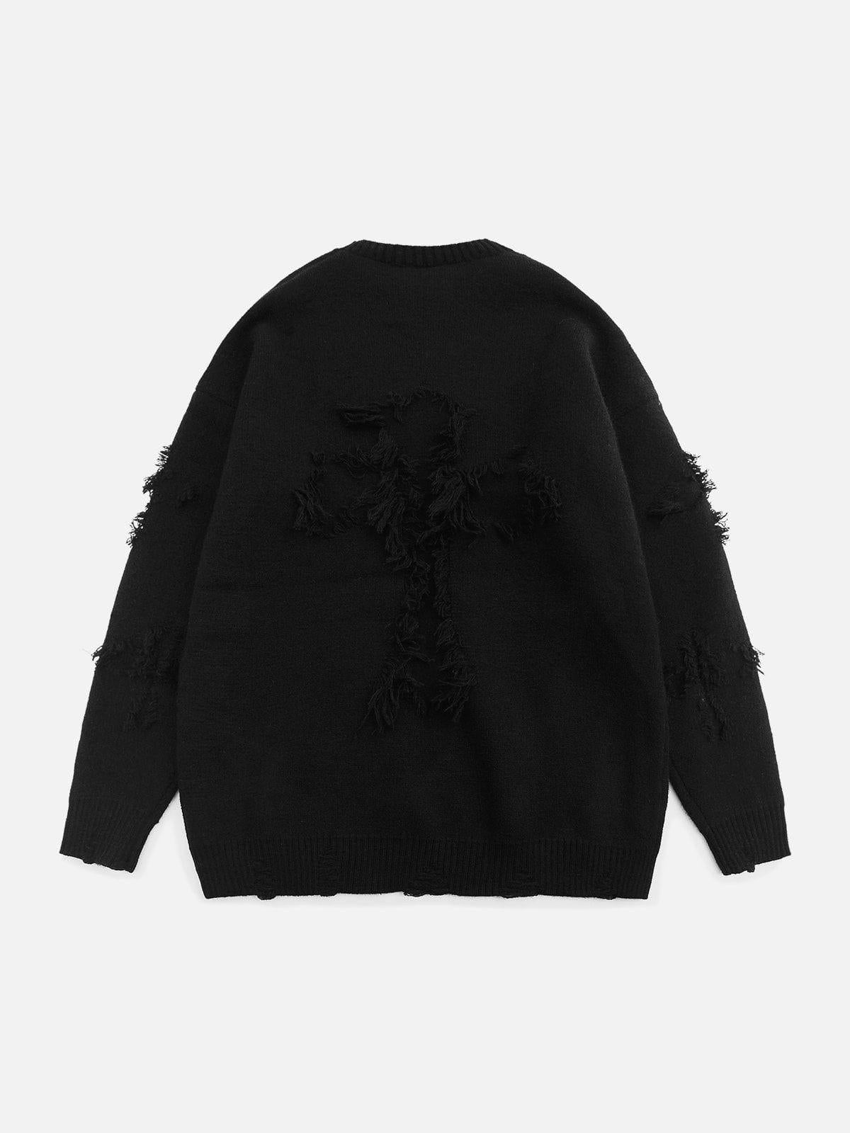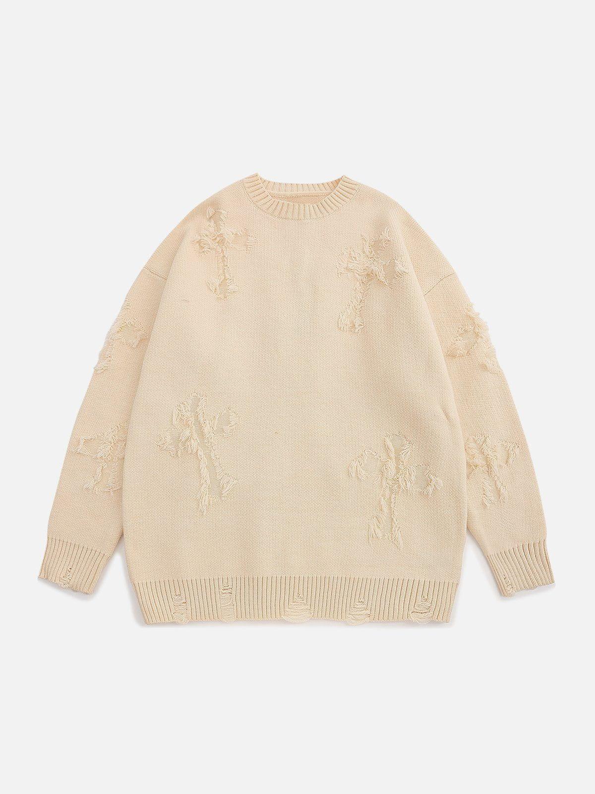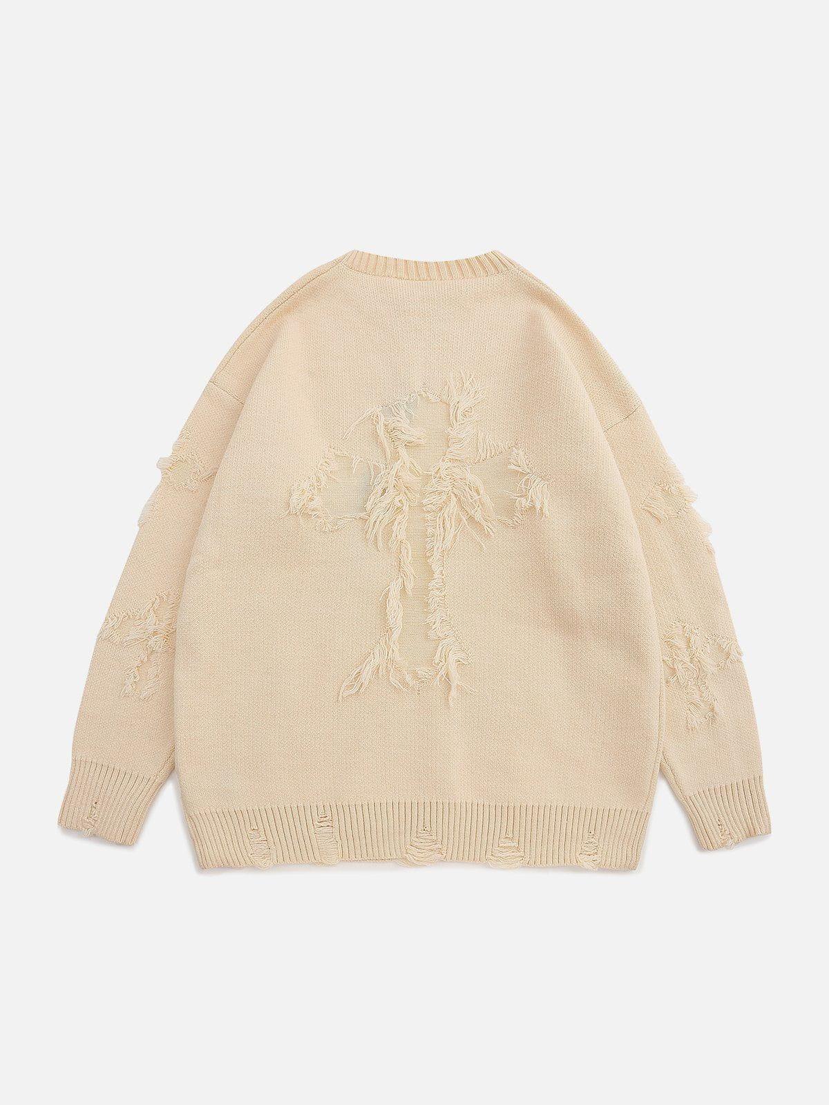 Push the boundaries of streetwear fashion with this edgy knit sweater, featuring bold, distressed cross designs that redefine urban style. Its textured surface in muted gray, black, and apricot offers a versatile palette, perfect for layering with your favorite y2k outfits. The relaxed fit ensures comfort across a range of sizes from S to XL, making it an effortless choice for any wardrobe. Pair it with your go-to jeans or joggers for an outfit that speaks volumes without saying a word. Embrace the vibe and let your style do the talking.