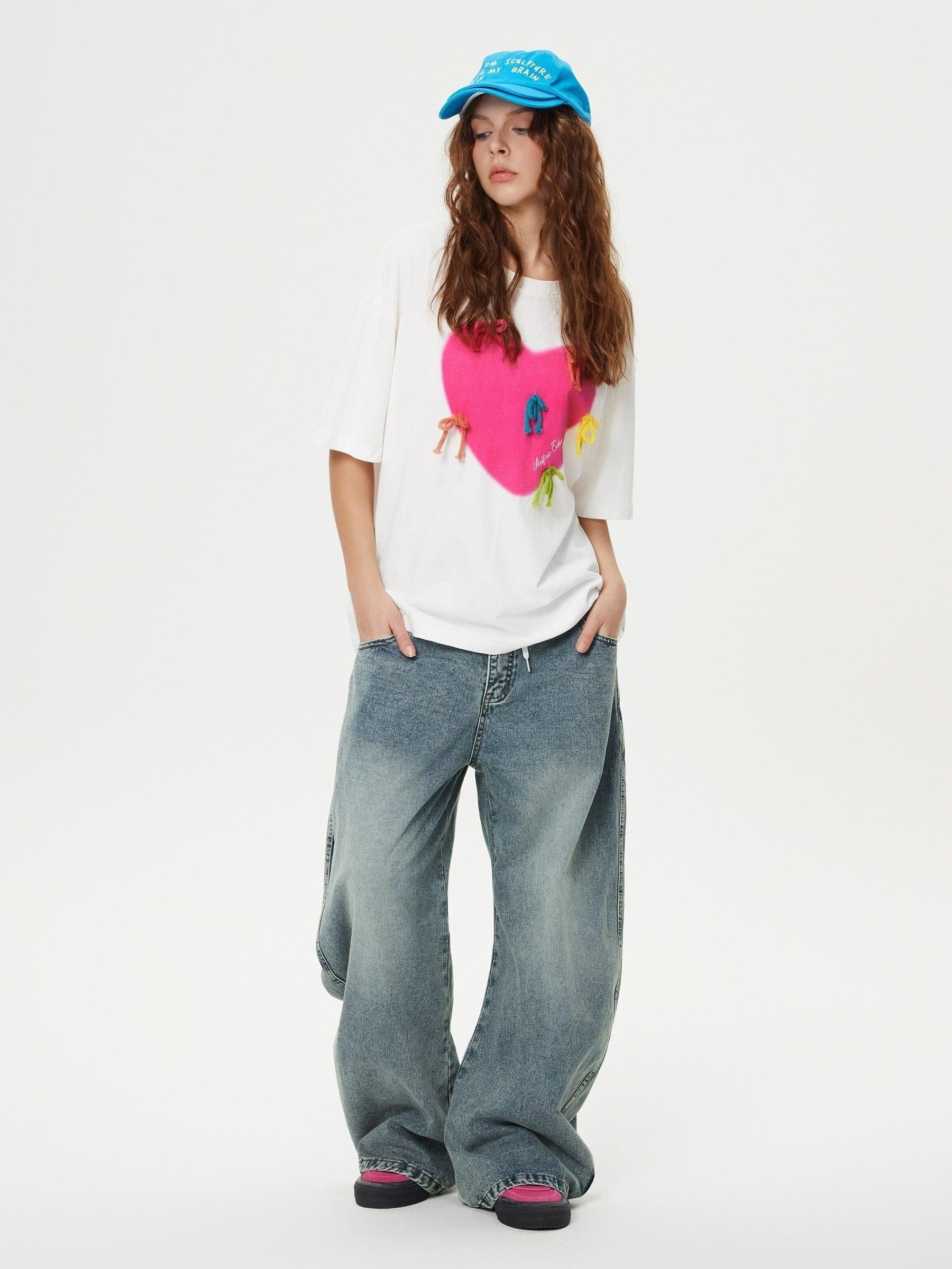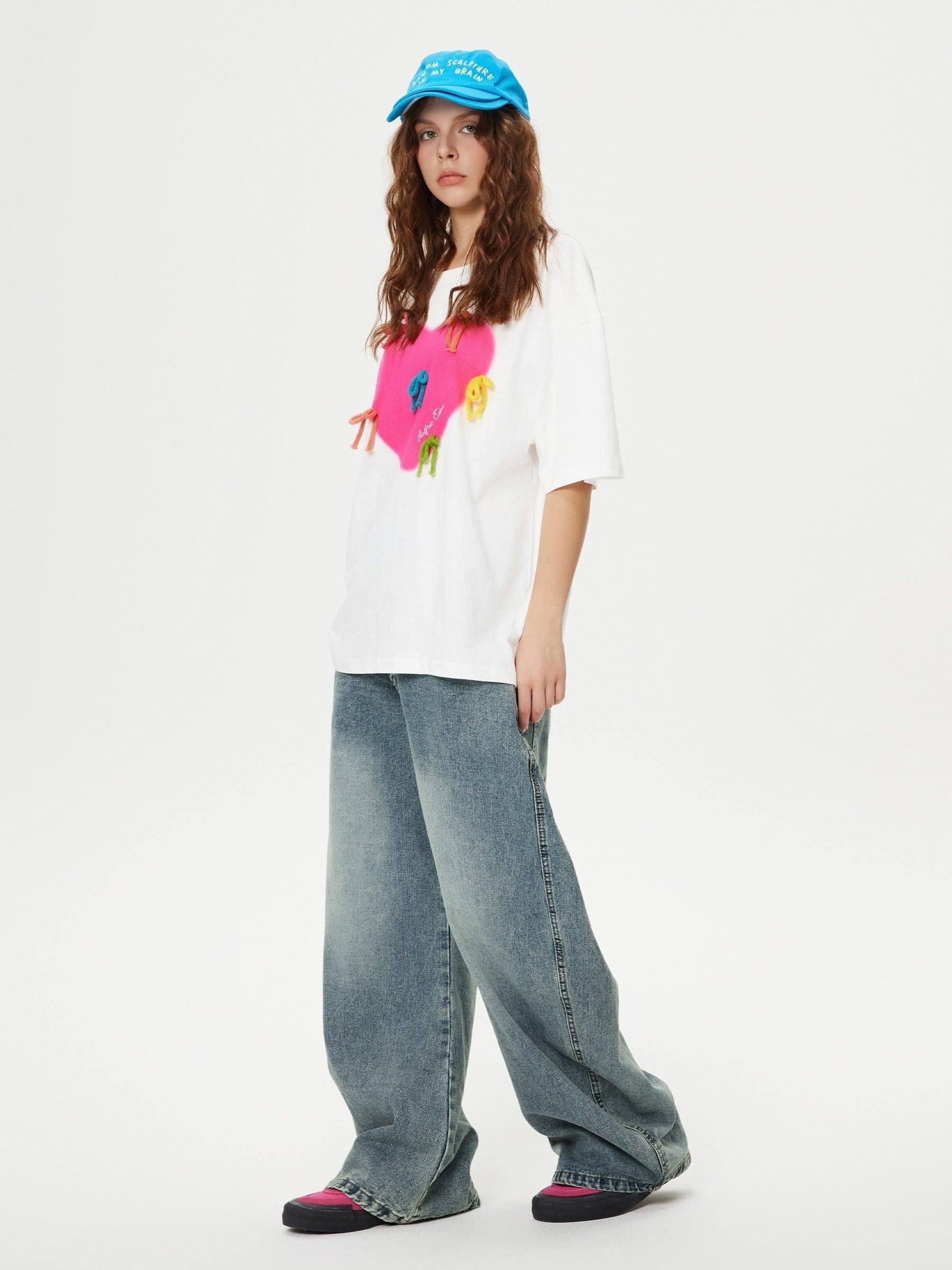 Redefine the vibe with a bold burst of color and attitude in every stitch. This oversized tee flaunts a vivid pink heart graphic that stands unapologetically against a crisp white backdrop, while playful, multicolored accents add a twist of urban flair. Available in versatile shades of blue and black, it invites you to mix and match with your favorite streetwear pieces. With sizes ranging from XS to XL, its relaxed fit ensures comfort without compromising on style. Pair it with distressed denim or layer it under a sleek jacket for endless outfit inspo that speaks volumes. Embrace your unique style and let this piece be the centerpiece of your next y2k outfit.