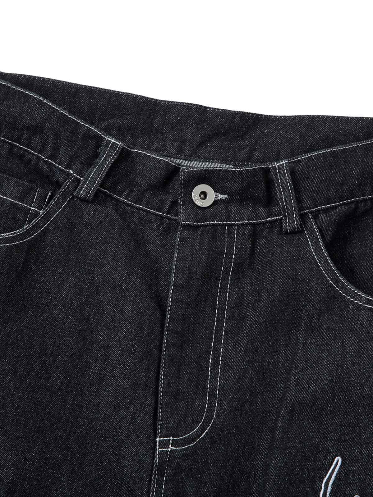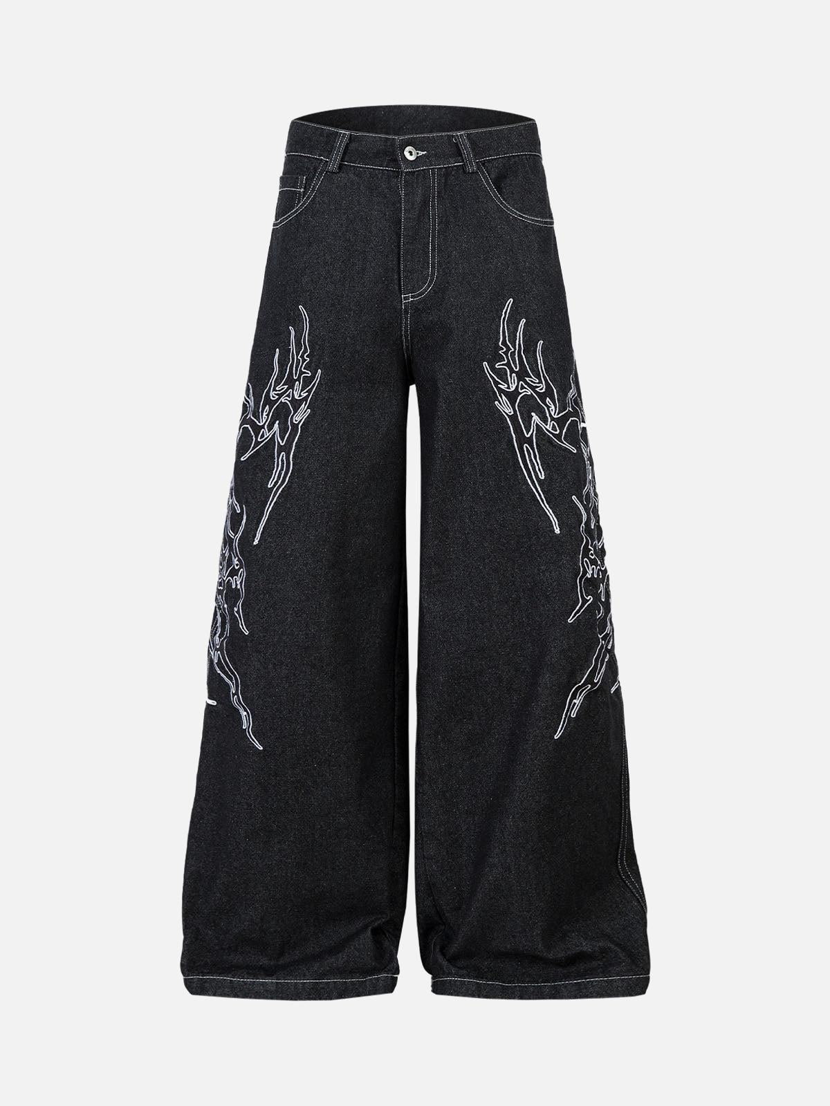 Unleash your wild side with these bold, black wide-leg pants featuring striking white skeletal designs that scream edgy sophistication. Crafted for those who dare to stand out, the intricate embroidery contrasts sharply against the deep black, creating a visual masterpiece that’s perfect for any urban jungle. With a relaxed fit that offers comfort and style, these pants are available in sizes M, L, XL, and 2XL, ensuring everyone can find their perfect match. Pair them with a fitted tee and chunky sneakers for that ultimate y2k look. Ready to redefine your streetwear fashion? Step into these and own the scene.