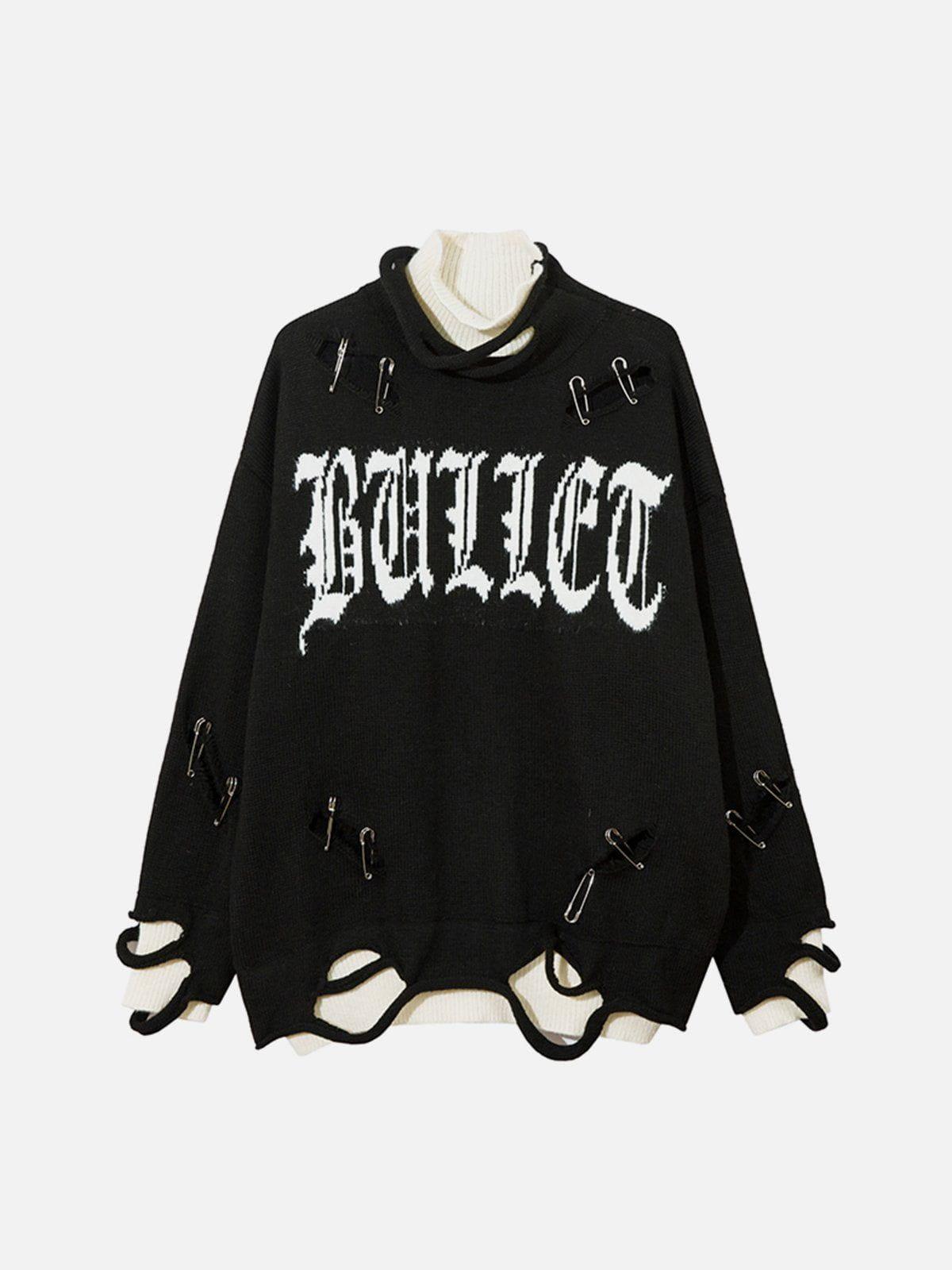 Embrace the edge with this unapologetically bold sweater that screams urban rebellion. The oversized fit drapes effortlessly, offering comfort and style in every stitch. Its deep gray hue, offset by stark black safety pin accents and distressed detailing, creates a gritty yet refined aesthetic that’s perfect for any streetwear fashion aficionado. Layer it over a crisp white tee to let the graphic lettering pop, or pair it with ripped jeans for those iconic y2k outfits. Available in sizes S to XL, this piece transforms any look with its dynamic textures and fearless vibe. Gear up and redefine your wardrobe’s limits.