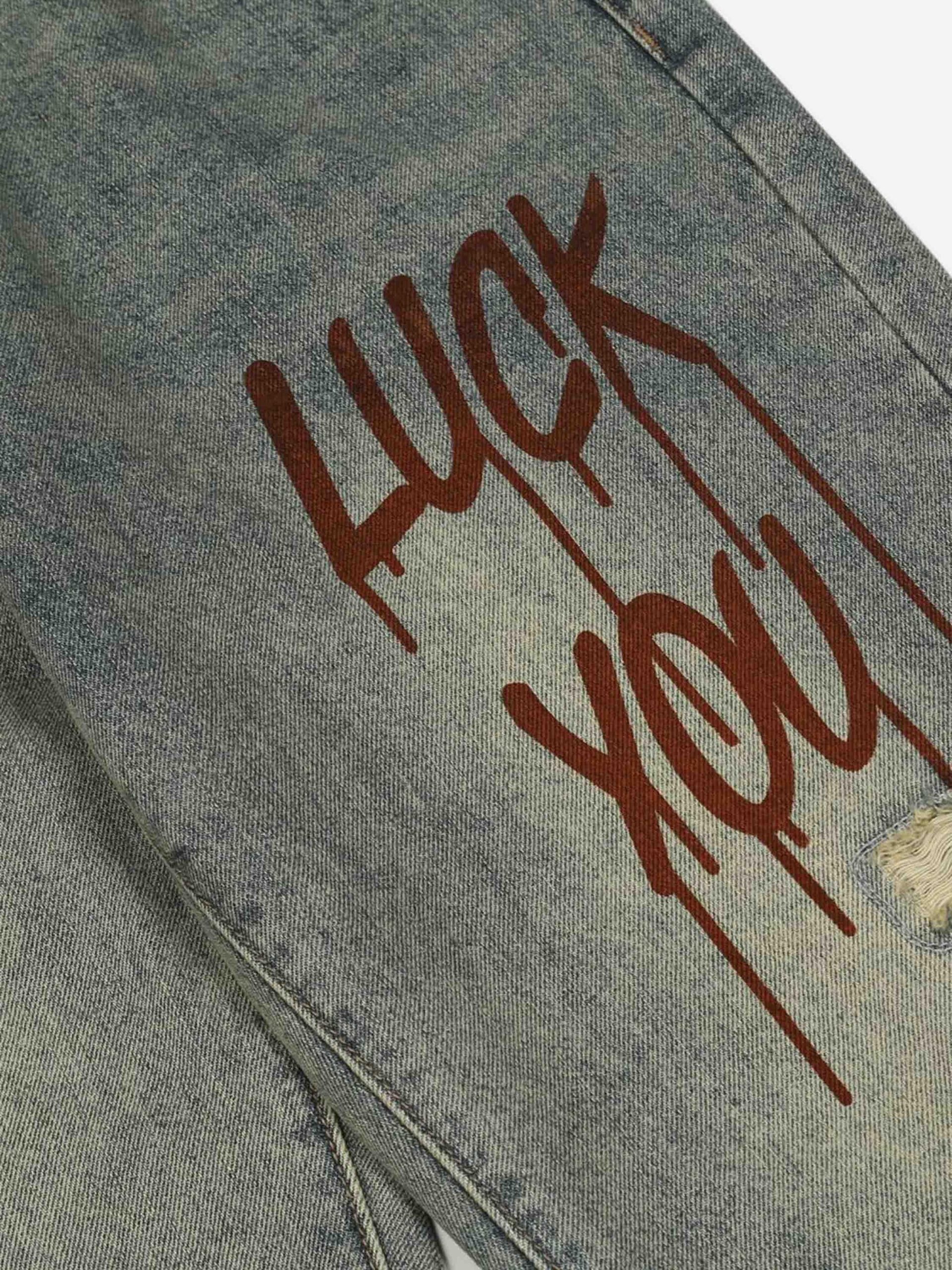 Dare to redefine streetwear fashion with these bold jeans that scream rebellion and creativity. The distressed denim, paired with the edgy ‘SOME FOR LUCK YOU’ graphic, offers a gritty aesthetic perfect for those who live on the edge. Available in a versatile blue hue and sizes ranging from M to 2XL, these jeans are designed for a relaxed fit that complements any y2k outfit. The textured patches and frayed details add a unique touch, making them an absolute essential for your next outfit inspo. Slide into these jeans and let your style speak volumes.