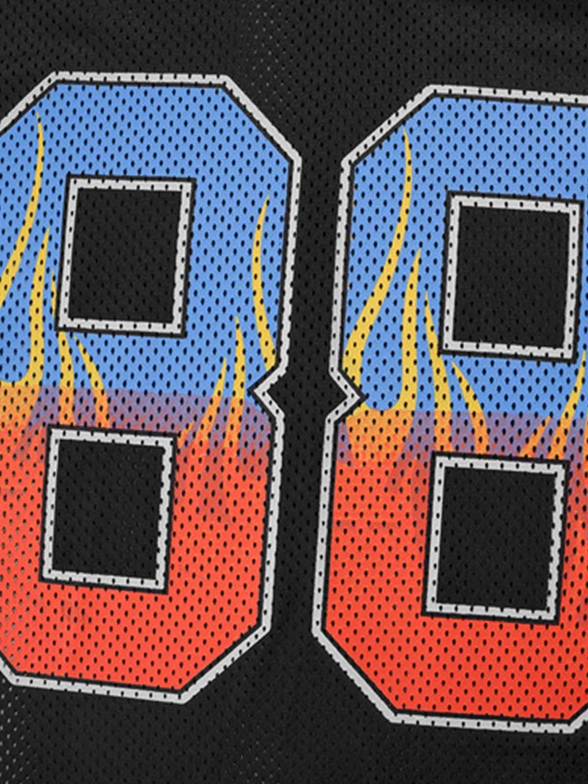 Ignite your summer style with this explosive jersey that blends retro vibes and modern flair, perfect for those who live life in the fast lane. The bold black mesh sets the stage, while vibrant blue sleeves with fiery yellow flame accents and a striking star detail command attention. The oversized ’88’ in red and white on the front is more than just a number; it’s a shout-out to fearless individuality. Available in M, L, and XL, this piece offers a relaxed fit that keeps you cool and confident. Pair it with ripped jeans or shorts for an effortlessly edgy look. Ready to turn heads?