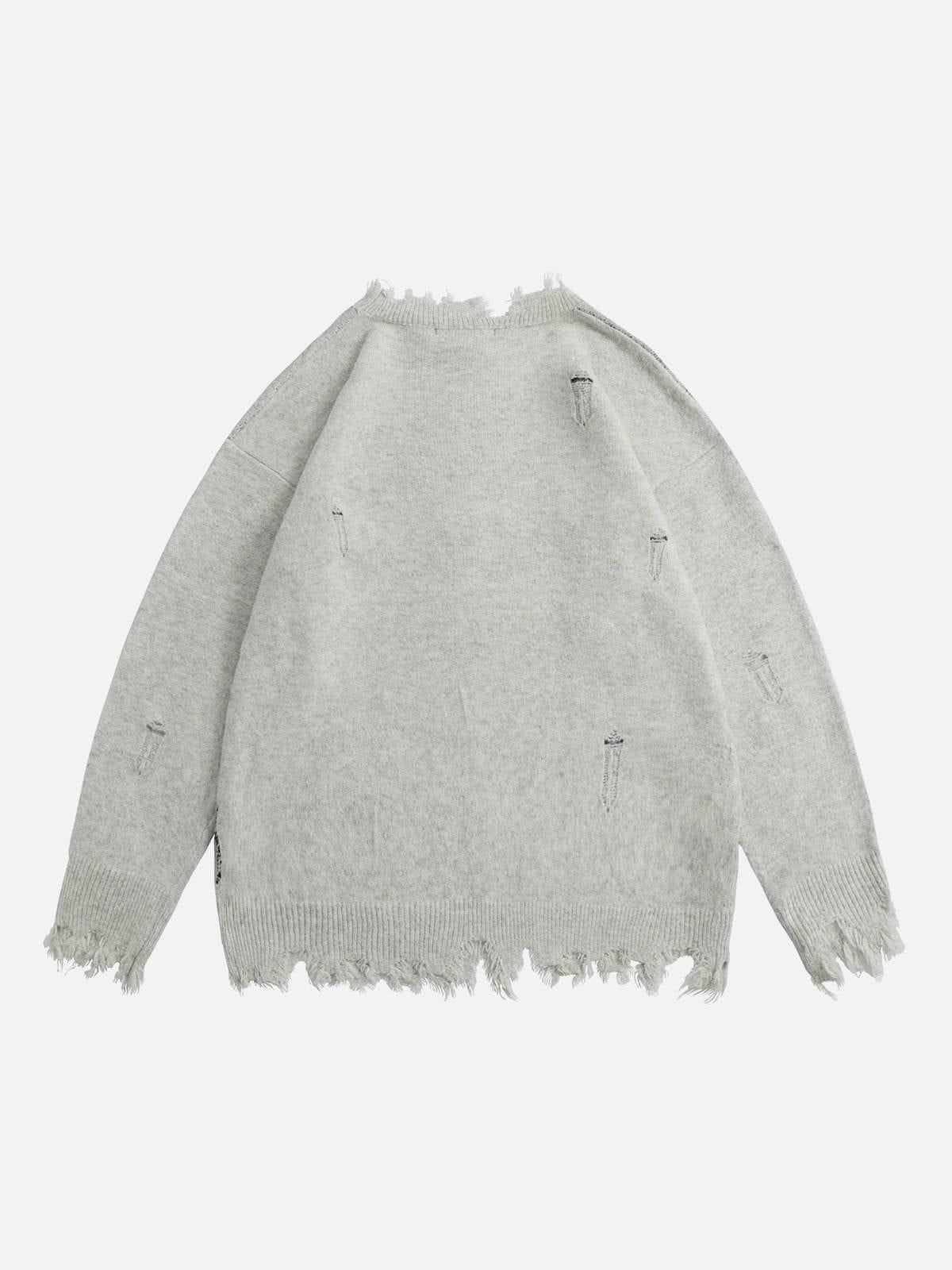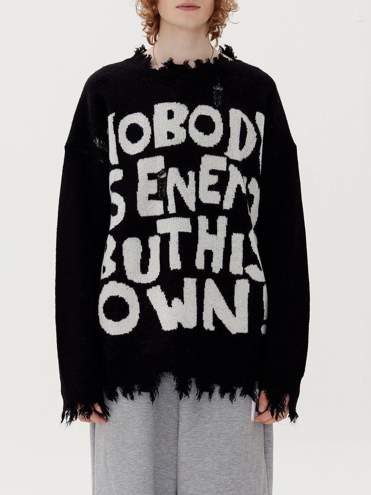 Challenge the ordinary with this edgy knit sweater, where bold graphics meet distressed detailing for a raw, urban vibe. The statement-making black text on a versatile gray backdrop commands attention, while the frayed edges add a rebellious touch to your streetwear fashion arsenal. Designed for a relaxed fit, this piece is perfect for layering over your favorite tees, and is available in sizes S, M, and L, ensuring a fit that suits your style. Whether you’re drawn to the timeless appeal of gray, the understated elegance of apricot, or the classic edge of black, this sweater adapts to your wardrobe effortlessly. Embrace the vibe and redefine your outfit ideas with this essential piece.