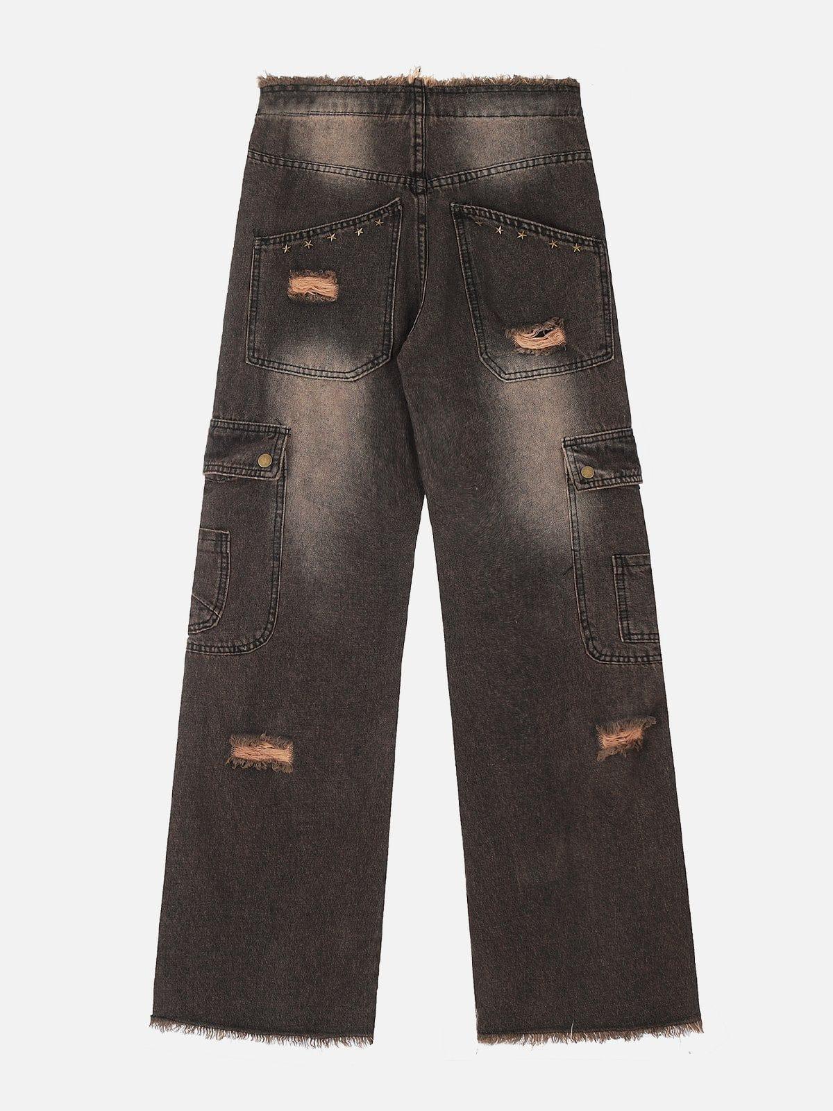 Concert Outfit Multi- Pocket Ribbon Raw Edge Jeans