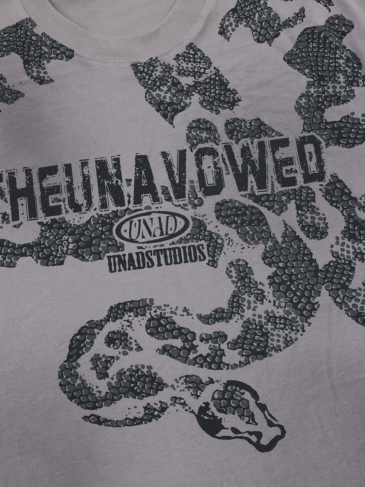 Turn heads with a daring blend of attitude and urban edge in this oversized tee, featuring a striking snake graphic and bold typography across the chest. Perfectly embodying the essence of summer fashion inspo, its soft gray tone provides a versatile base, while the audacious design adds a rebellious flair to any ensemble. Available in both gray and red, and sizes ranging from S to XL, it ensures a relaxed fit for all who wear it. Pair it with sleek joggers or distressed denim for an effortlessly cool summer outfit. Dare to redefine your style with this exceptional piece.
