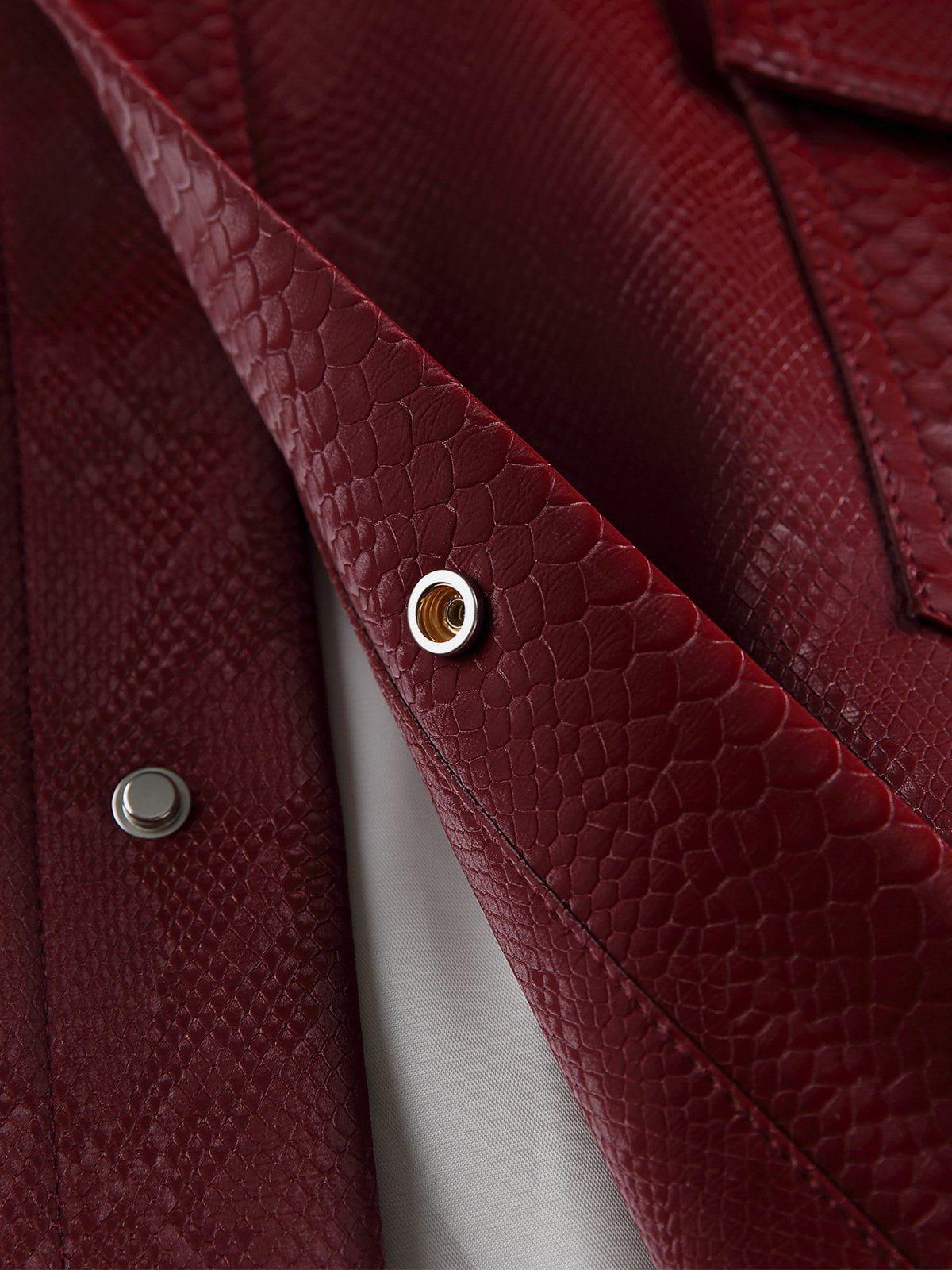 Embrace the urban jungle with this jacket that roars with a fierce snakeskin texture, designed to turn sidewalks into your personal runway. This striking red piece, also available in sleek black, offers a bold twist on classic streetwear fashion, making it a versatile staple for any wardrobe. The structured fit ensures it layers perfectly over your favorite tee or hoodie, while the durable buttons and spacious pockets add both style and practicality. Available in sizes S, M, L, and XL, it’s ready to complement your unique vibe. Pair it with your go-to sneakers and step out with confidence.