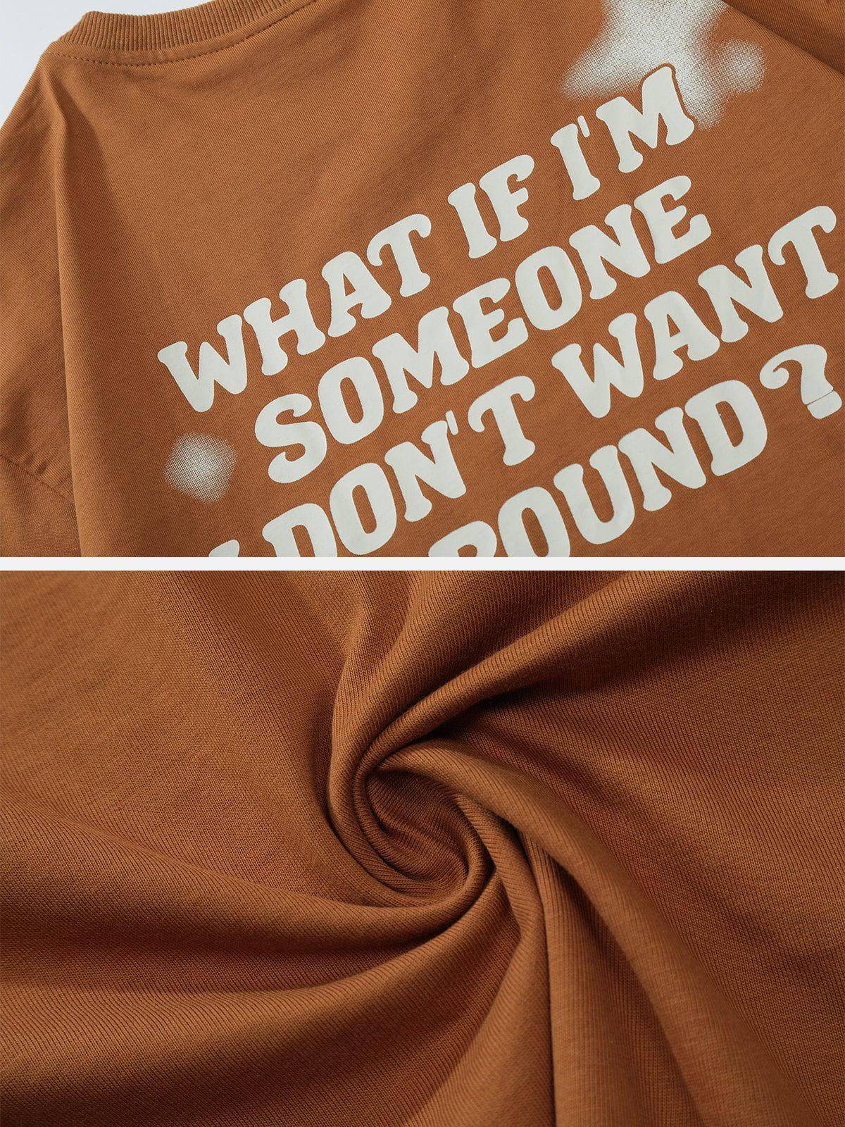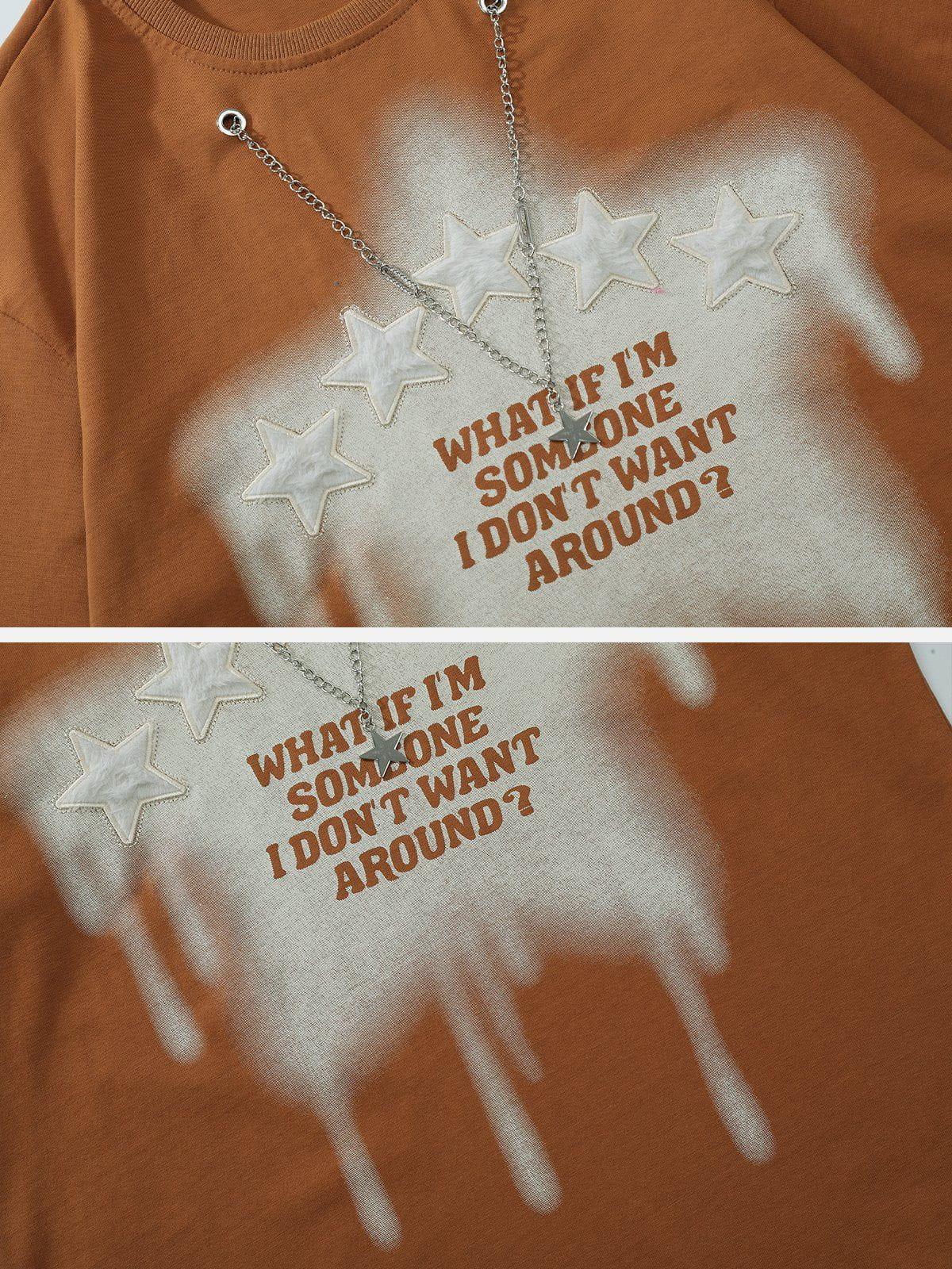 Dare to redefine your summer style with this edgy tee, featuring a striking spray-paint star design and bold lettering that asks, “What if I’m someone I don’t want around?” The rich brown fabric serves as the perfect canvas, complemented by subtle texture and a chain detail for that underground vibe. Available in versatile sizes from S to L, this tee ensures a relaxed fit that pairs effortlessly with your favorite streetwear pieces. Whether you choose classic black, clean white, or this standout brown, each option speaks volumes without saying a word. Embrace the bold and make it yours today.