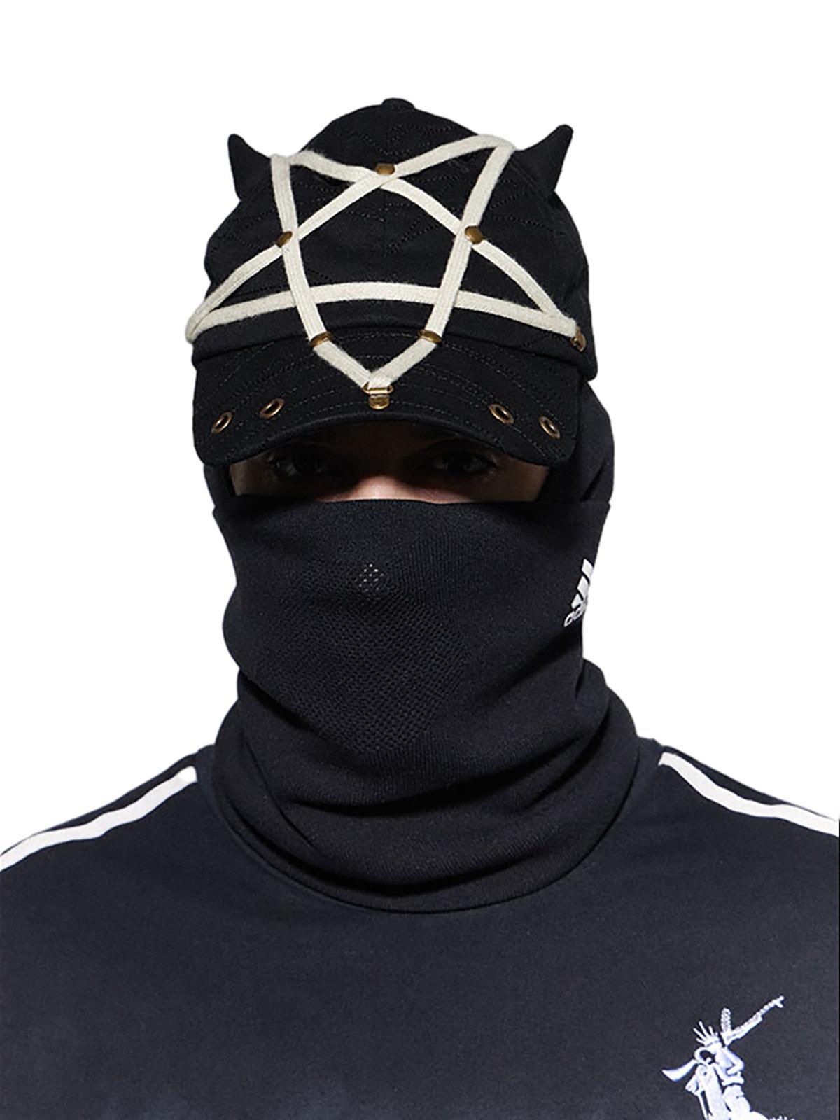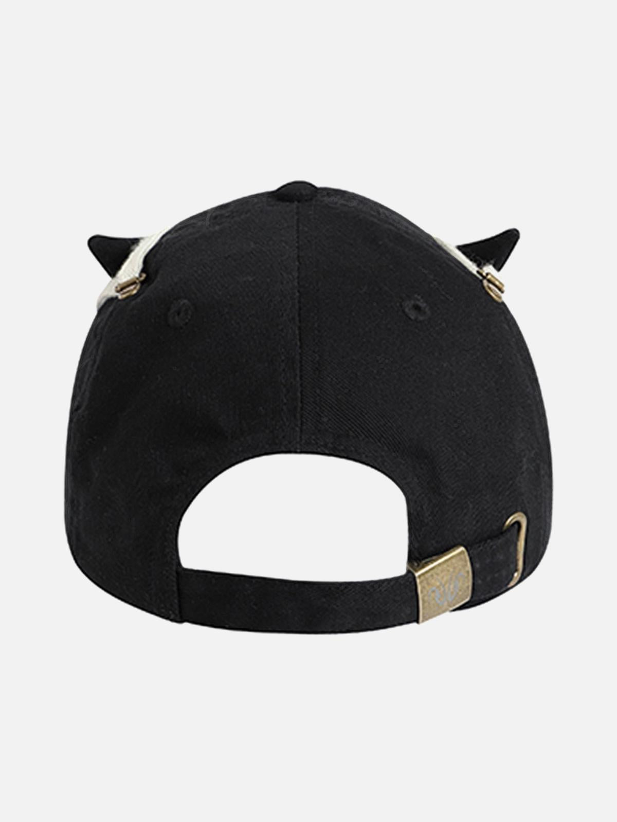 Celebrate your inner rebel with this striking black cap, featuring edgy white strap detailing that forms a bold pentagram pattern across the crown. The unique horn accents add a daring twist, making it the perfect piece for those who dare to push the boundaries of streetwear fashion. Constructed with a comfortable fit in one versatile size, this cap effortlessly complements your favorite Y2K outfits. Pair it with distressed denim and a graphic tee for ultimate outfit inspo. Dare to stand out and make this your go-to accessory.