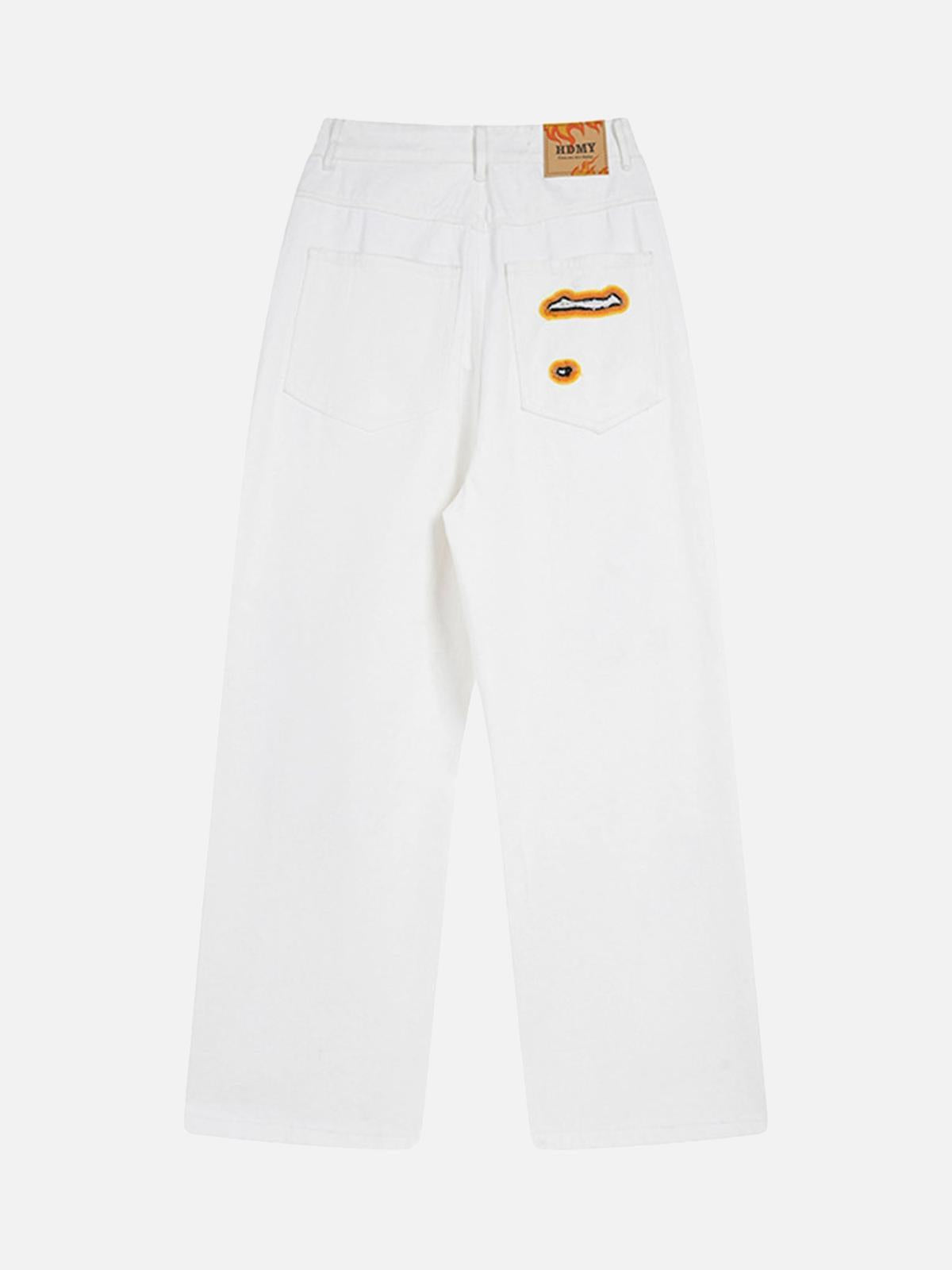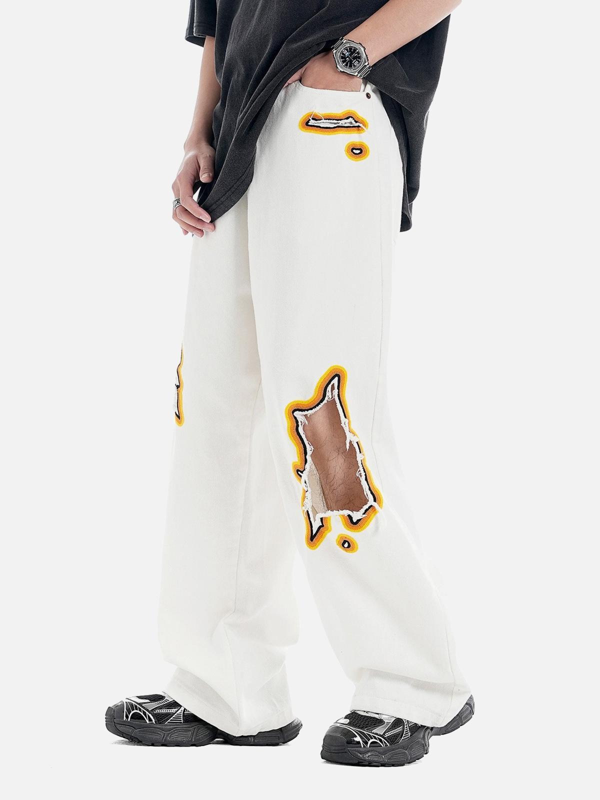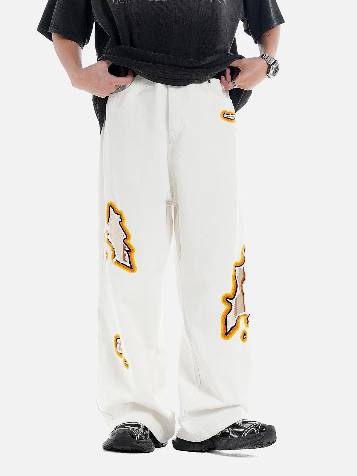 Transform your look with these standout white pants, featuring bold, distressed patches outlined in vibrant orange and black for an urban edge. The relaxed fit offers comfort and versatility, perfect for mixing into your favorite y2k outfits. Available in M, L, and XL, these pants are your go-to for fresh outfit ideas that don’t shy away from making a statement. Pair them with a sleek top and sneakers for an effortlessly cool vibe. Add them to your cart and redefine streetwear fashion today.
