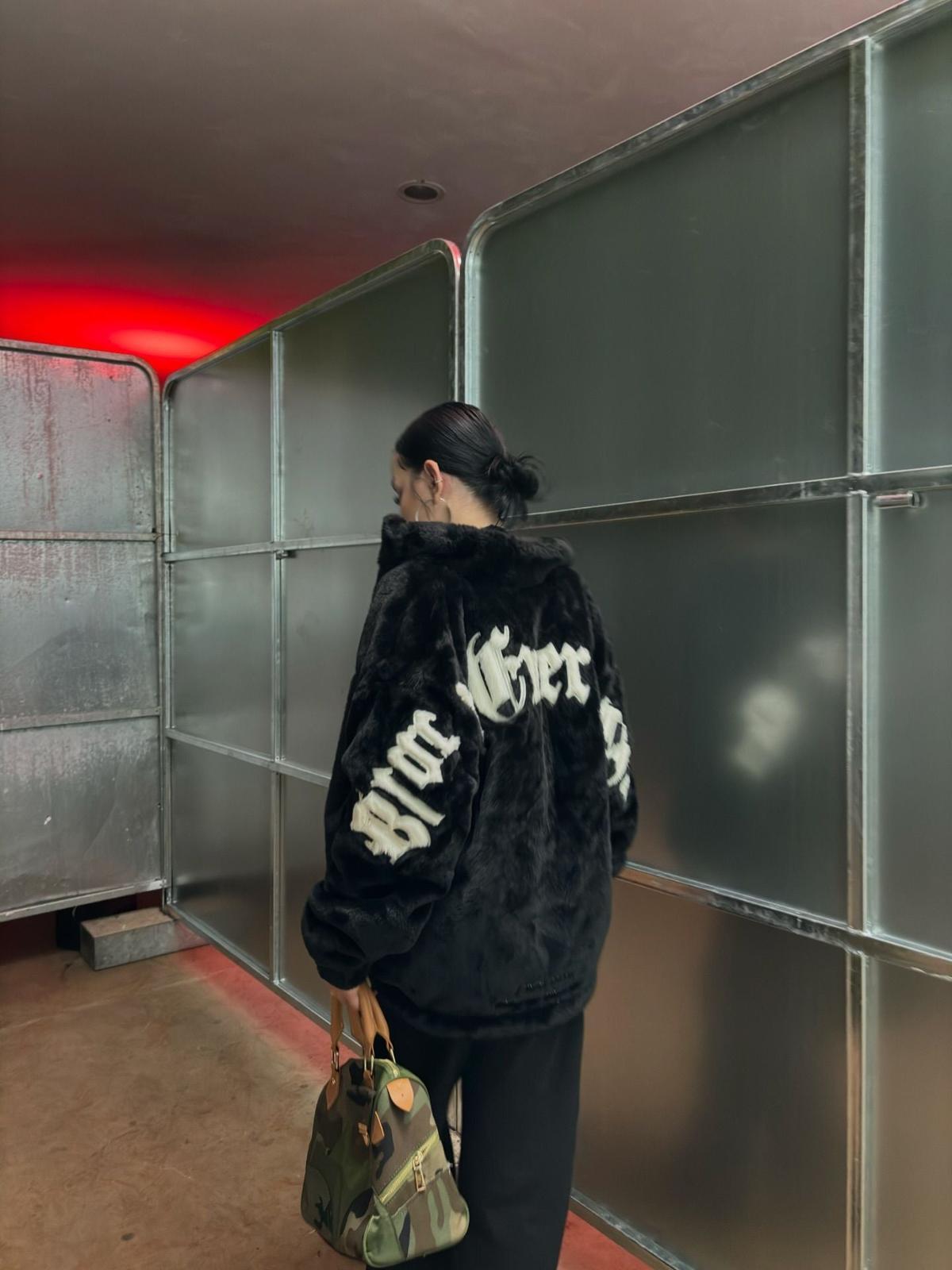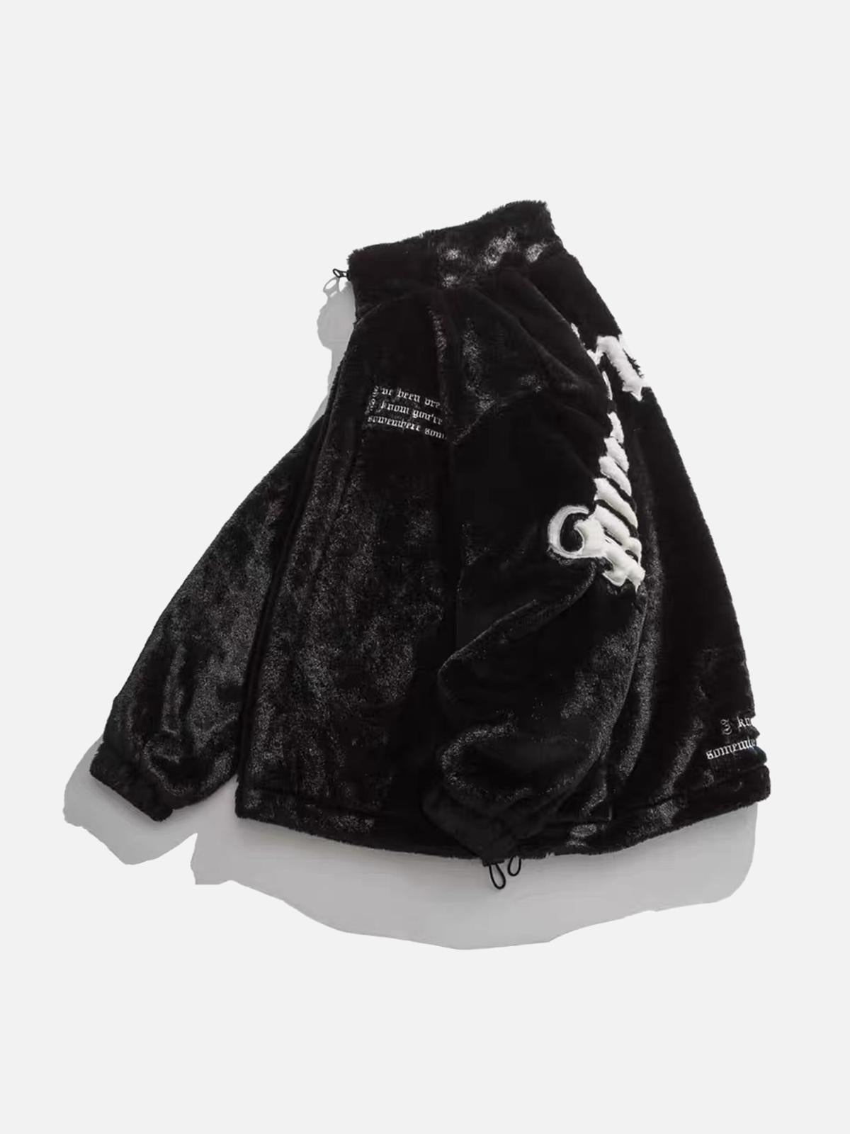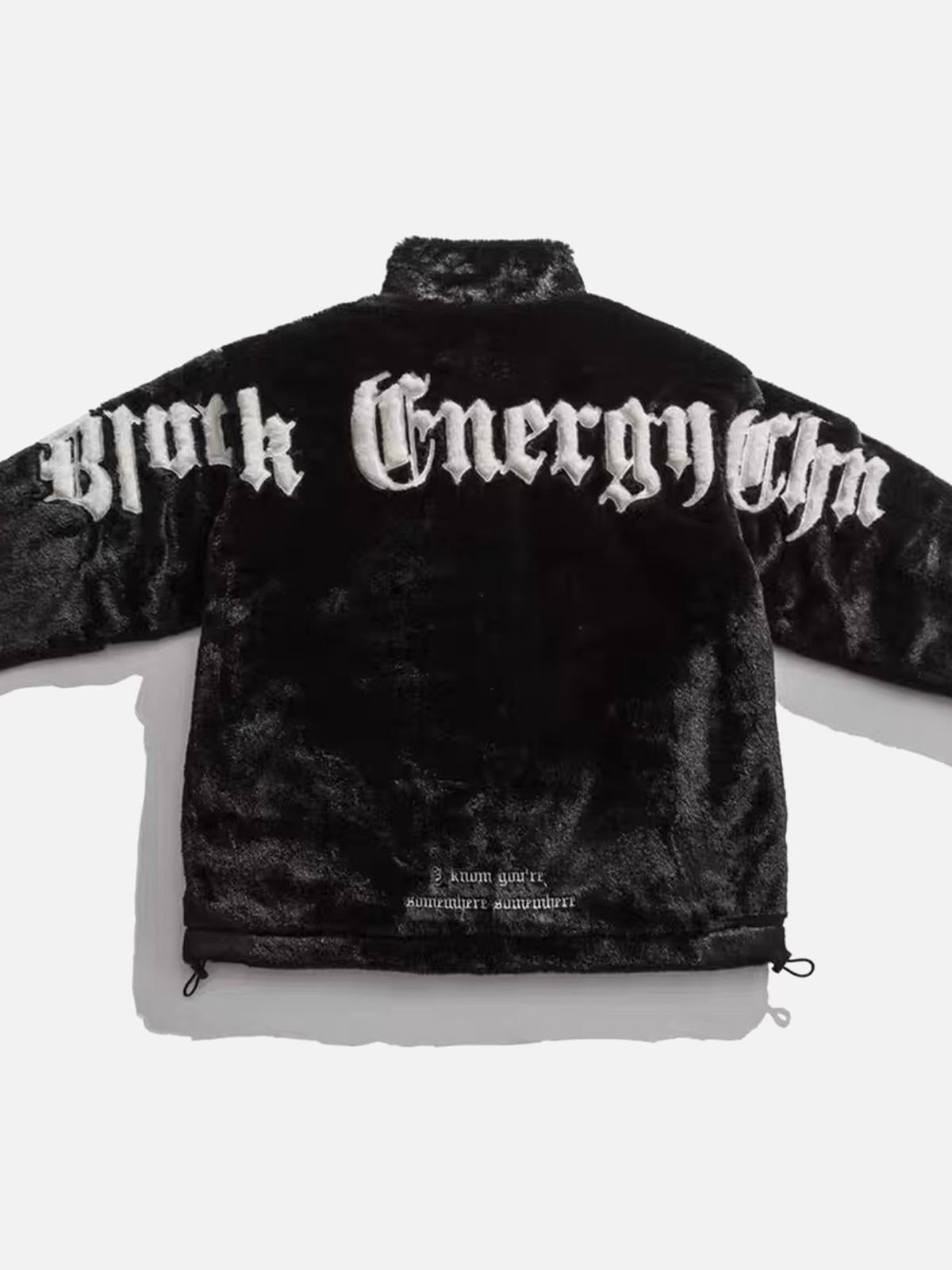 Turn heads with this plush black jacket, designed for those who walk the streets with confidence and flair. Its ultra-soft, velvety texture wraps you in warmth, while bold white lettering on the sleeve and chest adds an edgy contrast that sets you apart. Available in sizes M to 2XL, this piece offers a relaxed fit that’s perfect for layering over your favorite streetwear essentials. Pair it with distressed jeans or cargos for a look that’s straight out of y2k outfits, and let your style do the talking. Grab yours now and redefine streetwear fashion.