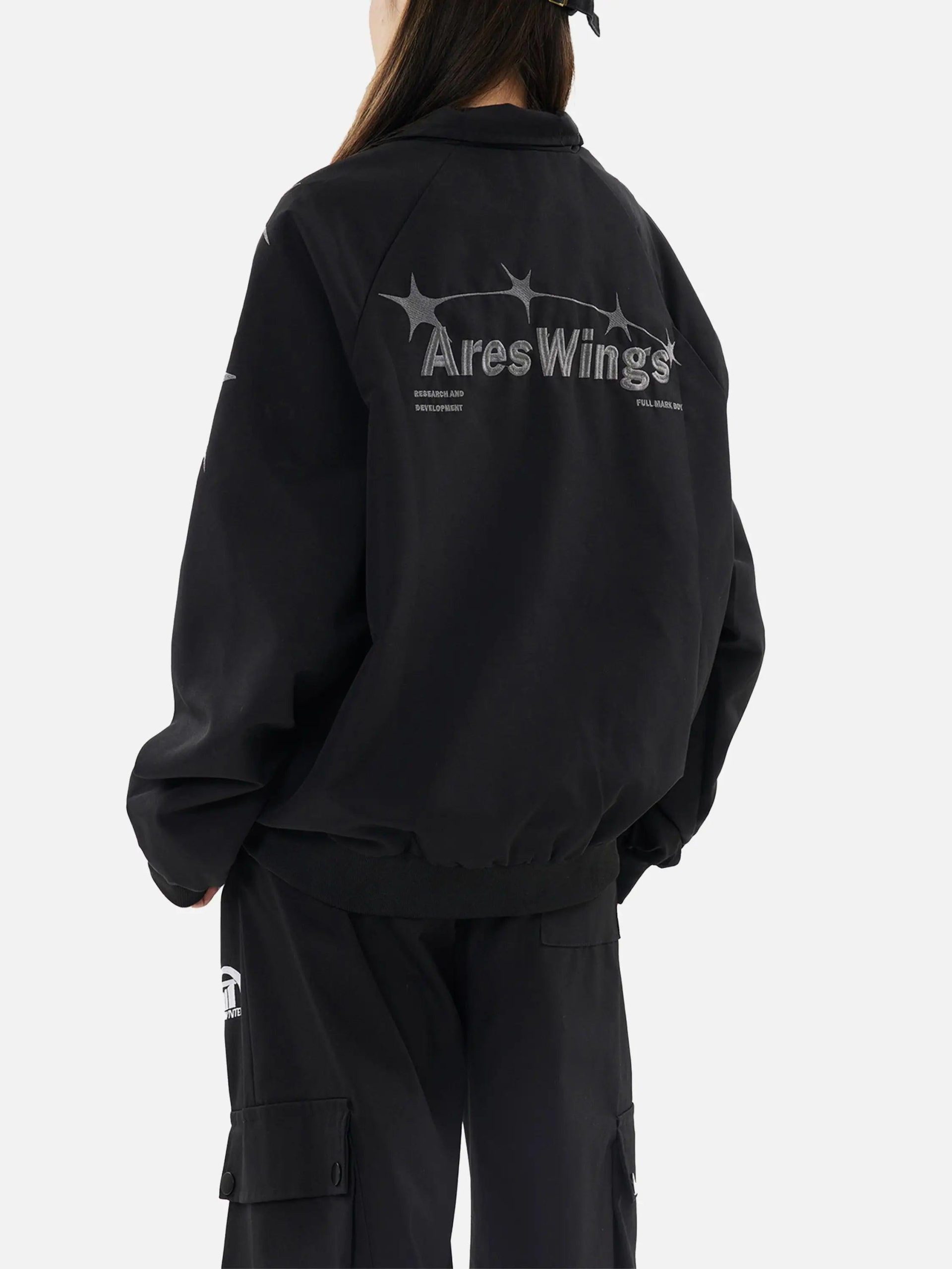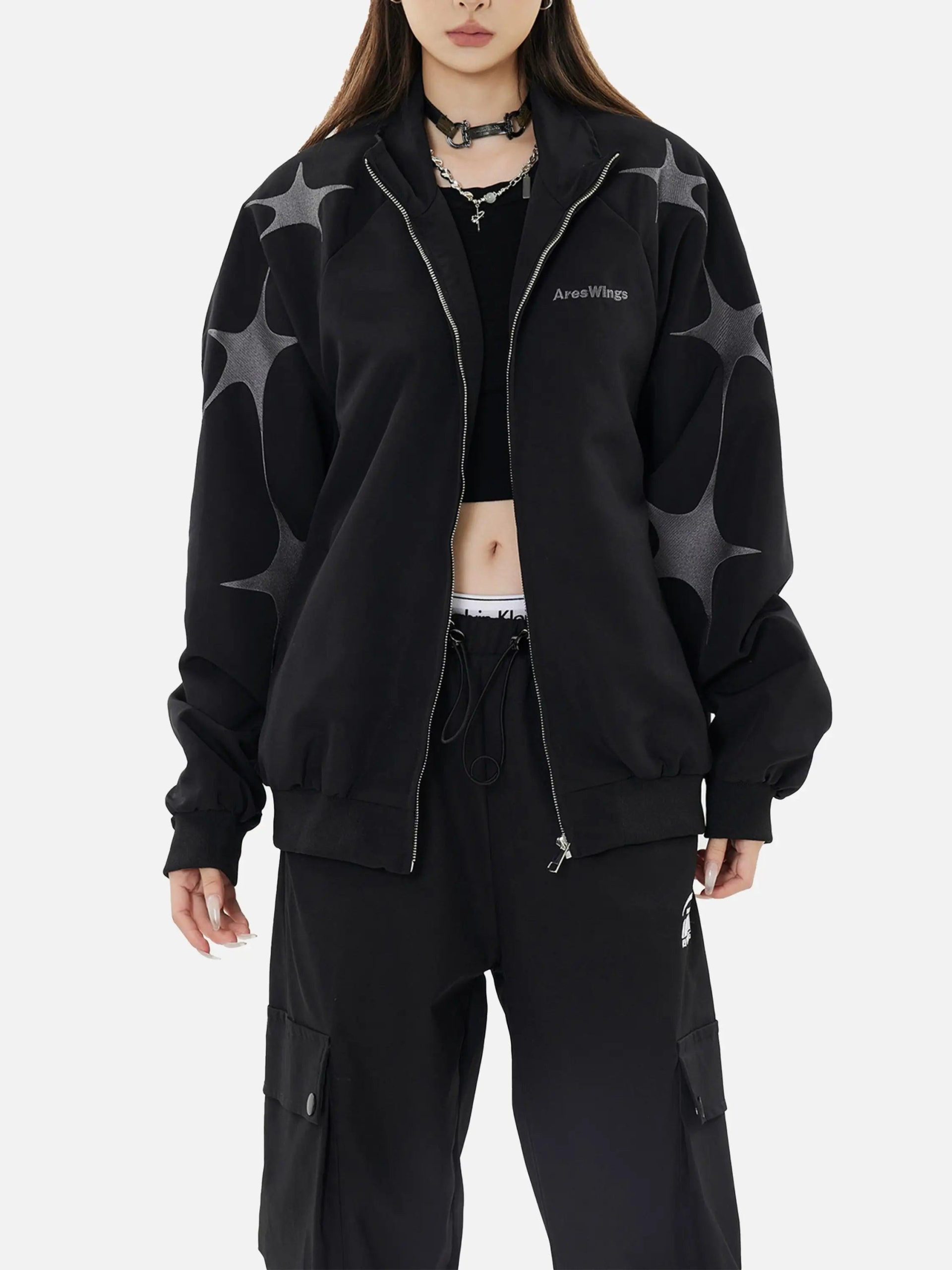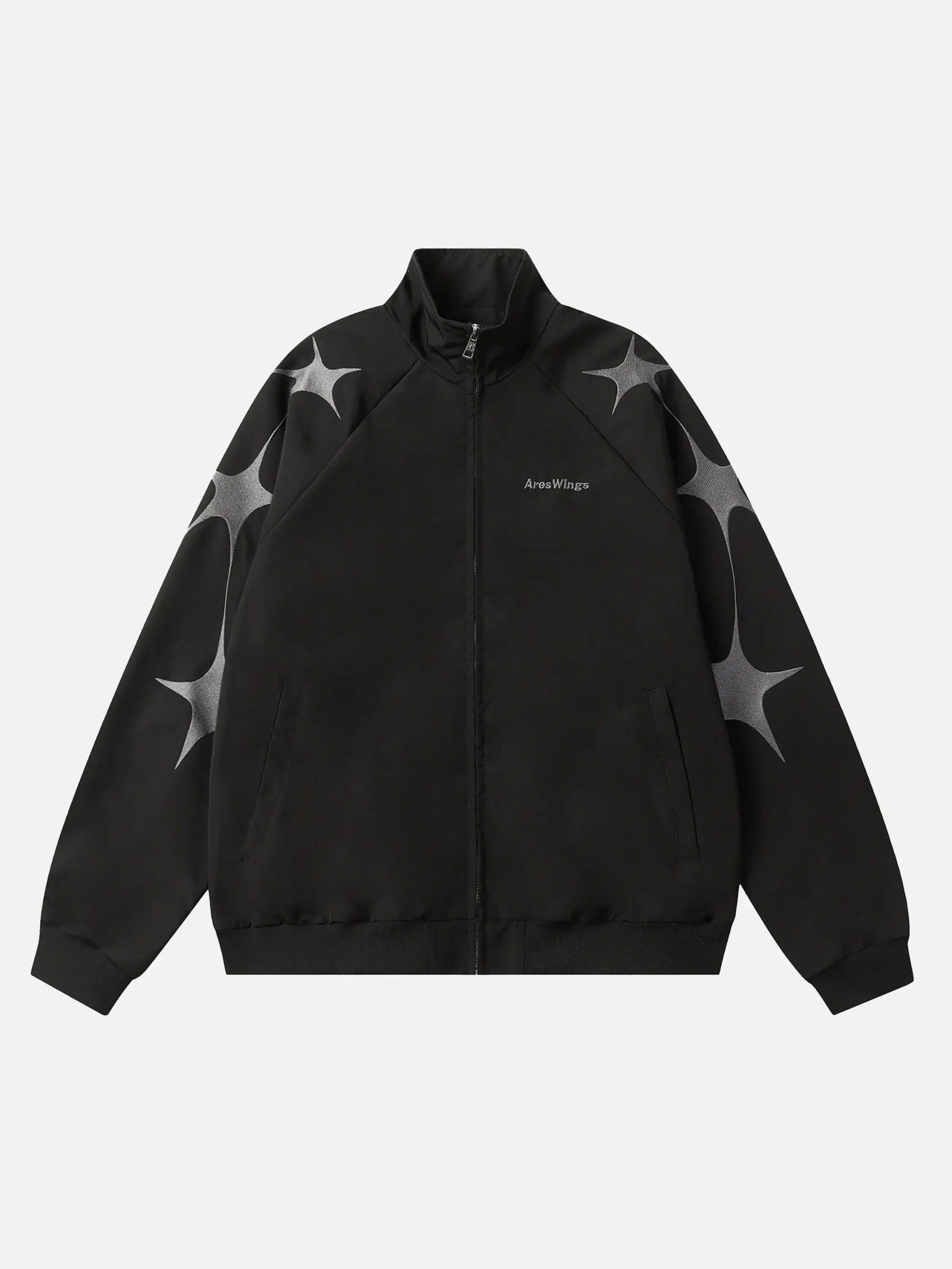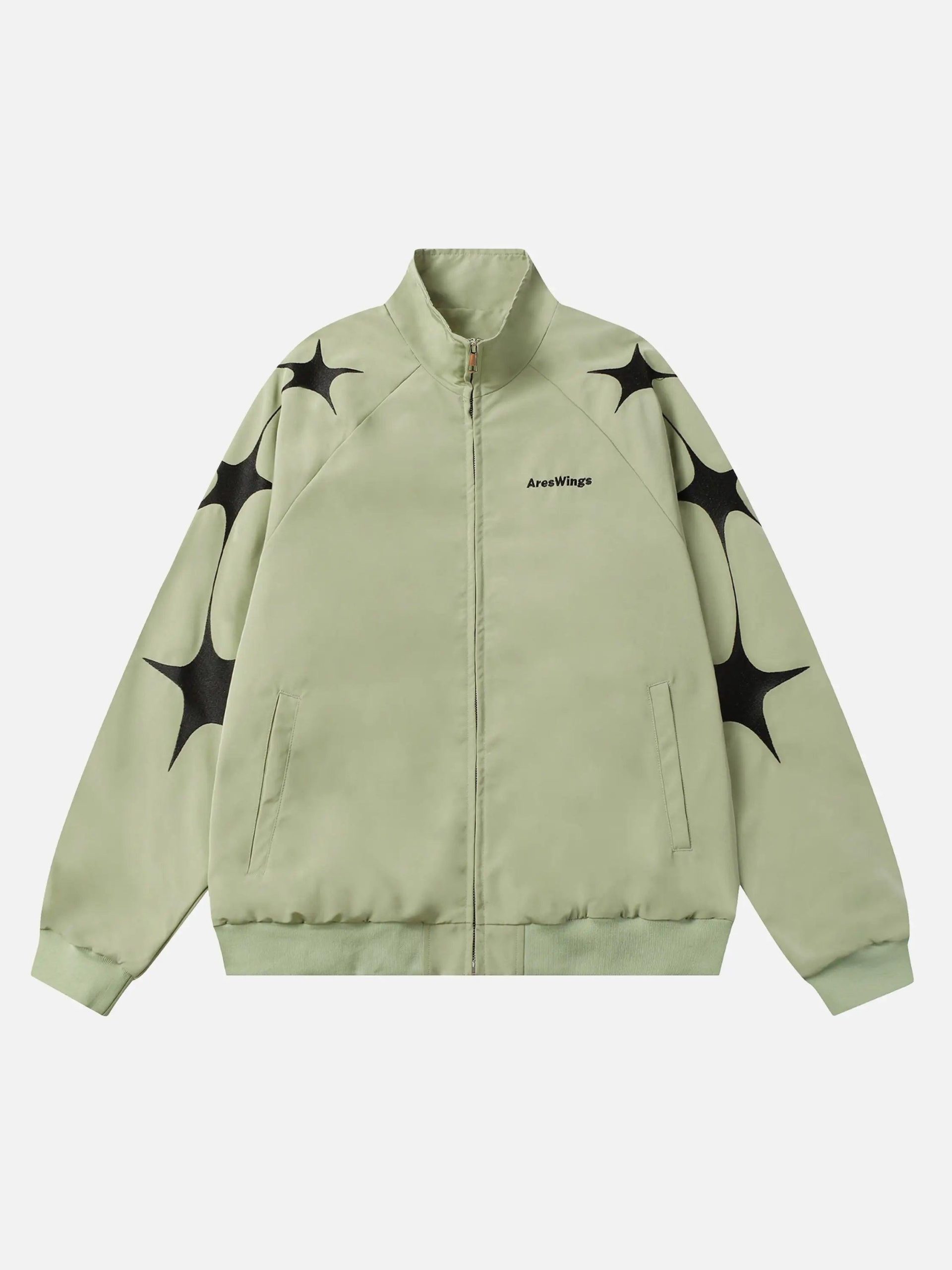 Break the mold with this striking jacket, where edgy design meets urban flair. Bold star motifs shine against the deep black backdrop, creating a visual symphony that’s both daring and sophisticated. The jacket’s sleek silhouette pairs seamlessly with your favorite streetwear fashion, offering a versatile fit available in M, L, and XL. Whether you choose the classic black or the vibrant green, each piece is crafted to provide comfort and style in equal measure. Zip up this standout piece and let your outfit do the talking.