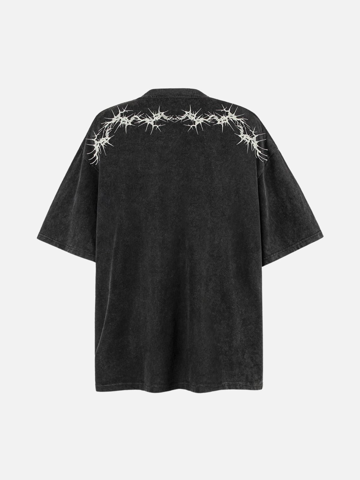 Embrace the raw edge of urban culture with this striking tee that merges bold design with a laid-back vibe. The deep black hue provides a perfect backdrop for the intricate thorn pattern that wraps around the shoulders, giving off a vibe that’s both edgy and sophisticated. Available in a range of sizes from M to 2XL, this piece is perfect for those who appreciate a relaxed fit with a touch of streetwise flair. Whether you’re pairing it with distressed jeans for a casual day out or layering it under a sleek jacket for a night on the town, this tee is your go-to for effortless summer style. Don’t let this piece slip through your fingers—add it to your collection and redefine your summer fashion.